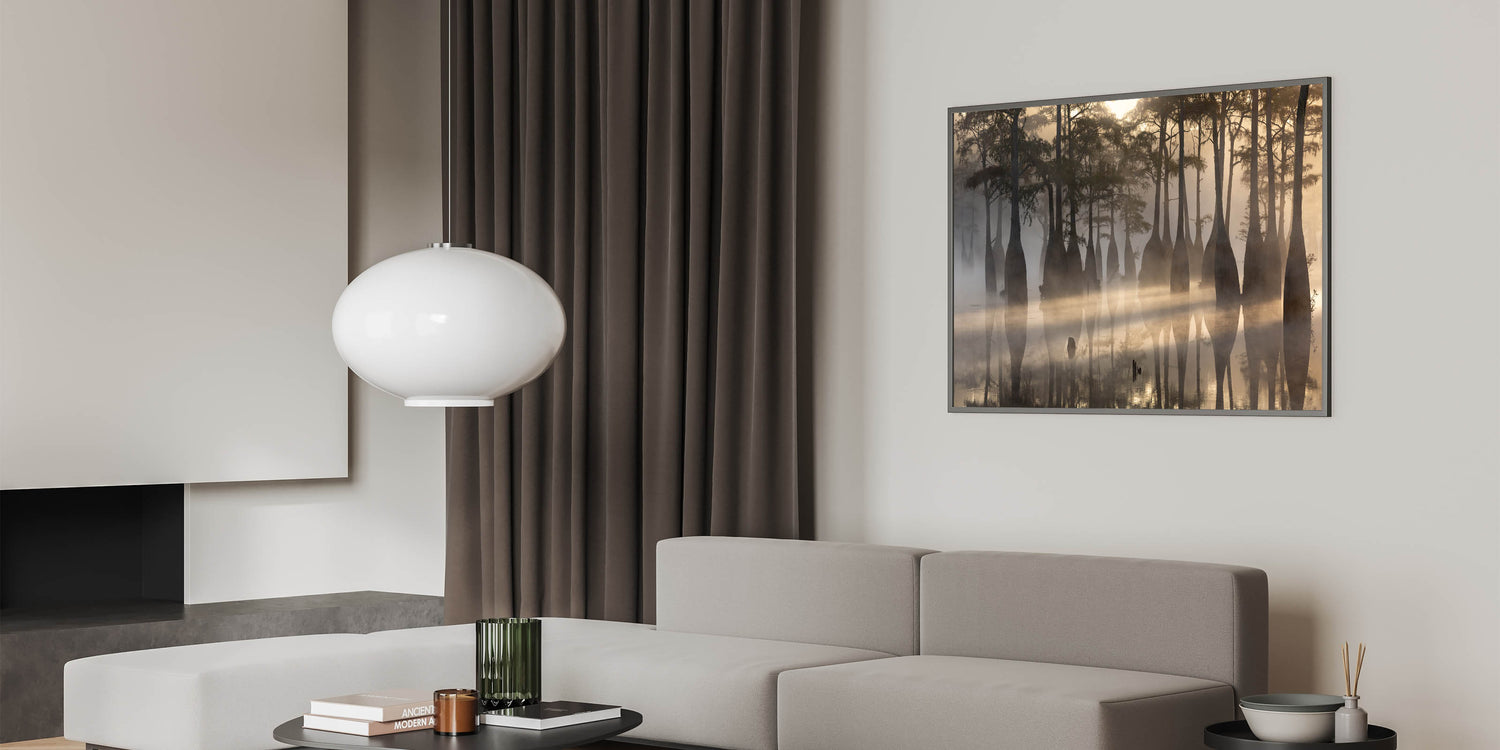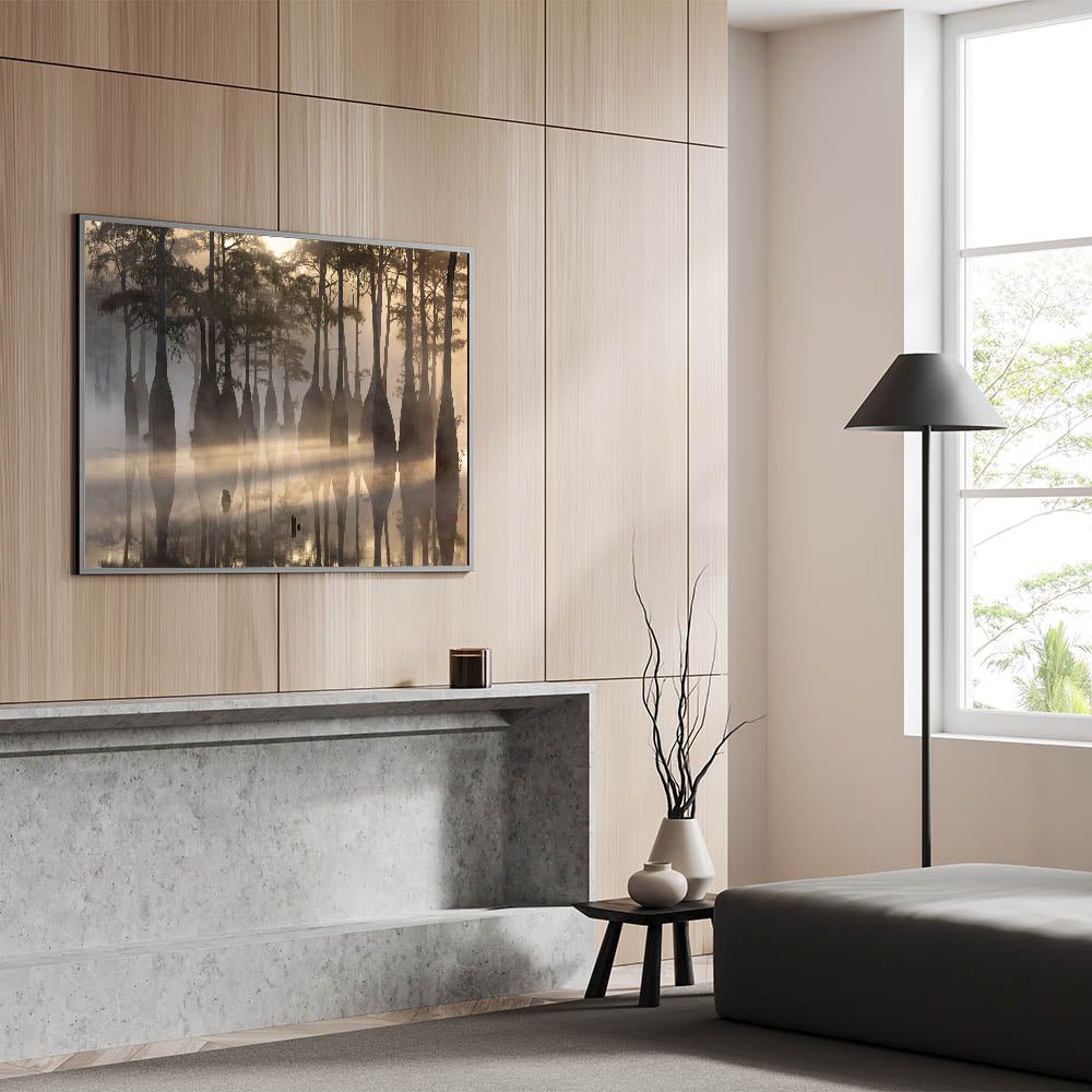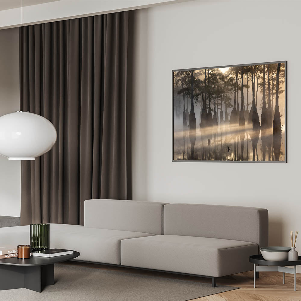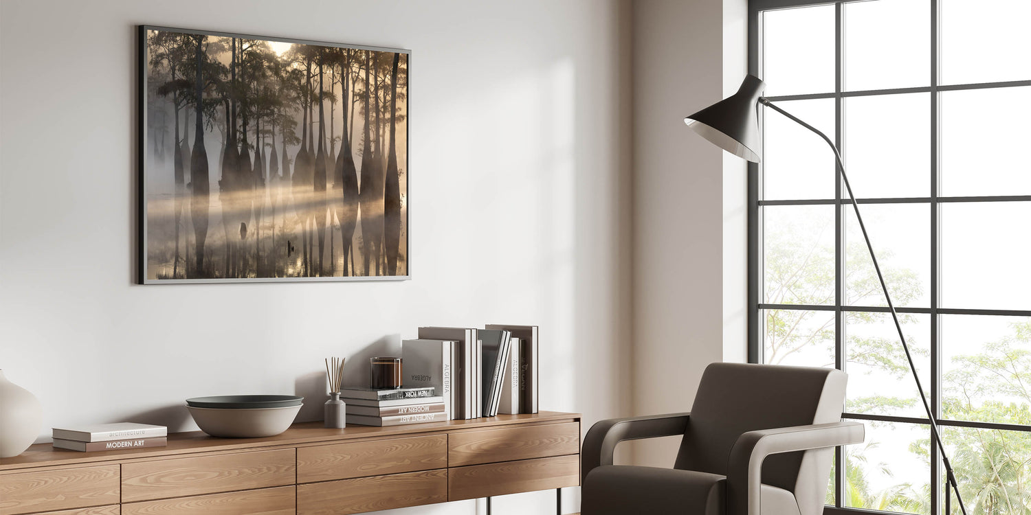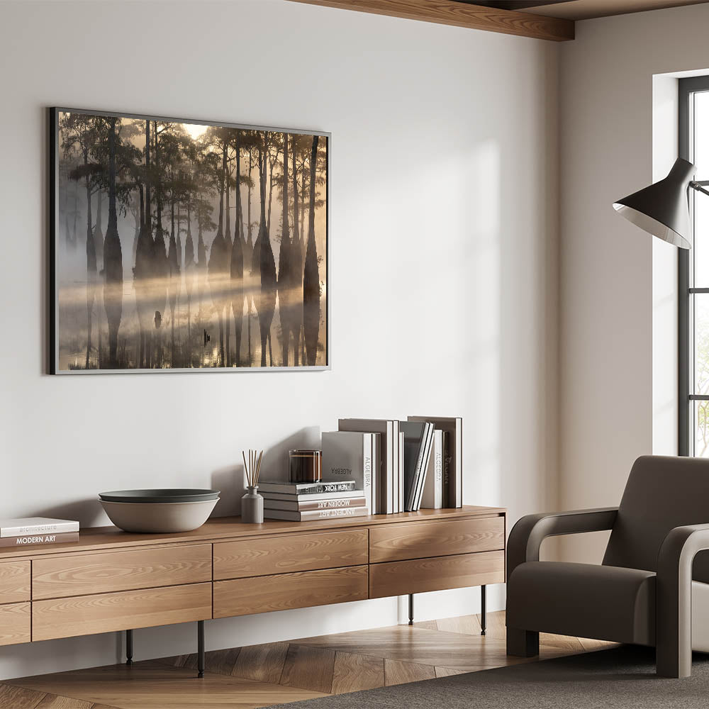 Transform your space with this stunning depiction of a misty cypress swamp, where the interplay of light and shadow creates a serene and reflective ambiance. This artwork is perfect for anyone looking to add a peaceful, nature-inspired element to their decor. Explore our collection of marsh and swamp wall art to find the perfect piece for your home.