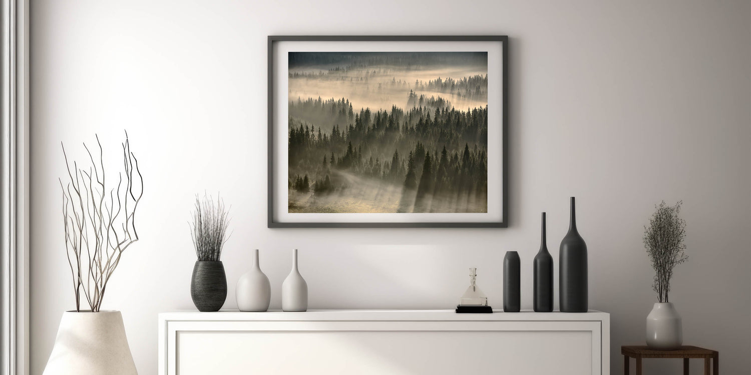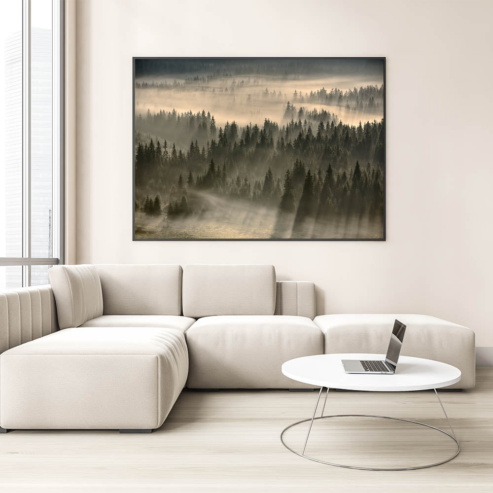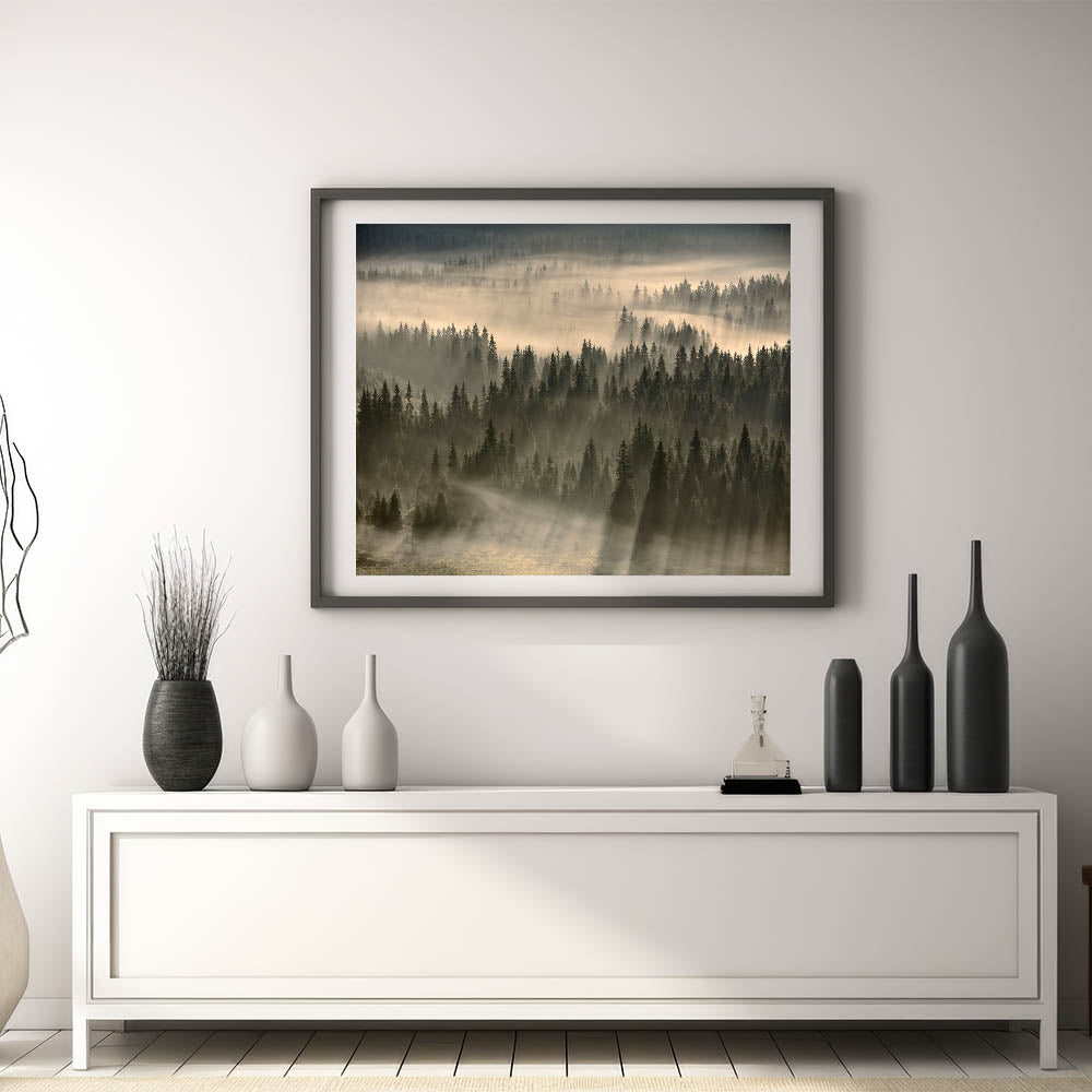 This misty forest print is perfect for those who appreciate the quiet beauty of nature and wish to create a serene, reflective space in their home.
