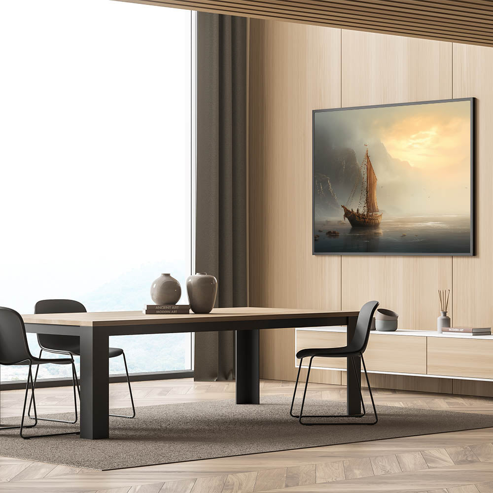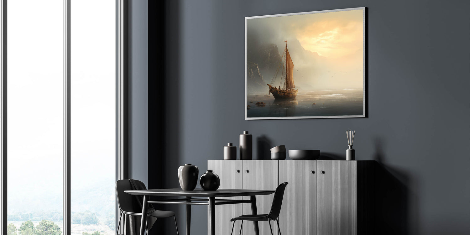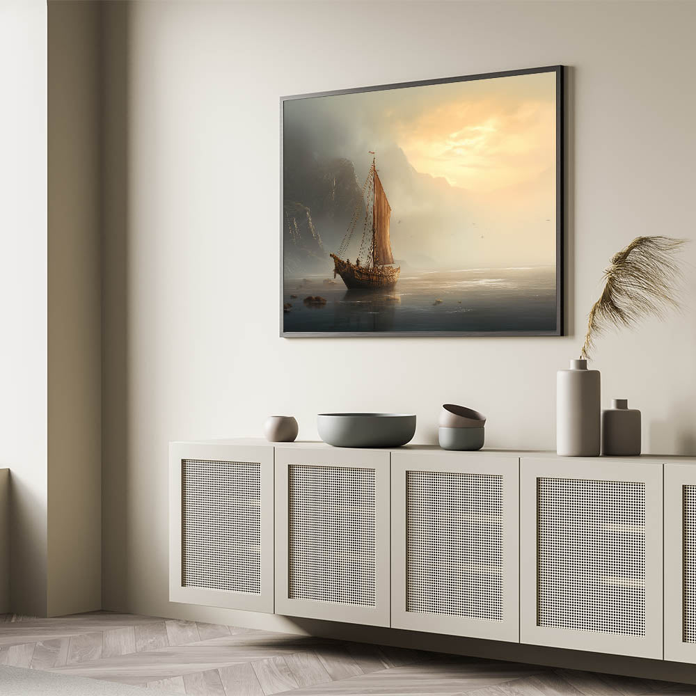 Embrace the serene beauty of a misty morning with the "Misty Morning Voyage" wall art. This captivating piece features a lone sailboat navigating through a tranquil body of water, shrouded in a soft morning fog. The gentle tones of the mist, combined with the silhouette of the boat against the rising sun, create a peaceful and contemplative scene that adds a touch of calm to any room.