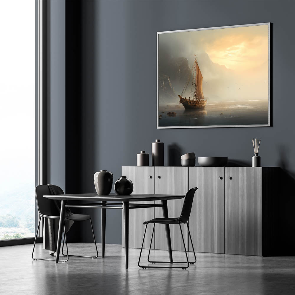 Whether you're looking to enhance your home with a sense of tranquility or simply appreciate the quiet beauty of the sea, the "Misty Morning Voyage" wall art is a perfect addition to your decor collection. Let the gentle calm of a foggy morning soothe your space.
