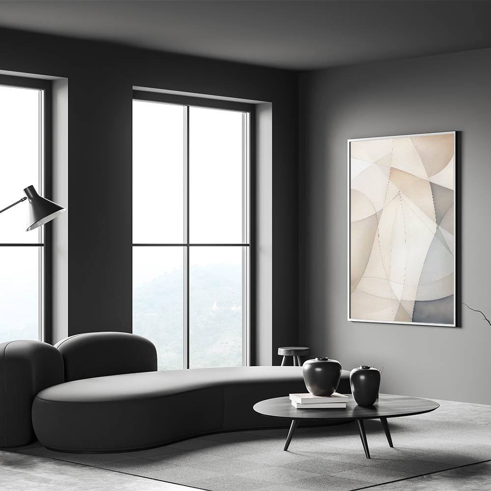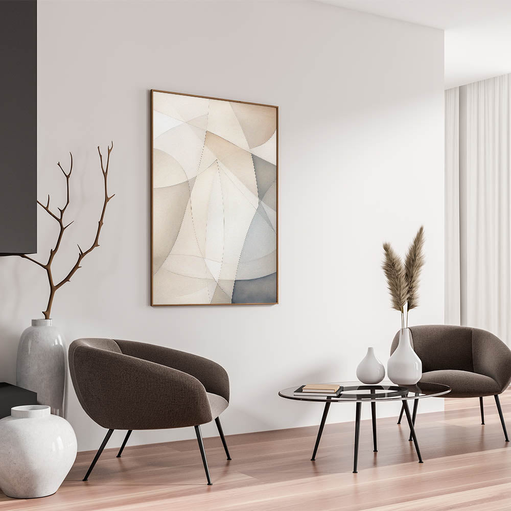 Infuse your living space with the modern elegance of this Abstract Geometric Art piece. This minimalist design features a harmonious blend of neutral tones, with fluid geometric shapes that create a balanced and sophisticated visual experience. The interplay of soft greys, beiges, and muted browns adds depth and character, making this artwork a perfect addition to any contemporary interior.