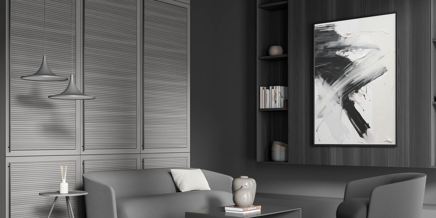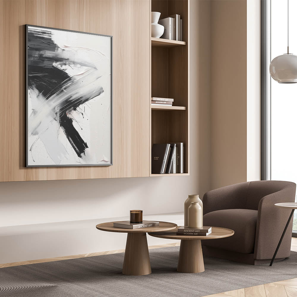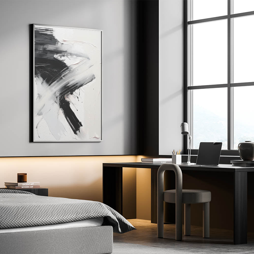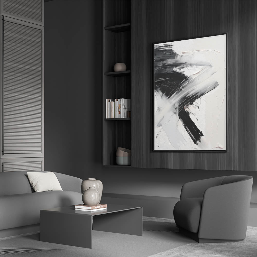 Add a bold statement to your decor with this dynamic piece of modern abstract wall art. Featuring a striking contrast of black and white, this artwork combines fluid brushstrokes with textured elements to create a sense of movement and energy. The minimalist yet impactful design makes it a perfect centerpiece for contemporary and modern interiors, effortlessly enhancing the visual appeal of any space.