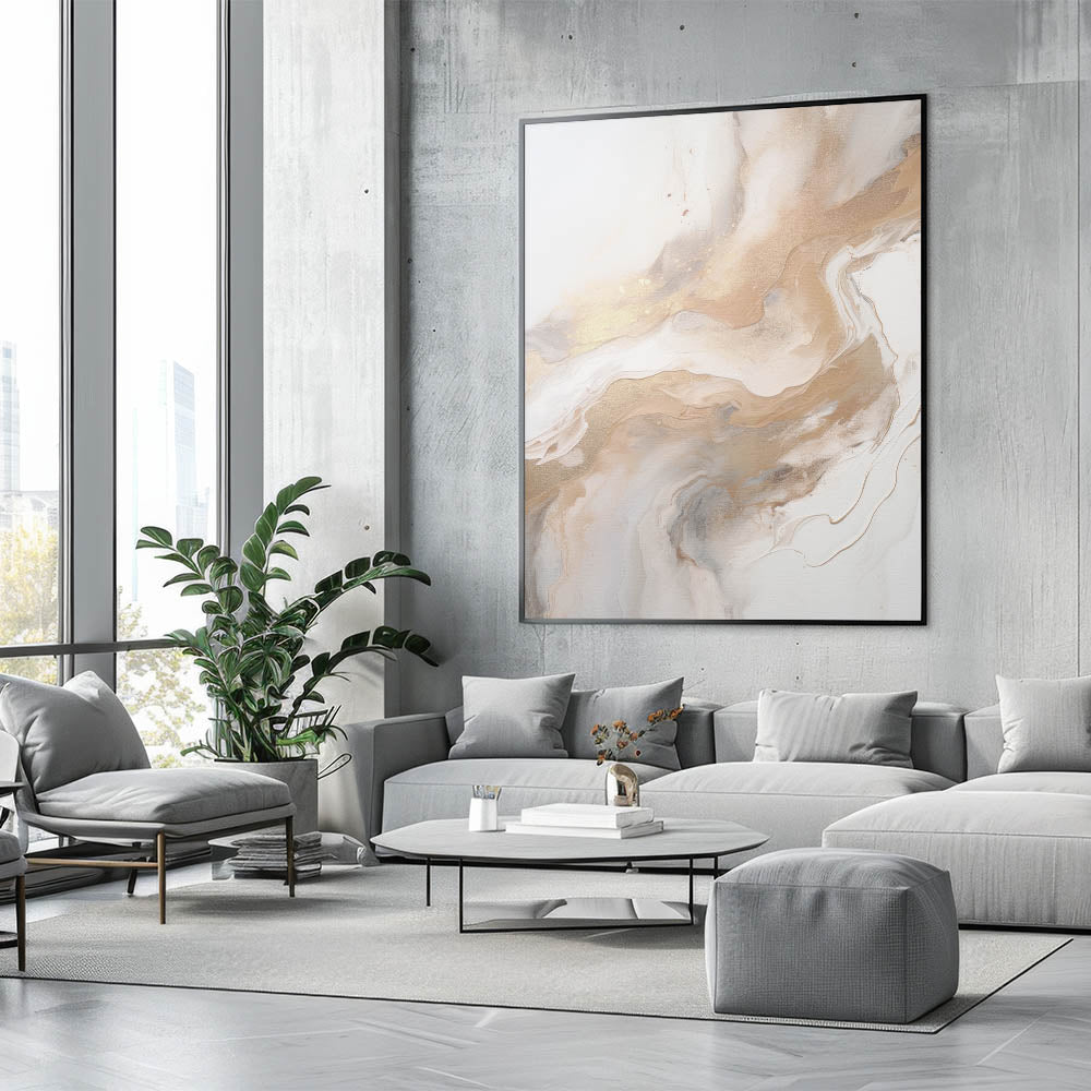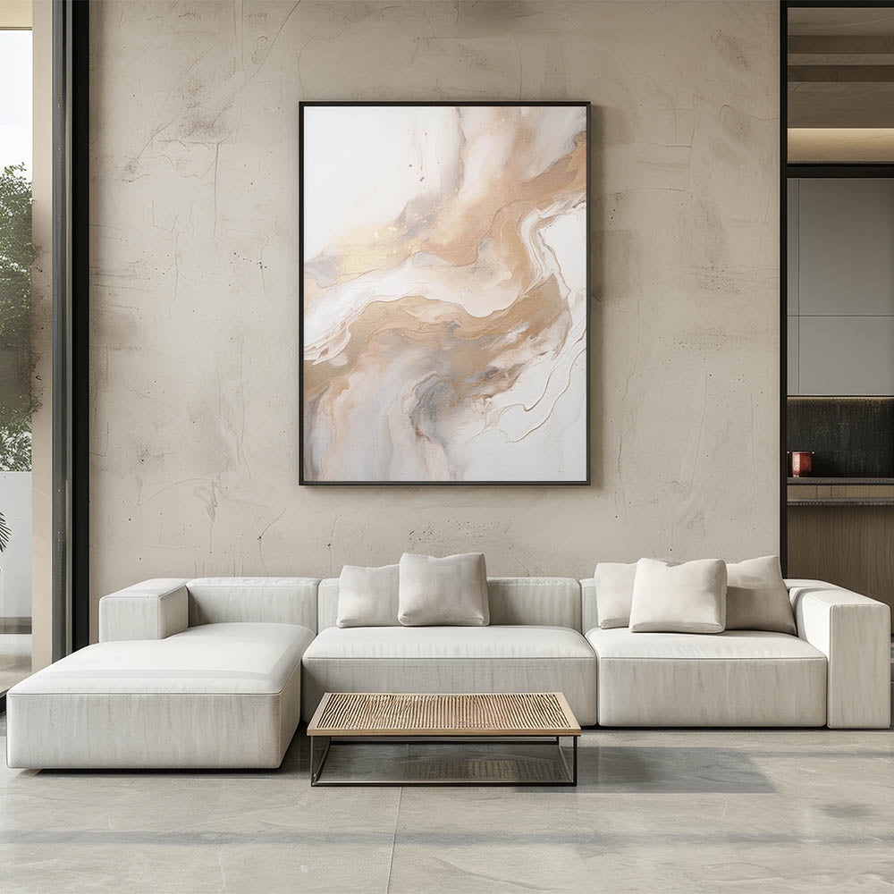 Introduce a touch of luxury to your space with this stunning piece of modern abstract wall art, featuring a flowing marble design in warm gold and beige tones. The delicate interplay of metallic gold, soft beiges, and creamy whites creates a sophisticated and elegant atmosphere, perfect for enhancing the aesthetic of any room.