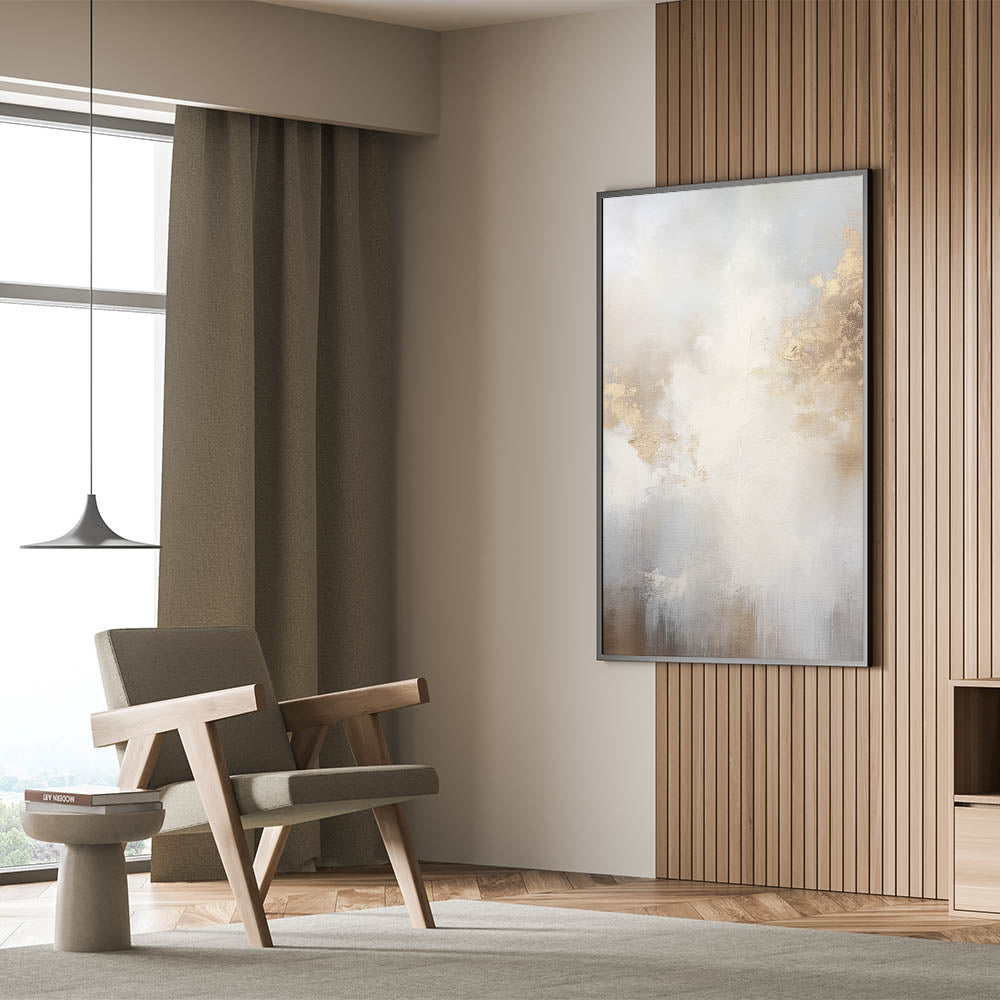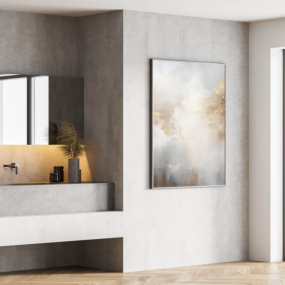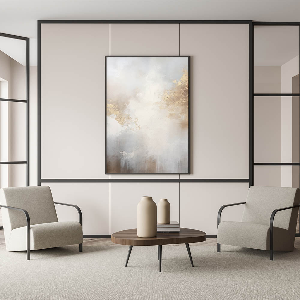 Add a touch of serenity to your home with this modern abstract wall art, featuring soft gold and beige blended textures. The delicate layering of warm metallics with subtle beige and cream tones creates a peaceful and elegant atmosphere, making it an ideal piece for any contemporary living space.