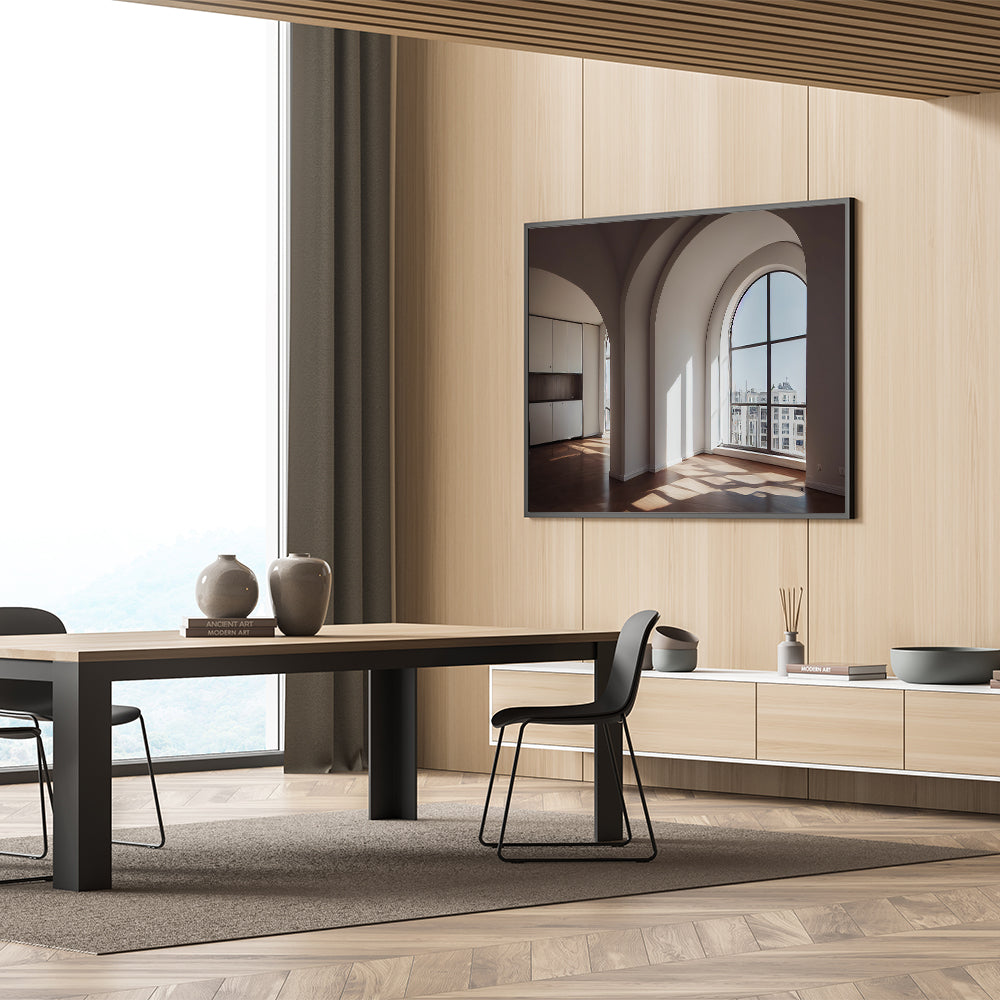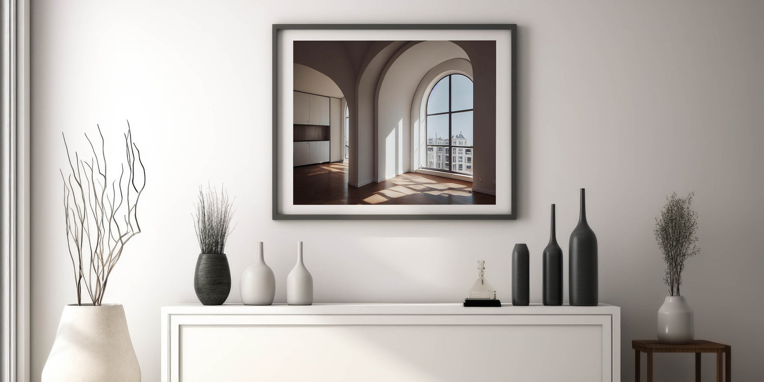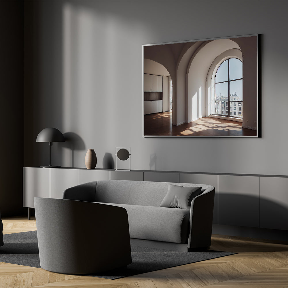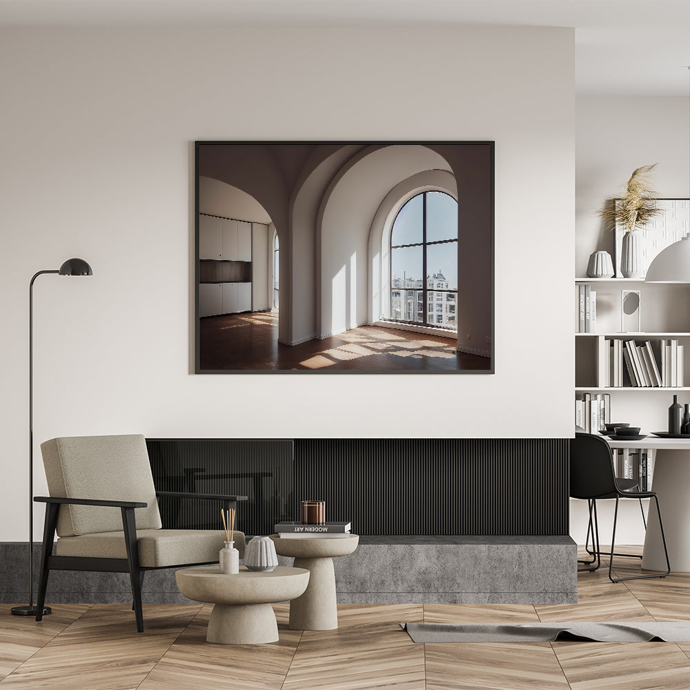 Bring a touch of modern elegance to your decor with this minimalist wall art featuring sleek arch windows bathed in natural light. The clean lines and soft curves of the arches create a serene and sophisticated atmosphere, making this artwork a perfect addition to contemporary spaces. The interplay of light and shadow adds depth and dimension, enhancing the minimalist aesthetic and creating a calm, inviting environment.