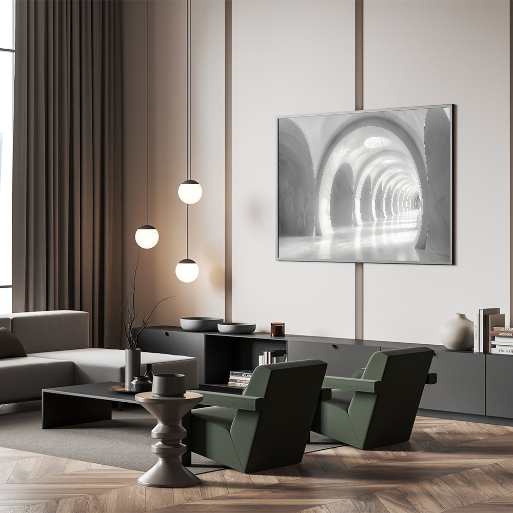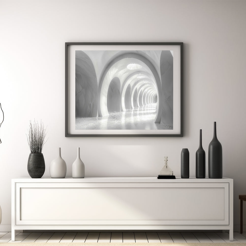 Immerse your space in the sleek, contemporary elegance of this minimalist arches wall art. This artwork features a series of smooth, white arches forming a visually striking, abstract corridor. The flowing curves and clean lines create a sense of infinite depth and modern sophistication, perfect for those who appreciate a minimalist aesthetic. The all-white design enhances the sense of light and space, making this piece an ideal addition to modern interiors.
