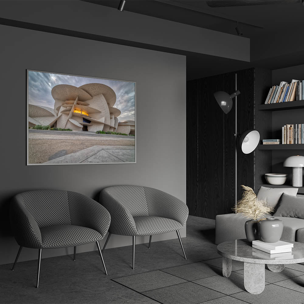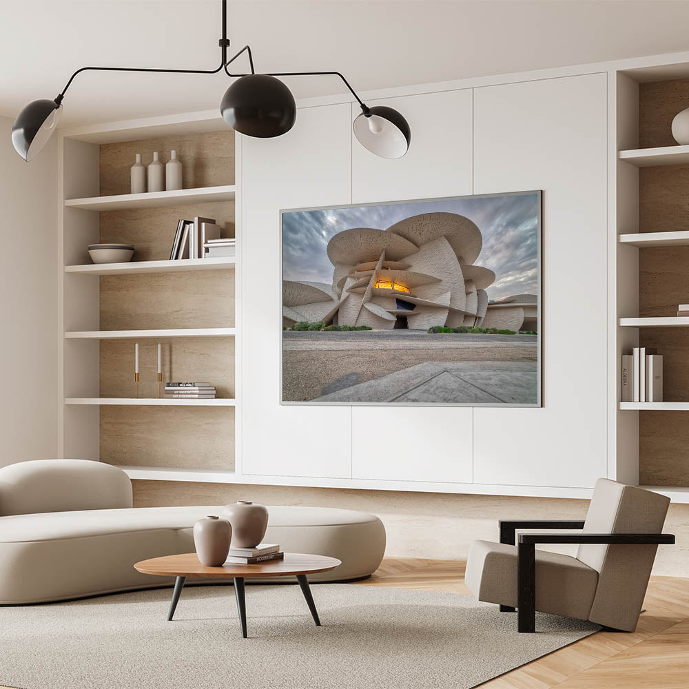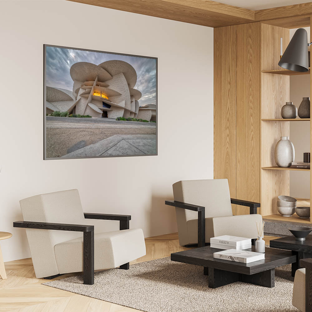 Showcase the cutting-edge architecture of Qatar with our "Modern Architecture Qatar - Iconic Building Canvas Print." This artwork captures the dynamic and innovative design of one of Qatar’s most distinctive buildings, characterized by its unique, flowing form and intricate textures.