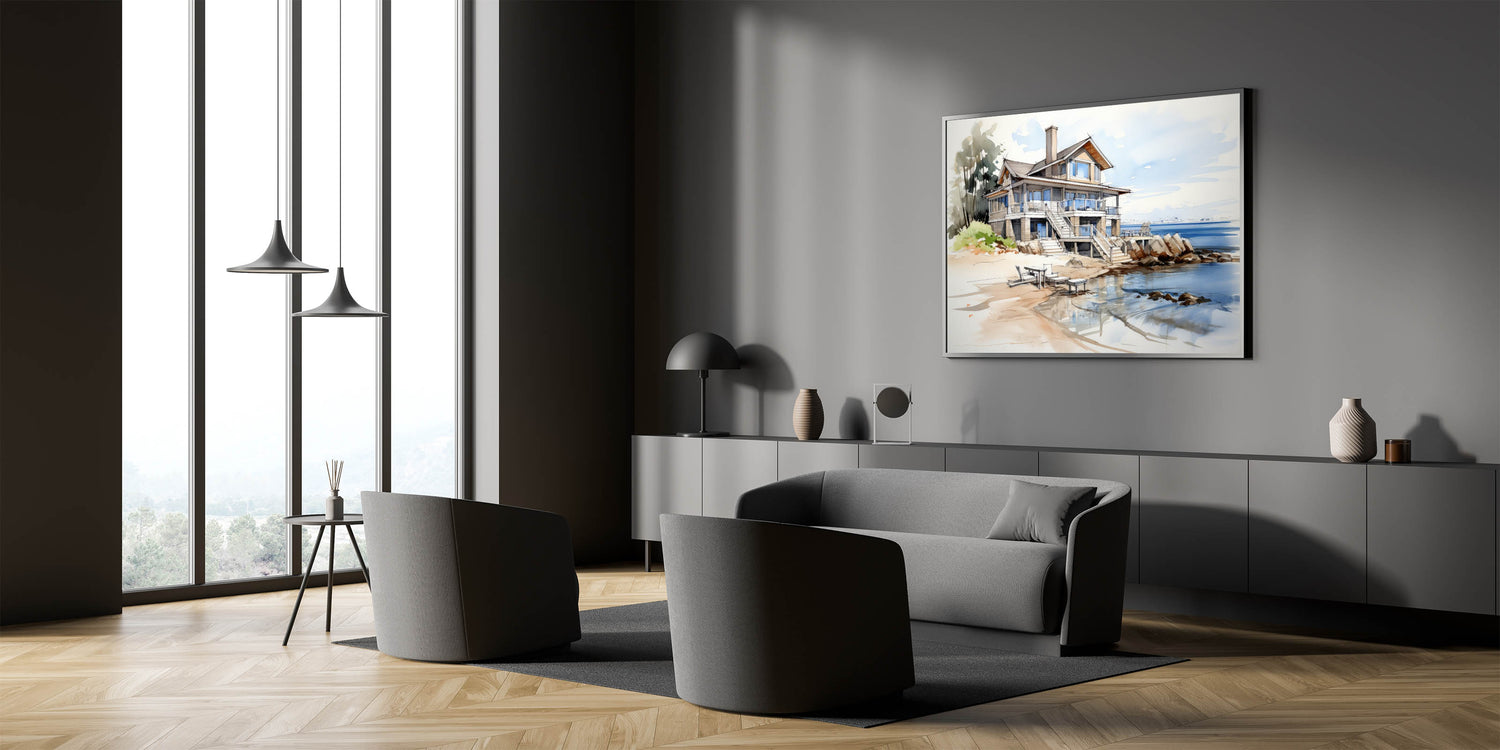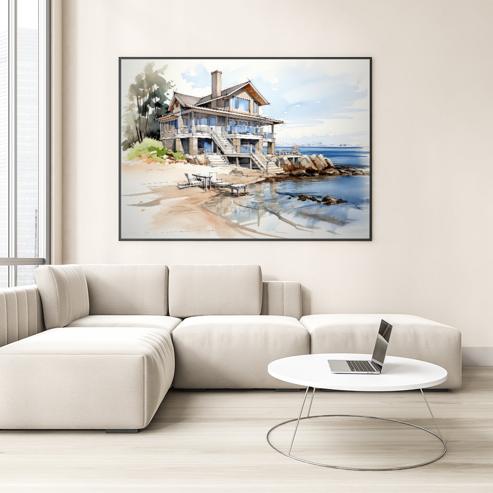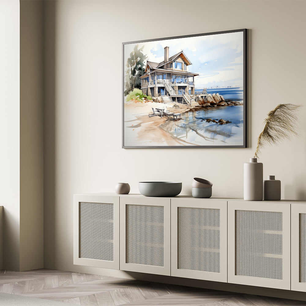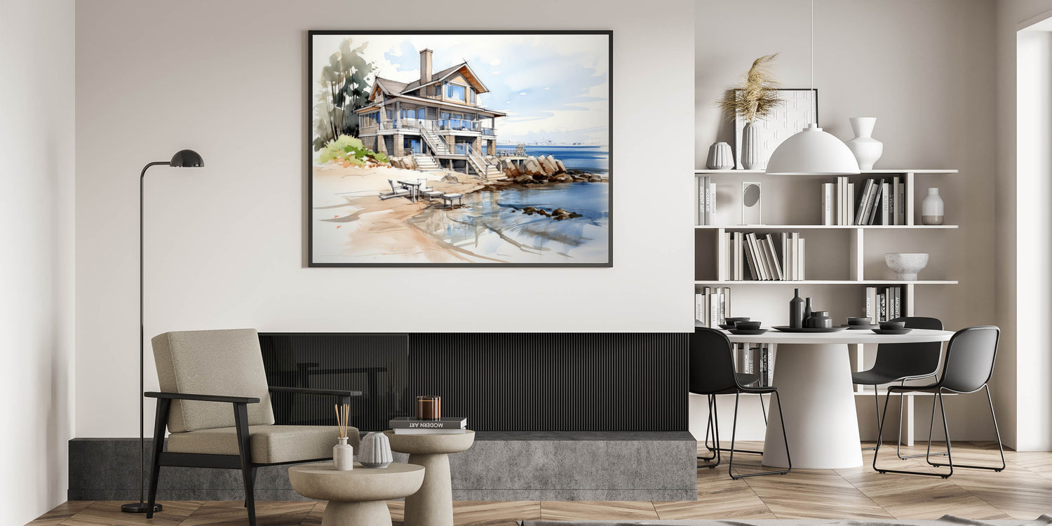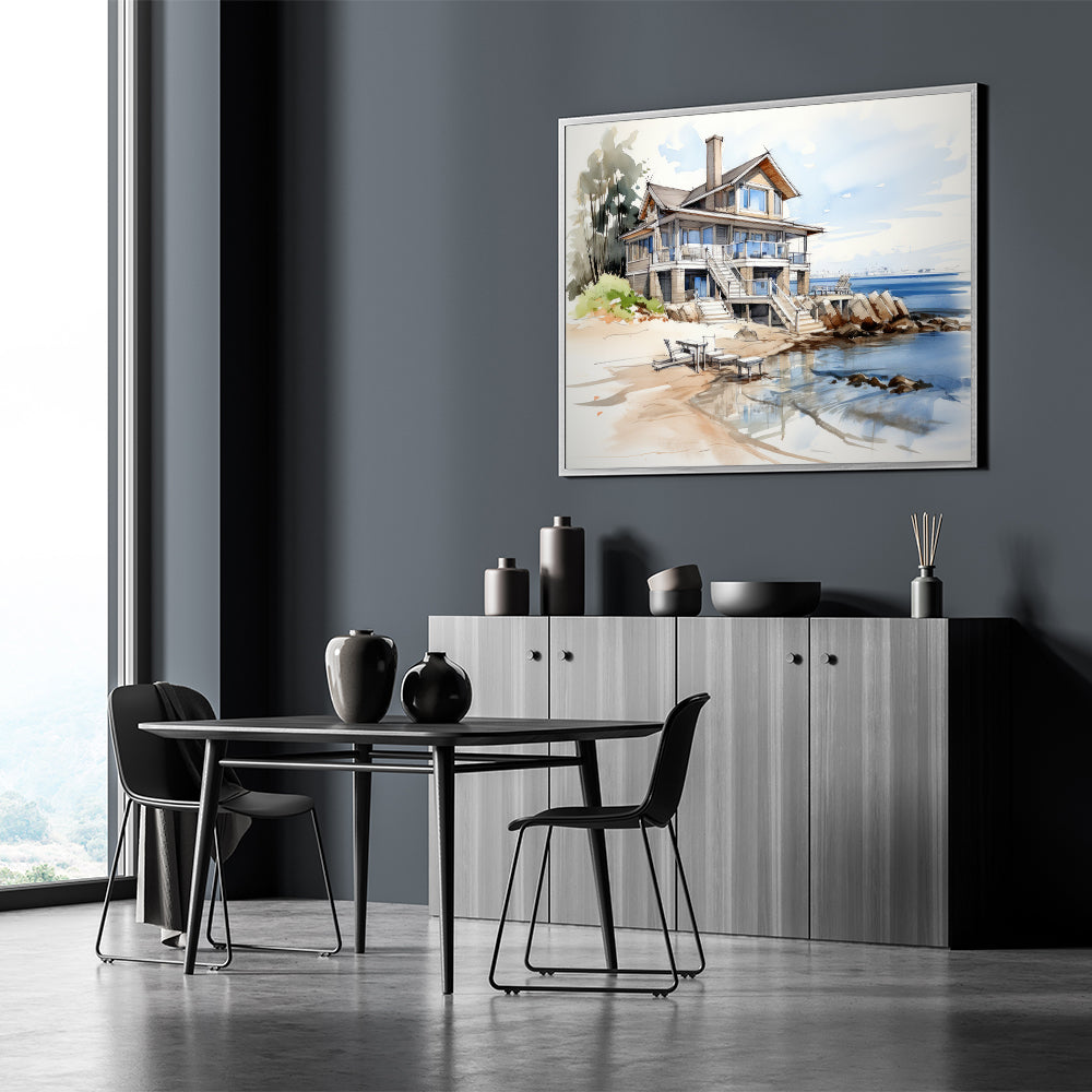 Bring a touch of modern elegance to your home with this stunning Modern Coastal Cottage Wall Art. This piece features a beautifully designed contemporary cottage, perfectly situated by the serene coast. The artwork captures the sleek architectural lines and large windows that invite in the tranquil views of the ocean, making it a must-have for those who appreciate both modern design and coastal living.