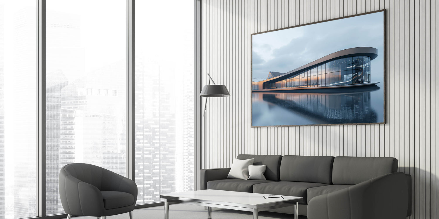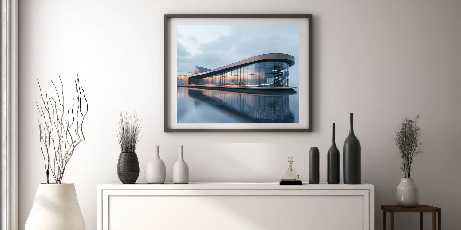 Transform your space with the sleek elegance of this modern glass pavilion wall art. The artwork captures the stunning reflections of a contemporary architectural marvel, set against a serene body of water. The clean lines and expansive glass surfaces of the pavilion create a harmonious balance between built and natural environments, making this piece a perfect addition to spaces that value simplicity and modern design.