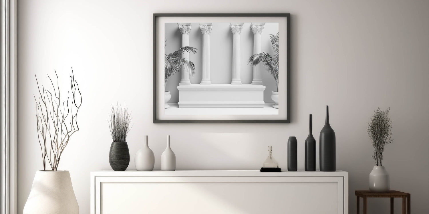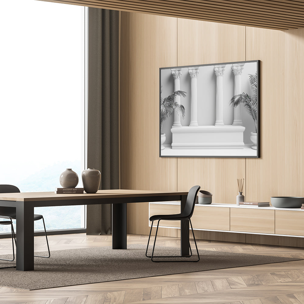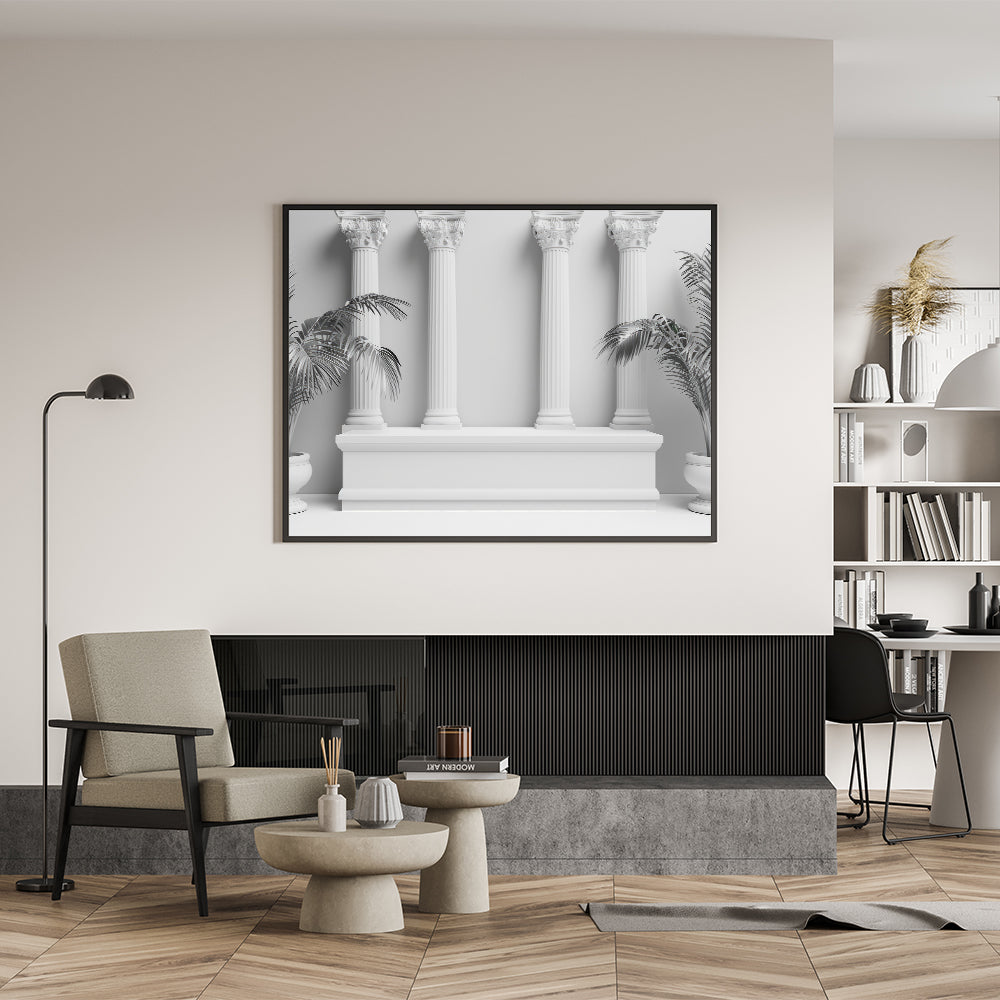 Enhance your decor with the sophisticated elegance of this "Modern Monochrome Columns Art." This minimalist piece merges classical architectural design with contemporary aesthetics, featuring four Corinthian columns set against a clean, monochromatic backdrop. The potted palm plants on either side add a touch of nature, perfectly balancing the classical and modern elements of this artwork.