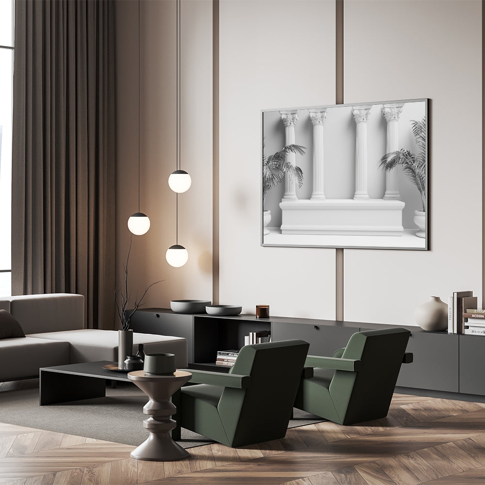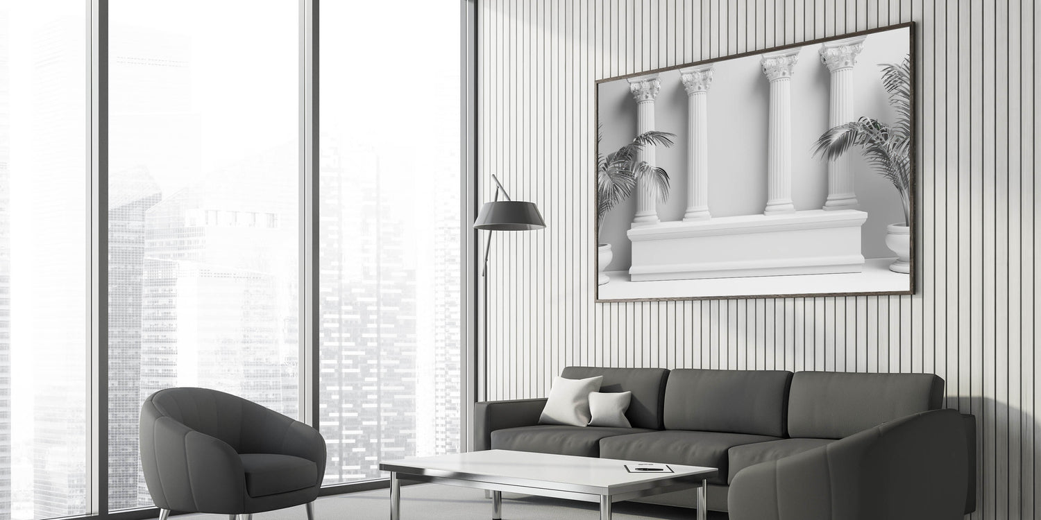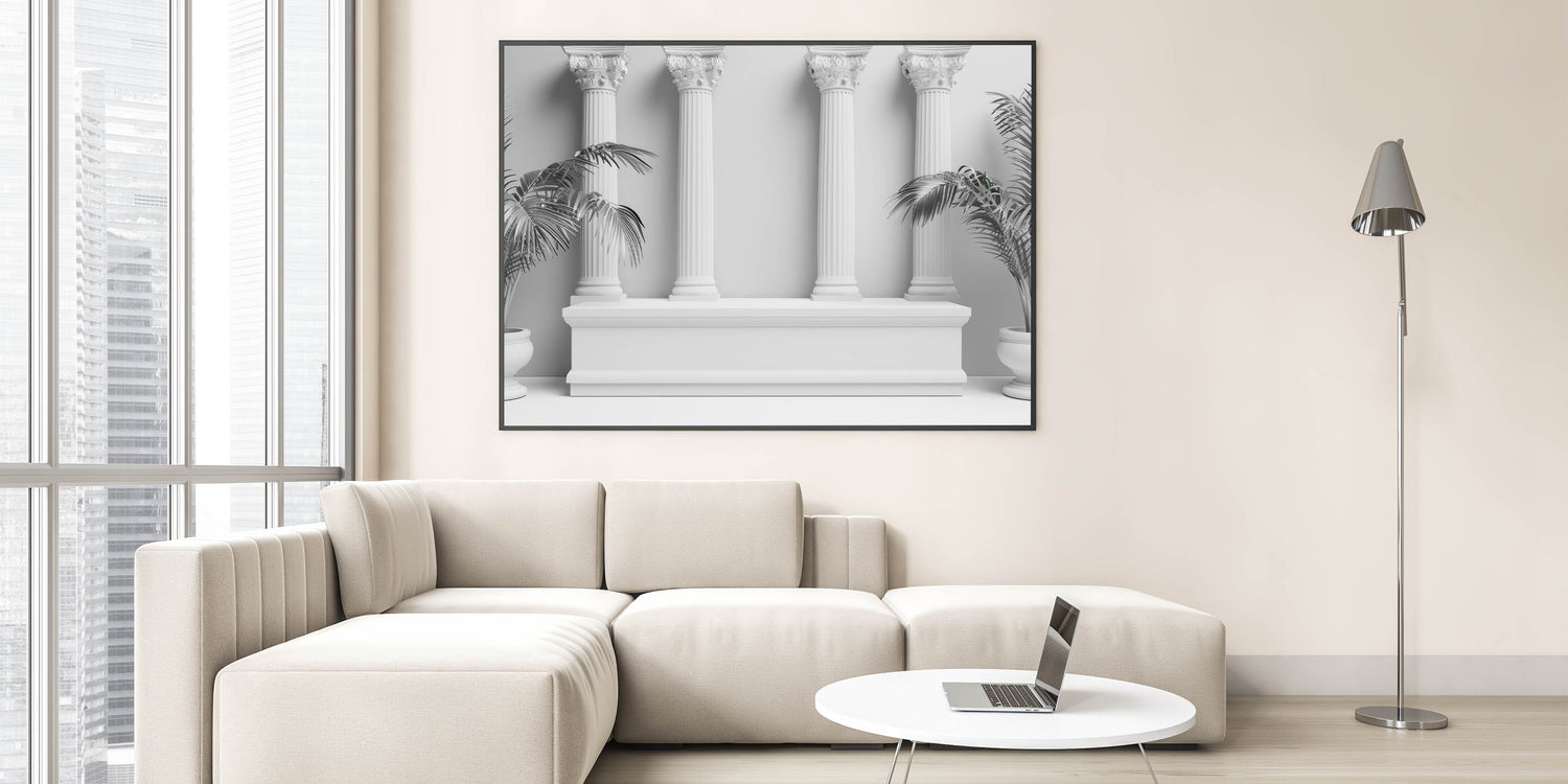 Enhance your decor with the sophisticated elegance of this "Modern Monochrome Columns Art." This minimalist piece merges classical architectural design with contemporary aesthetics, featuring four Corinthian columns set against a clean, monochromatic backdrop. The potted palm plants on either side add a touch of nature, perfectly balancing the classical and modern elements of this artwork.