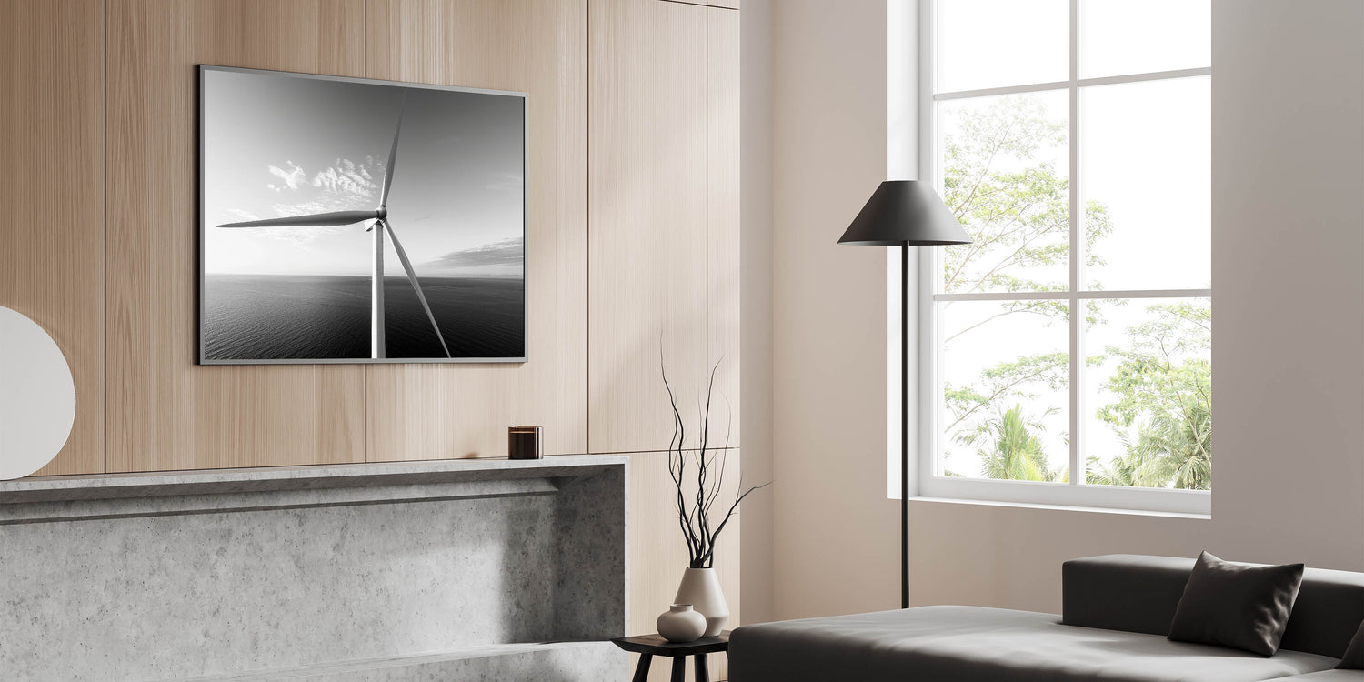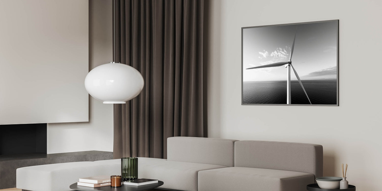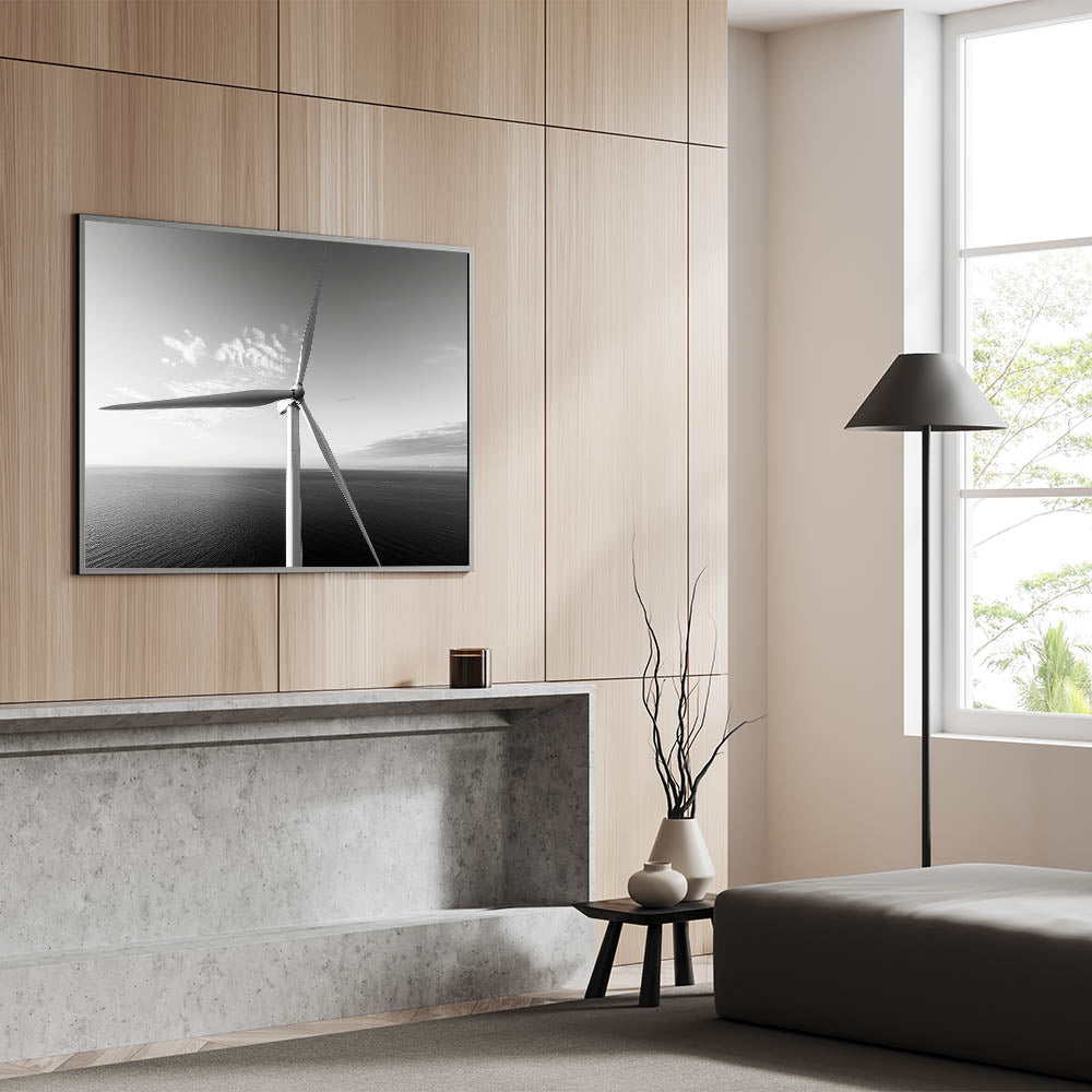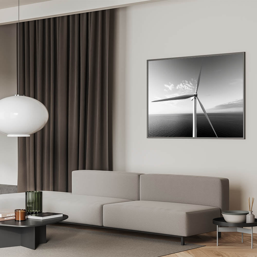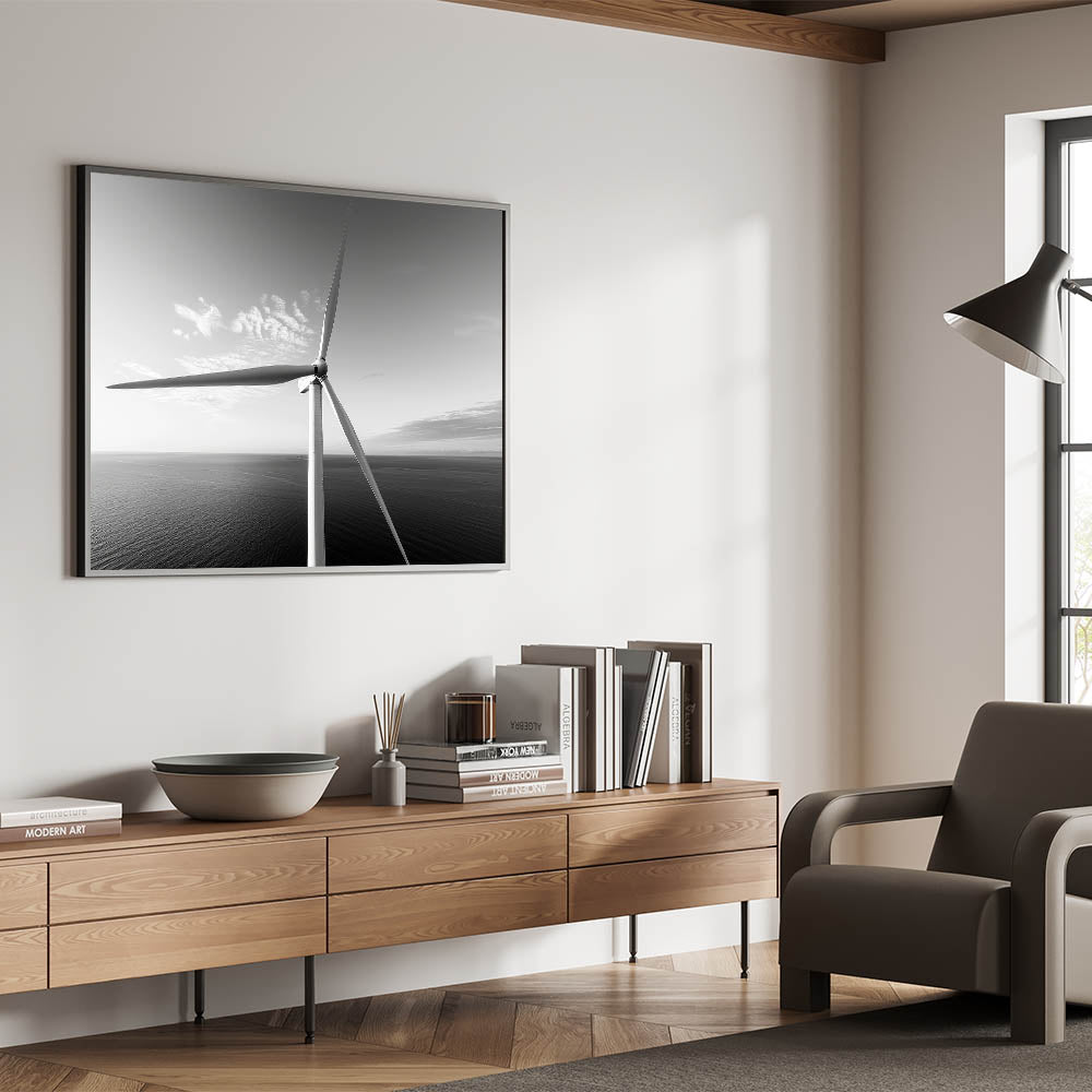 Celebrate the elegance of modern engineering with this striking black and white wind turbine wall art. Set against the vast expanse of the ocean, the sleek lines of the turbine blades create a sense of motion and energy, perfectly capturing the fusion of nature and technology. This artwork is ideal for those who appreciate minimalist design and contemporary aesthetics.