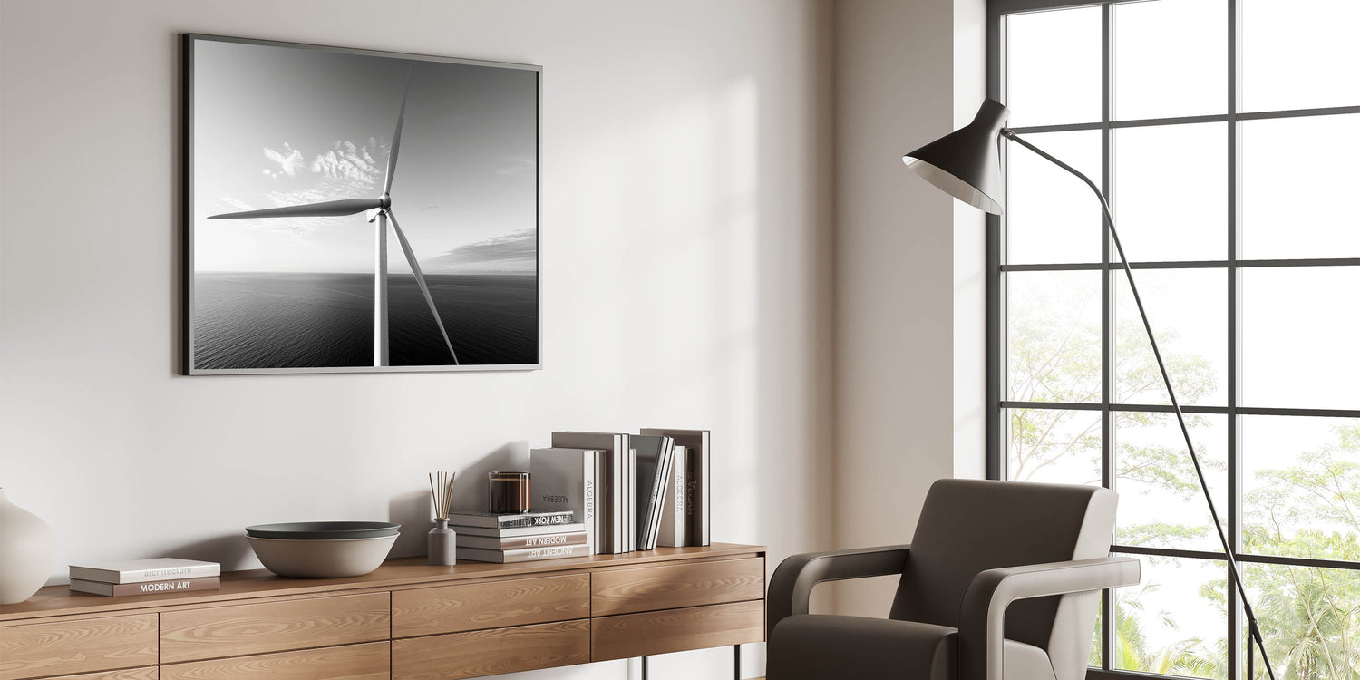 This black and white wind turbine art print is perfect for those who love contemporary, minimalist decor. Whether displayed in a modern home or a professional office, this piece brings a sense of calm and forward-thinking design to any space.