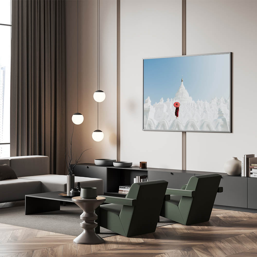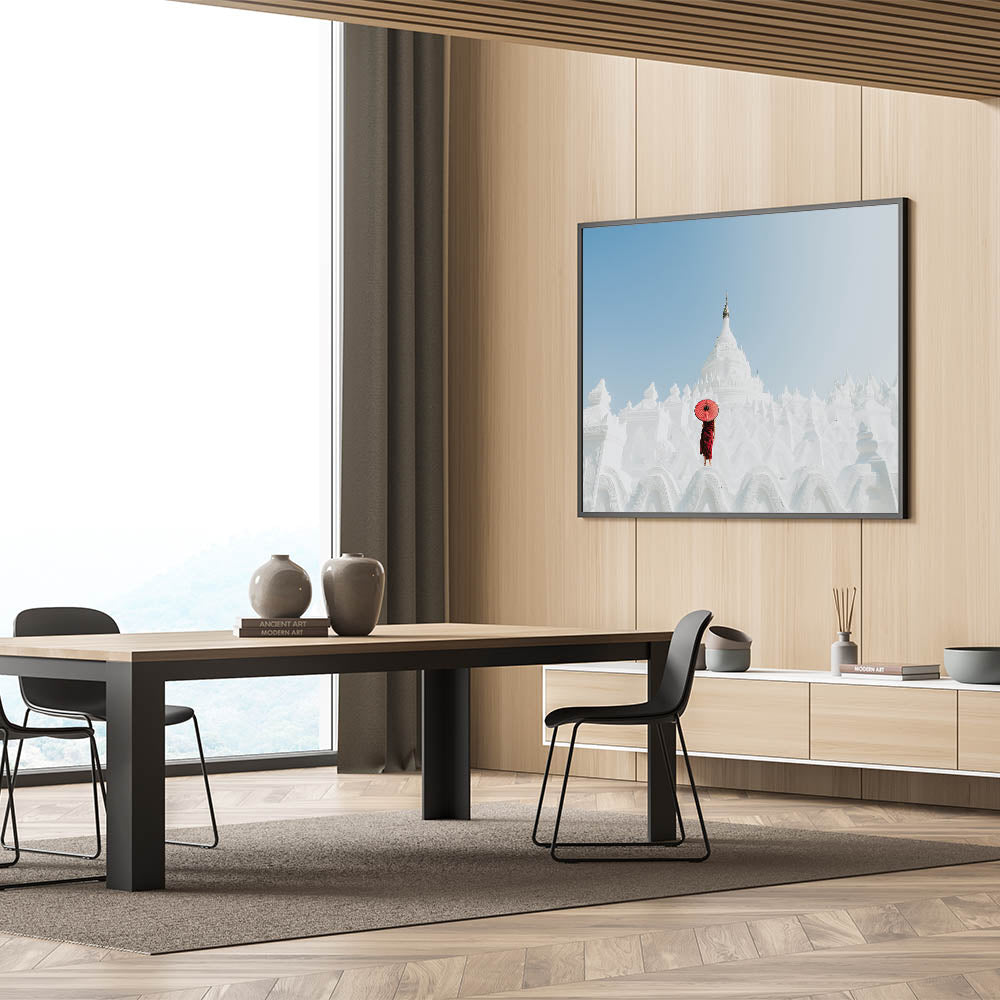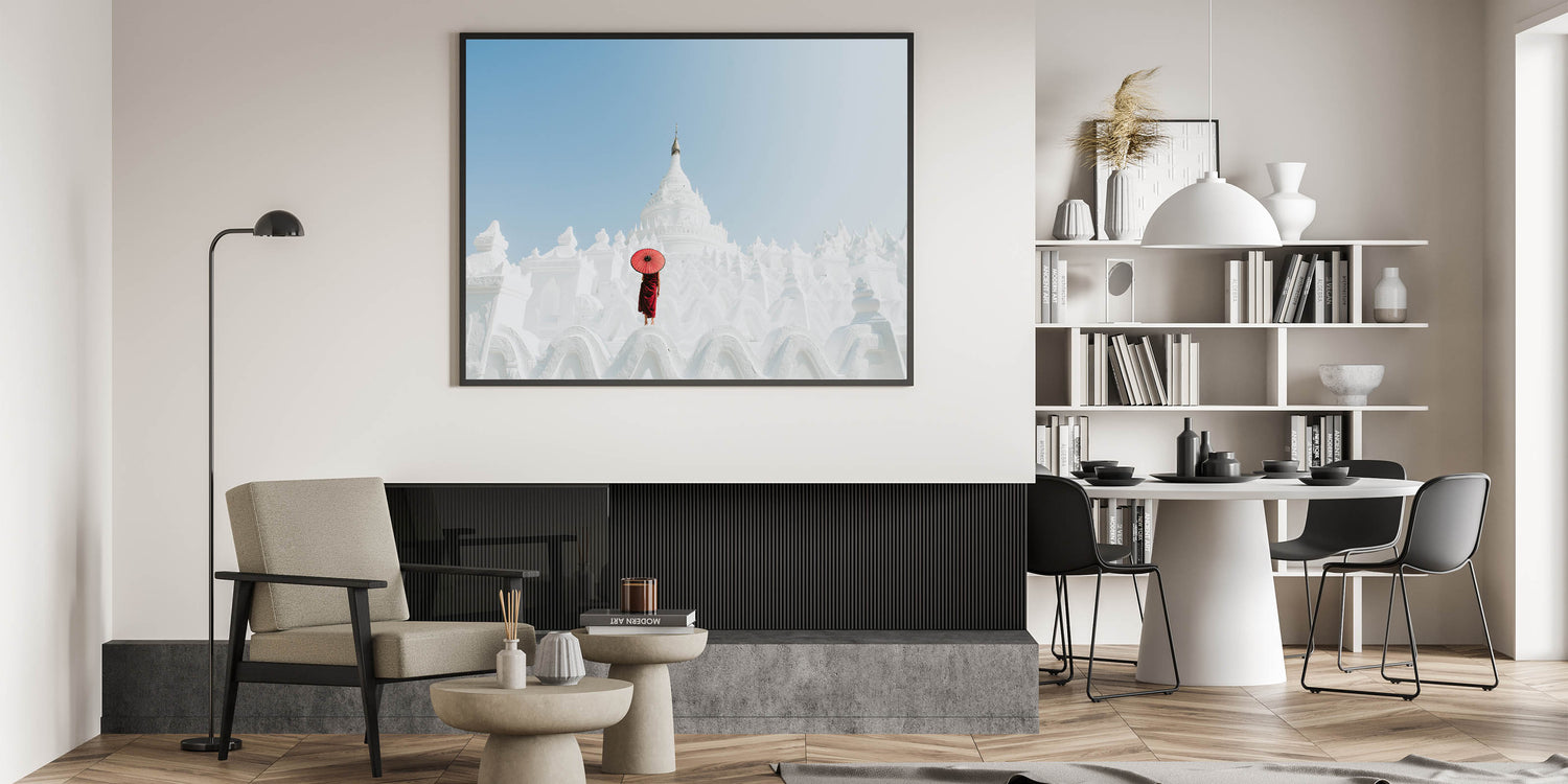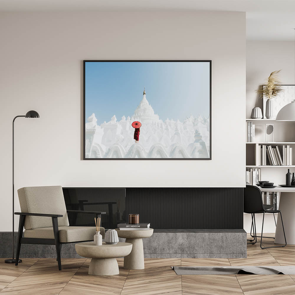 This stunning wall art showcases a striking minimalist scene of a monk holding a red umbrella, standing on the ornate white structures of the Hsinbyume Pagoda in Myanmar. The sharp contrast between the brilliant white temple and the vibrant red of the umbrella creates a visually captivating and serene atmosphere. The simplicity of the image reflects a sense of mindfulness and calm, perfect for those looking to bring tranquility and cultural beauty into their space.