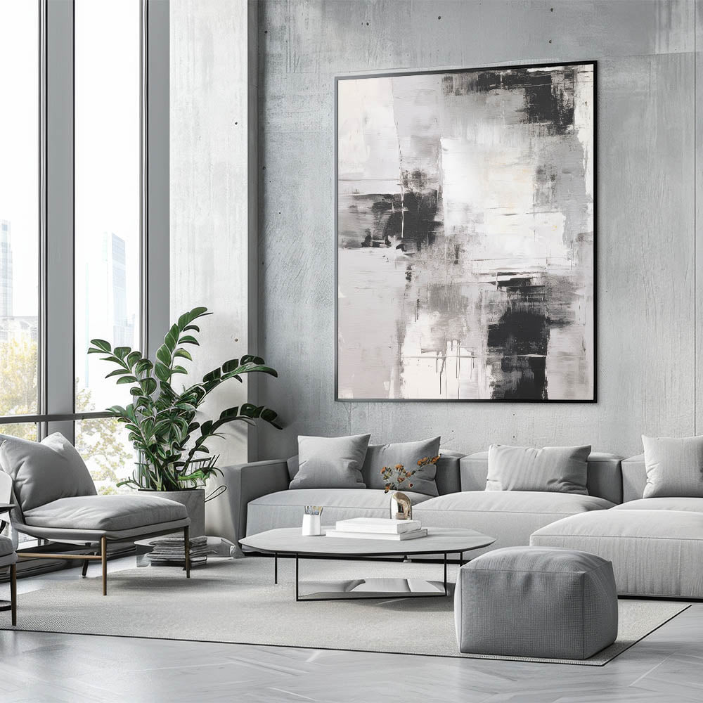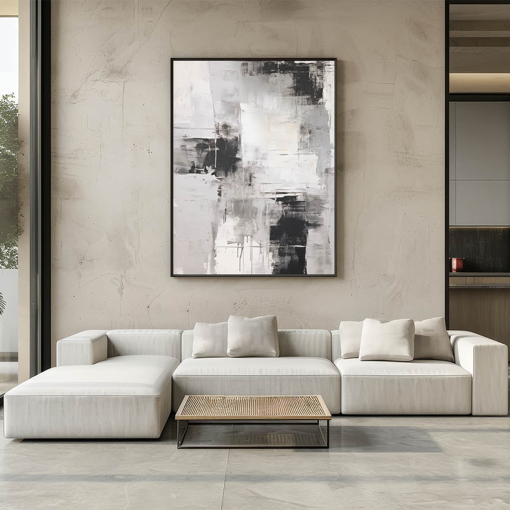 - Design: Abstract expressionist painting with a monochrome palette, featuring dynamic brushstrokes and bold contrasts.