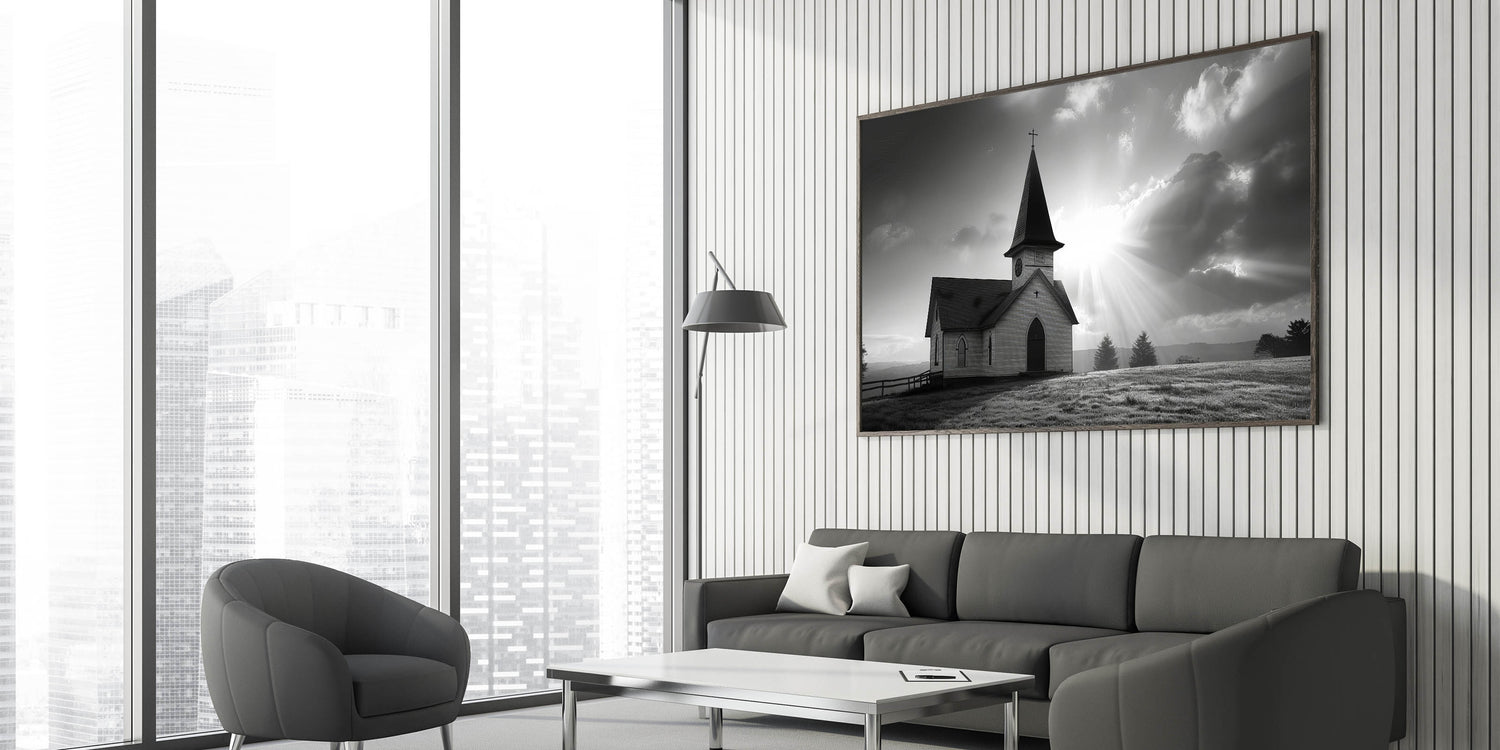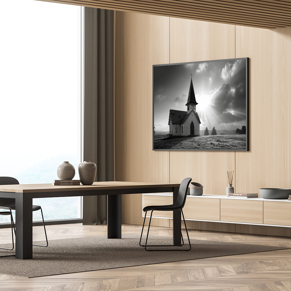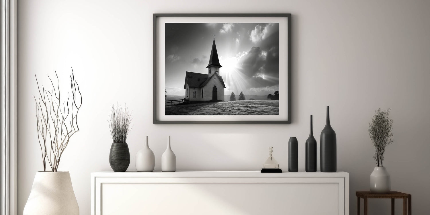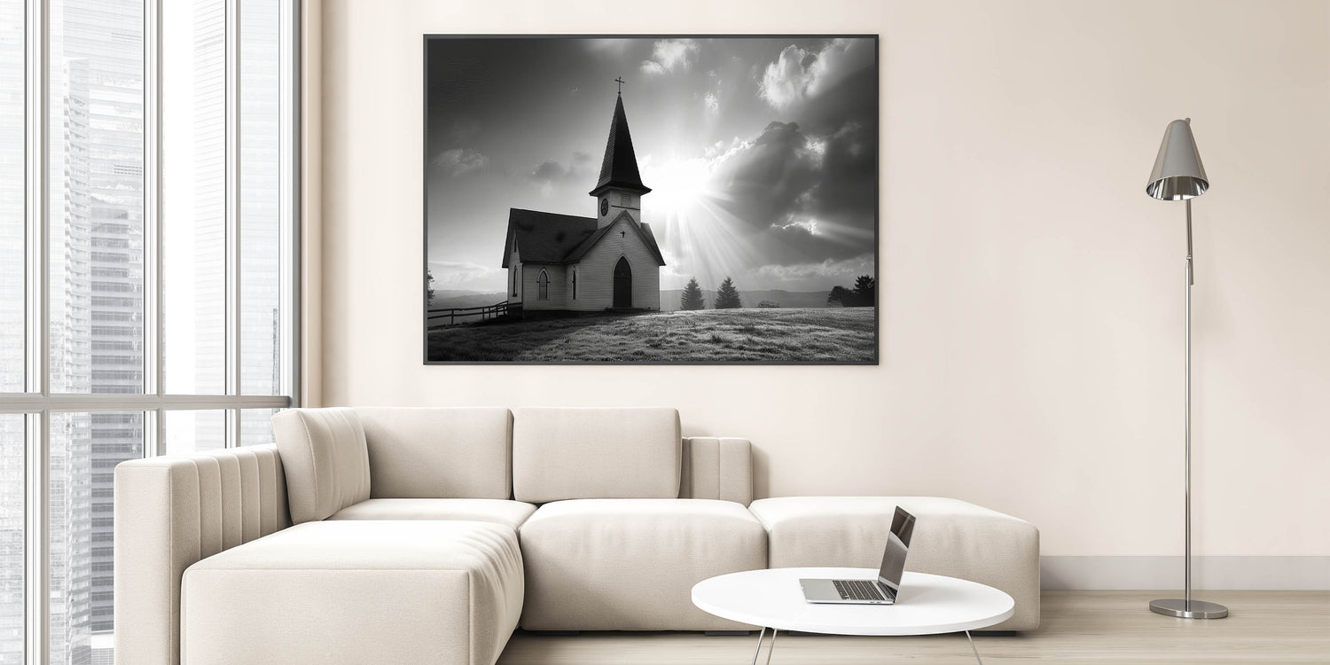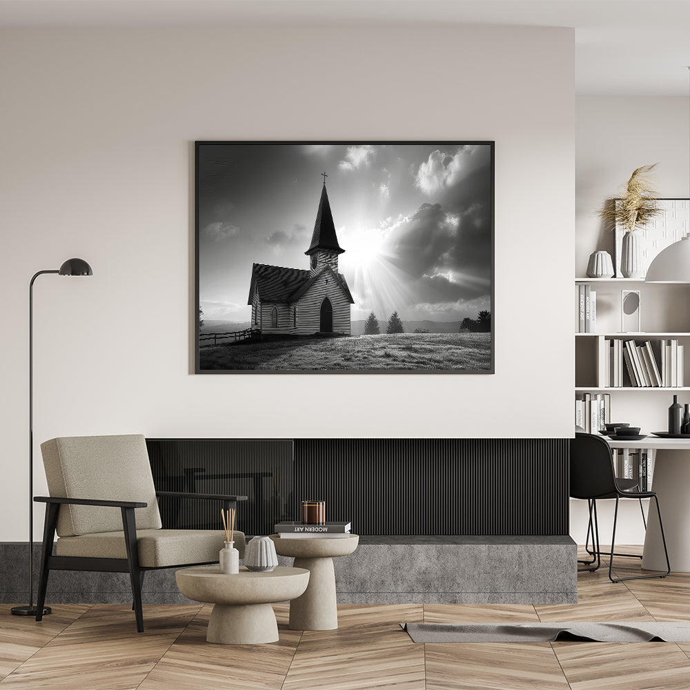 Monochrome Church Sunrise - Spiritual Wall Art for Tranquil Decor