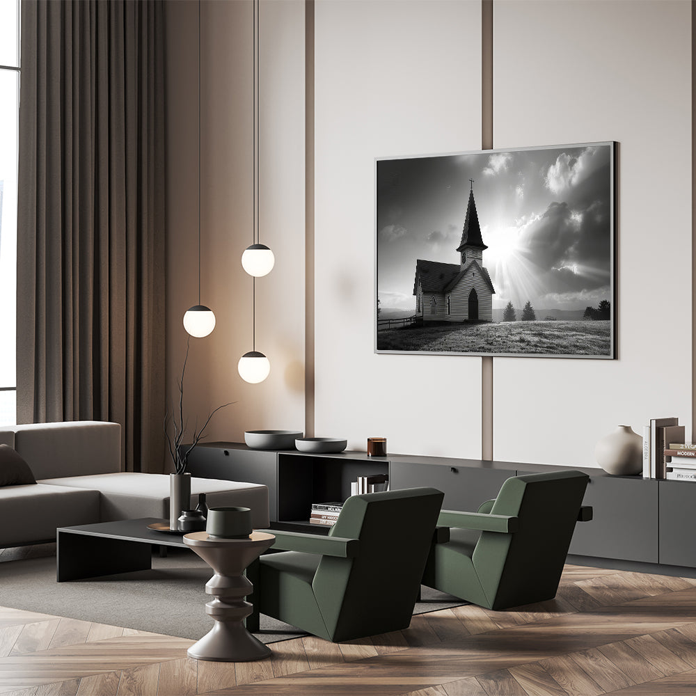 This powerful black-and-white artwork captures the tranquil beauty of a church bathed in the soft rays of a rising sun. The monochromatic tones emphasize the dramatic contrast between light and shadow, creating a peaceful yet striking composition. Perfect for those seeking to add a touch of spiritual depth and serenity to their living spaces, this piece is an ideal reflection of quiet contemplation and the beauty of dawn.