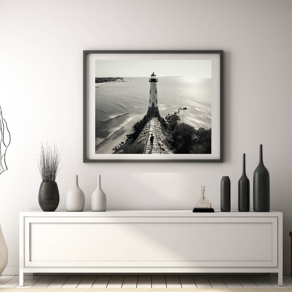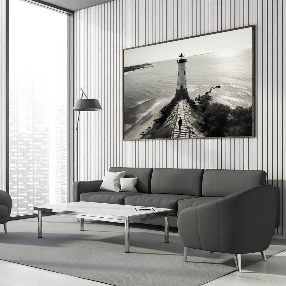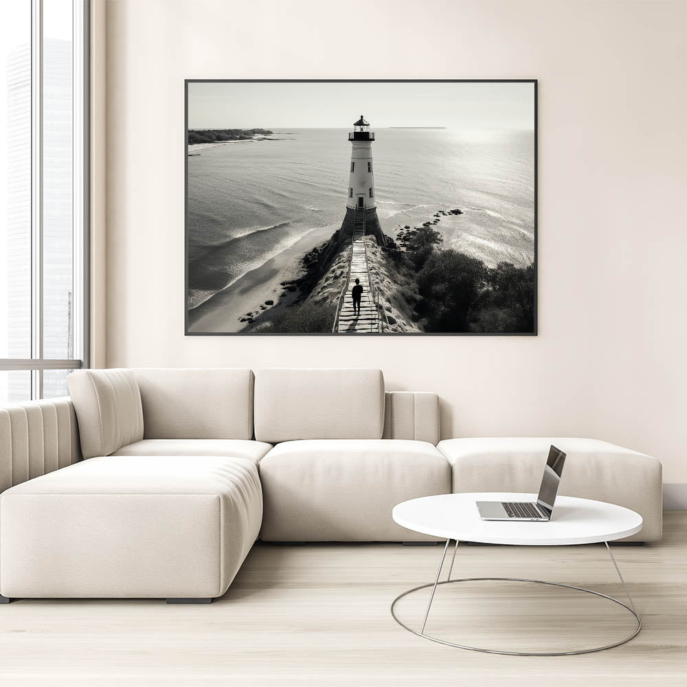 - Design: A serene monochrome depiction of a lighthouse and pathway, perfect for minimalist and coastal-inspired interiors.