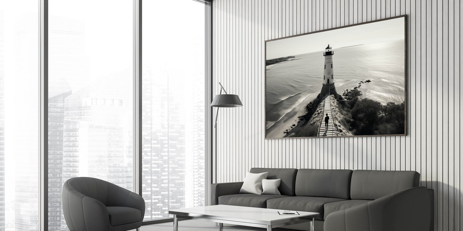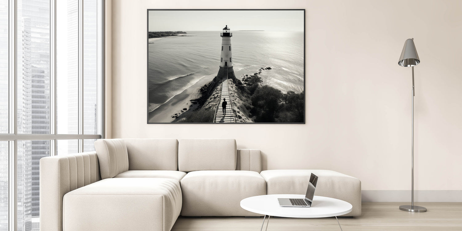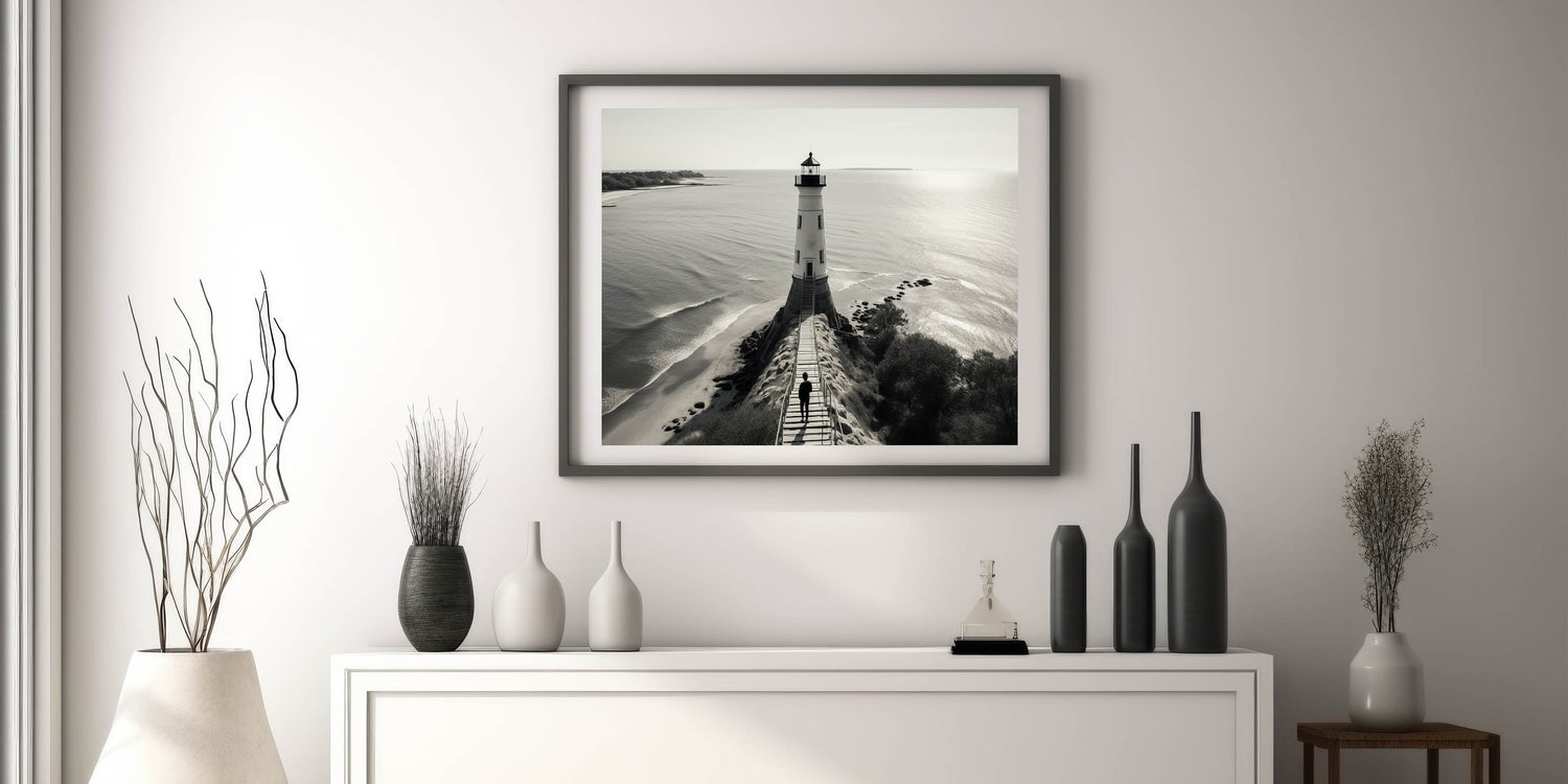 - Design: A serene monochrome depiction of a lighthouse and pathway, perfect for minimalist and coastal-inspired interiors.