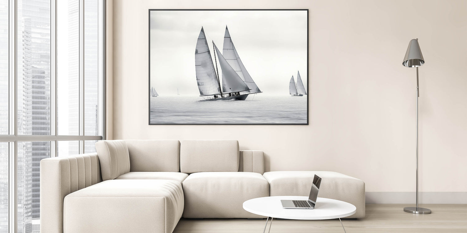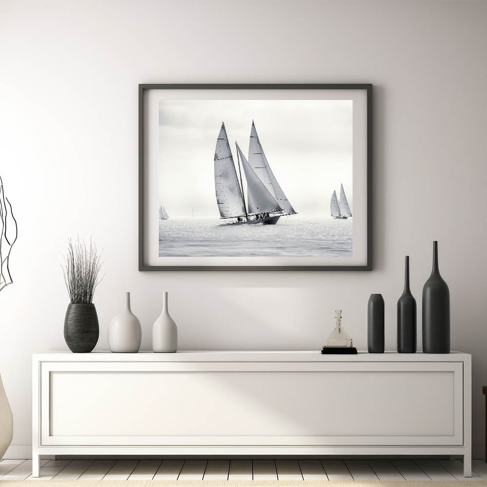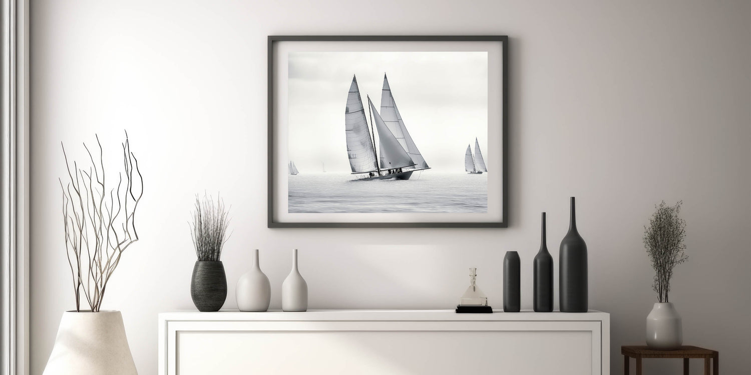 Whether you're drawn to the elegance of monochrome art or simply appreciate the clean lines and dynamics of sailing, the "Monochrome Regatta" wall art is the perfect addition to your decor collection. Let this minimalist sailboat scene bring a touch of sophistication to your space.