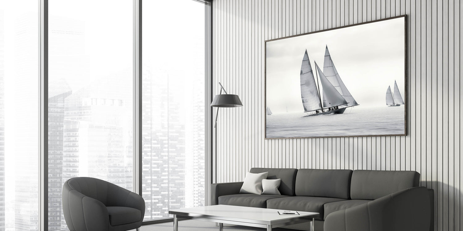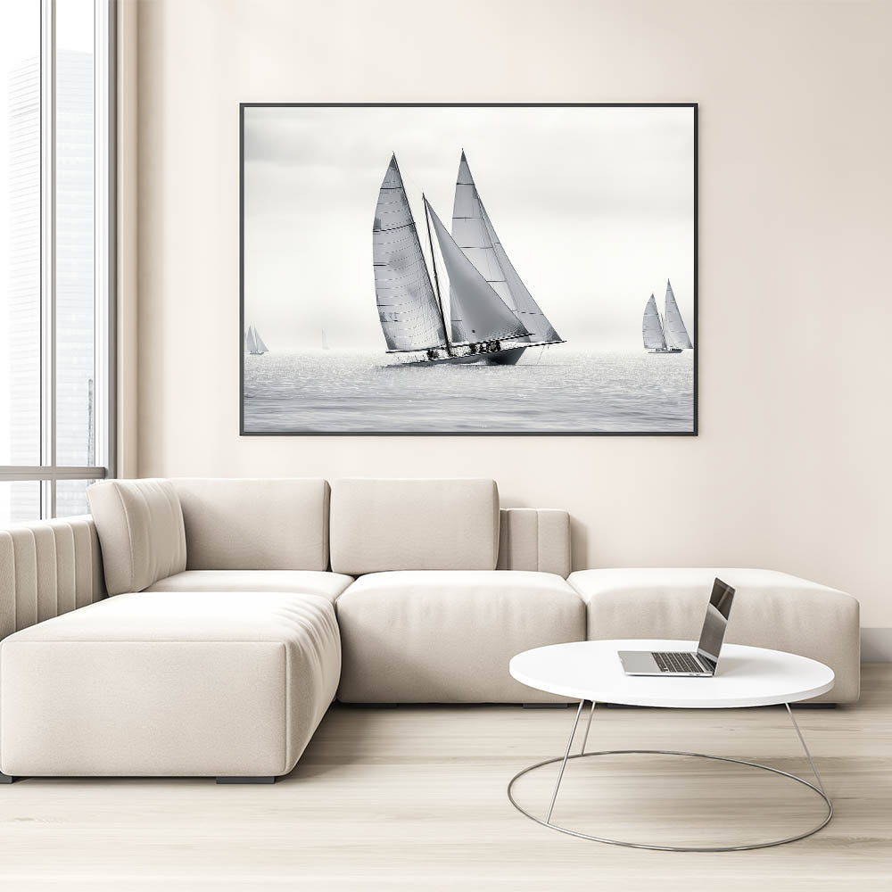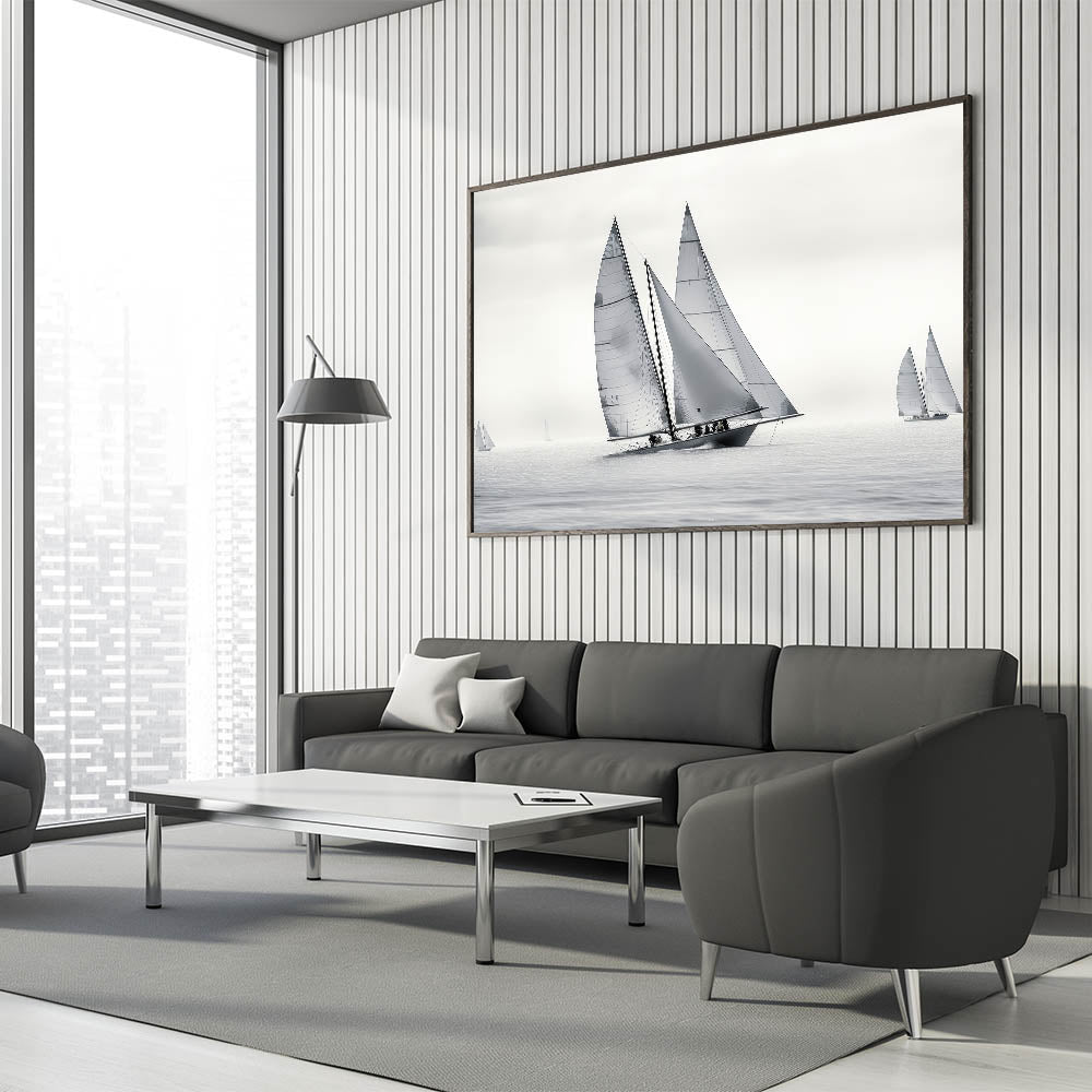 Whether you're drawn to the elegance of monochrome art or simply appreciate the clean lines and dynamics of sailing, the "Monochrome Regatta" wall art is the perfect addition to your decor collection. Let this minimalist sailboat scene bring a touch of sophistication to your space.