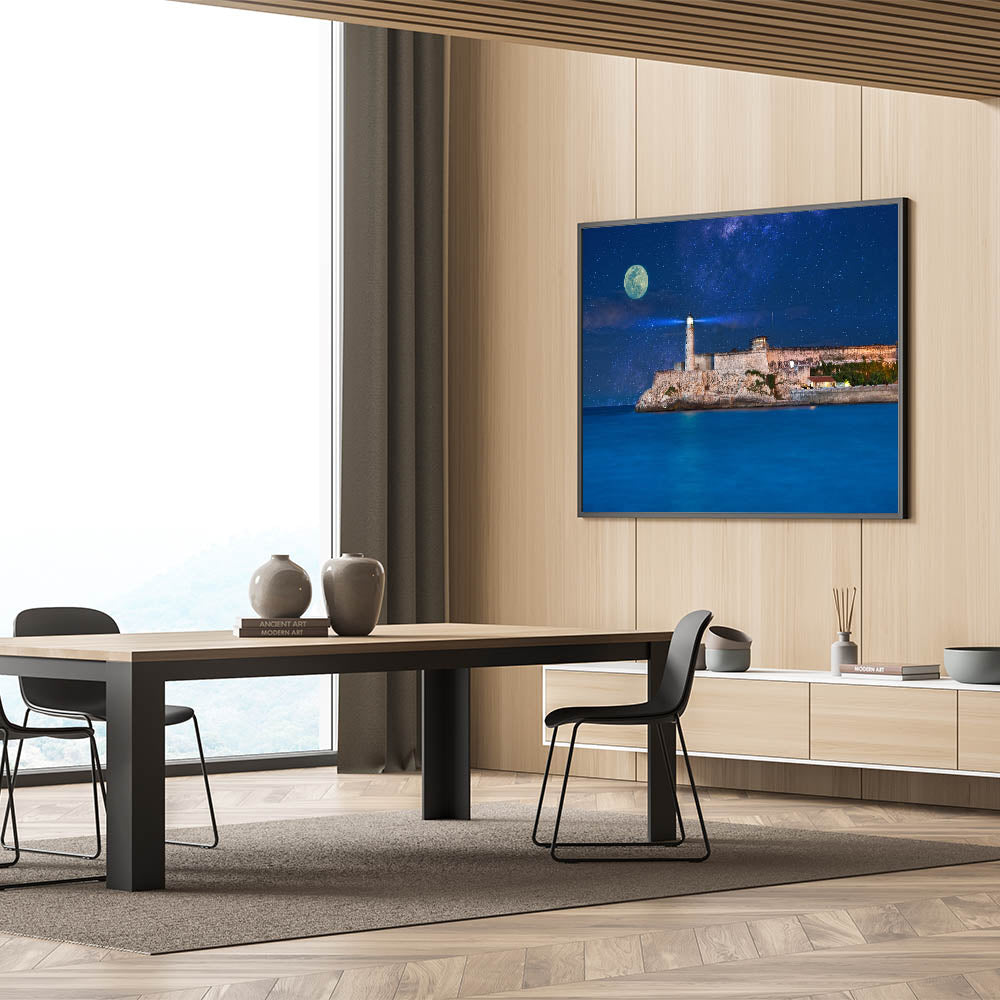 Bring the magic of Havana’s coastal beauty into your home with this breathtaking wall art featuring a moonlit lighthouse under a starry Cuban sky. The serene blue waters contrast with the ancient lighthouse structure, creating a perfect harmony between nature and history. This artwork captures the tranquil yet captivating atmosphere of Havana’s coastline, making it an ideal piece for those who appreciate coastal and night sky scenes.