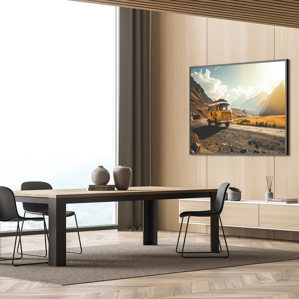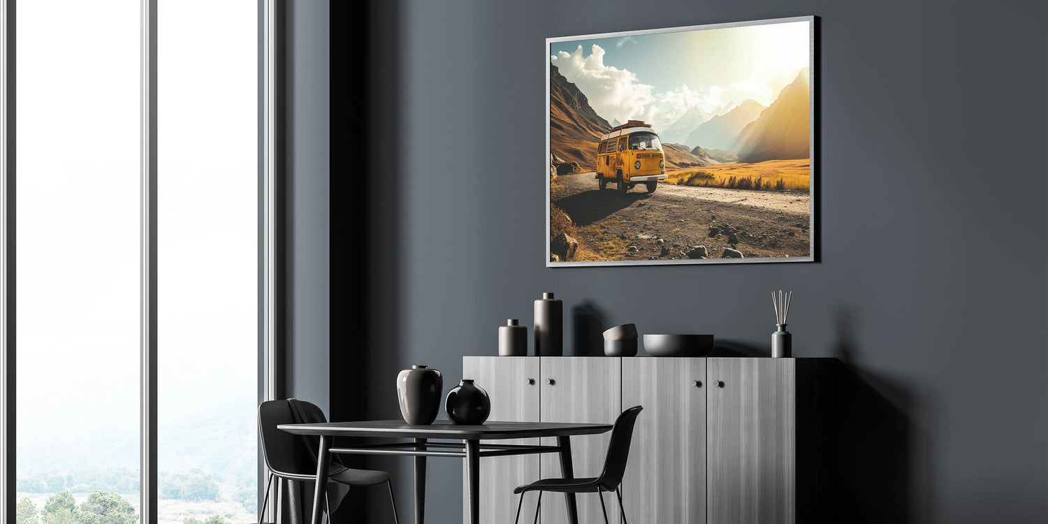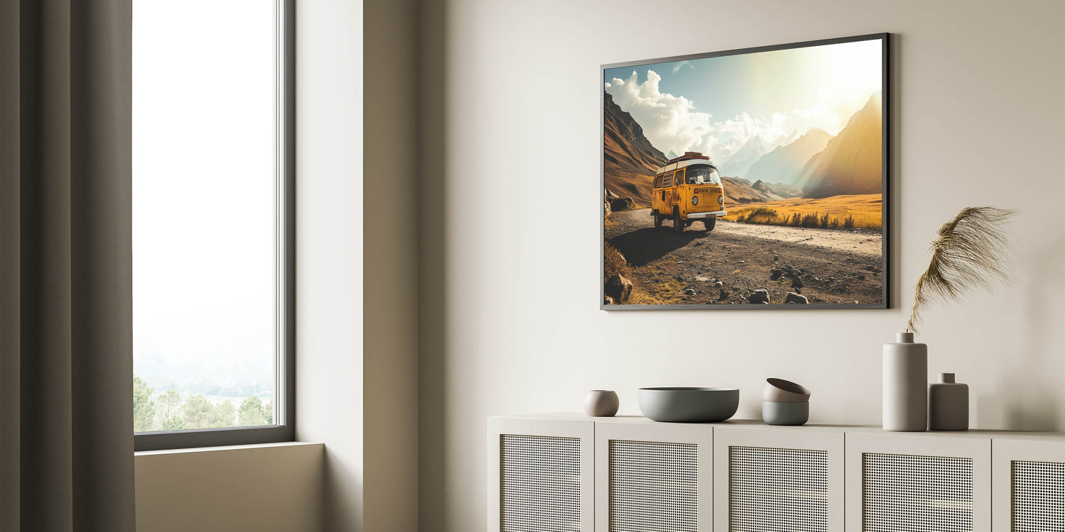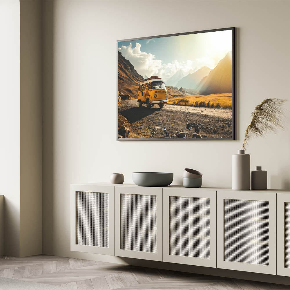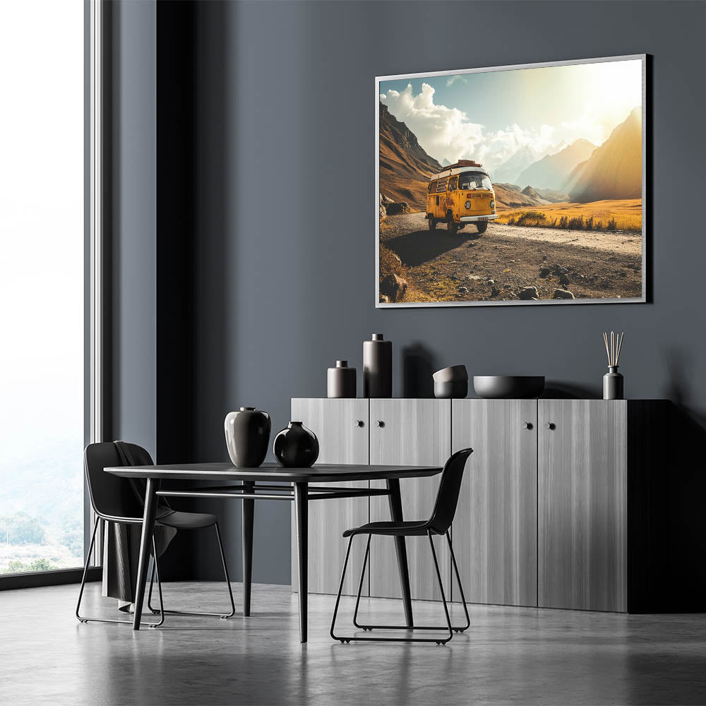 - High-Quality Printing: This art piece is printed on premium materials, capturing the vibrant hues of the mountains and the van in stunning detail.