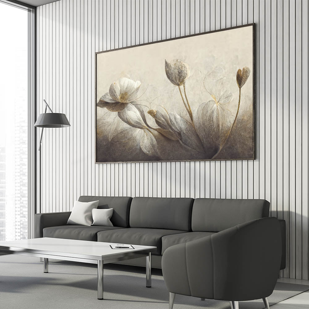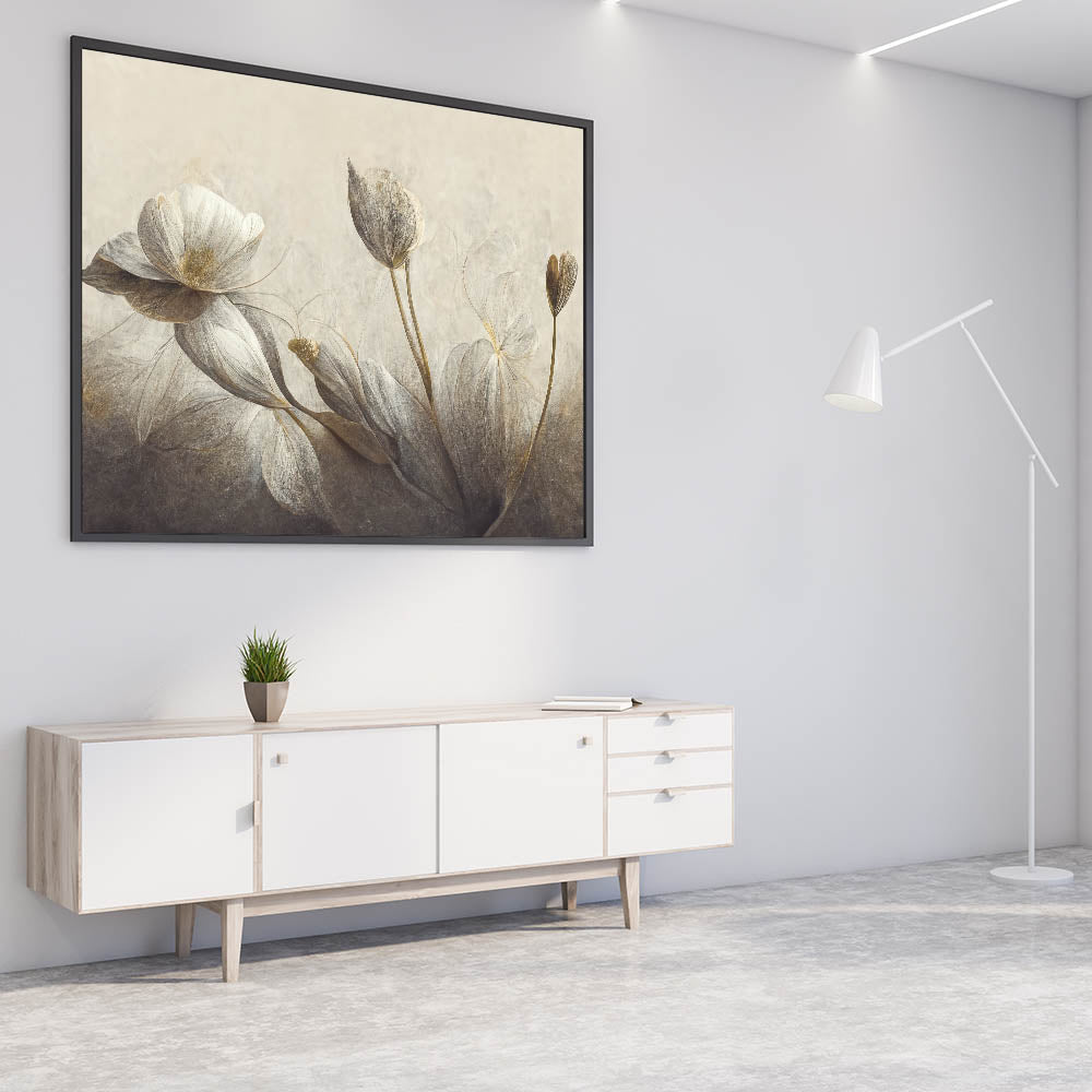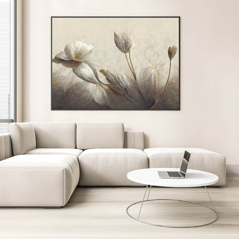 Infuse your space with the understated beauty of this muted elegance abstract floral canvas. The artwork features delicate flowers in a soft, neutral palette of beige, gray, and subtle golds, creating a serene and sophisticated atmosphere. The minimalist design and muted tones make this piece a versatile addition to any contemporary or minimalist interior, offering a touch of natural elegance without overpowering your space.