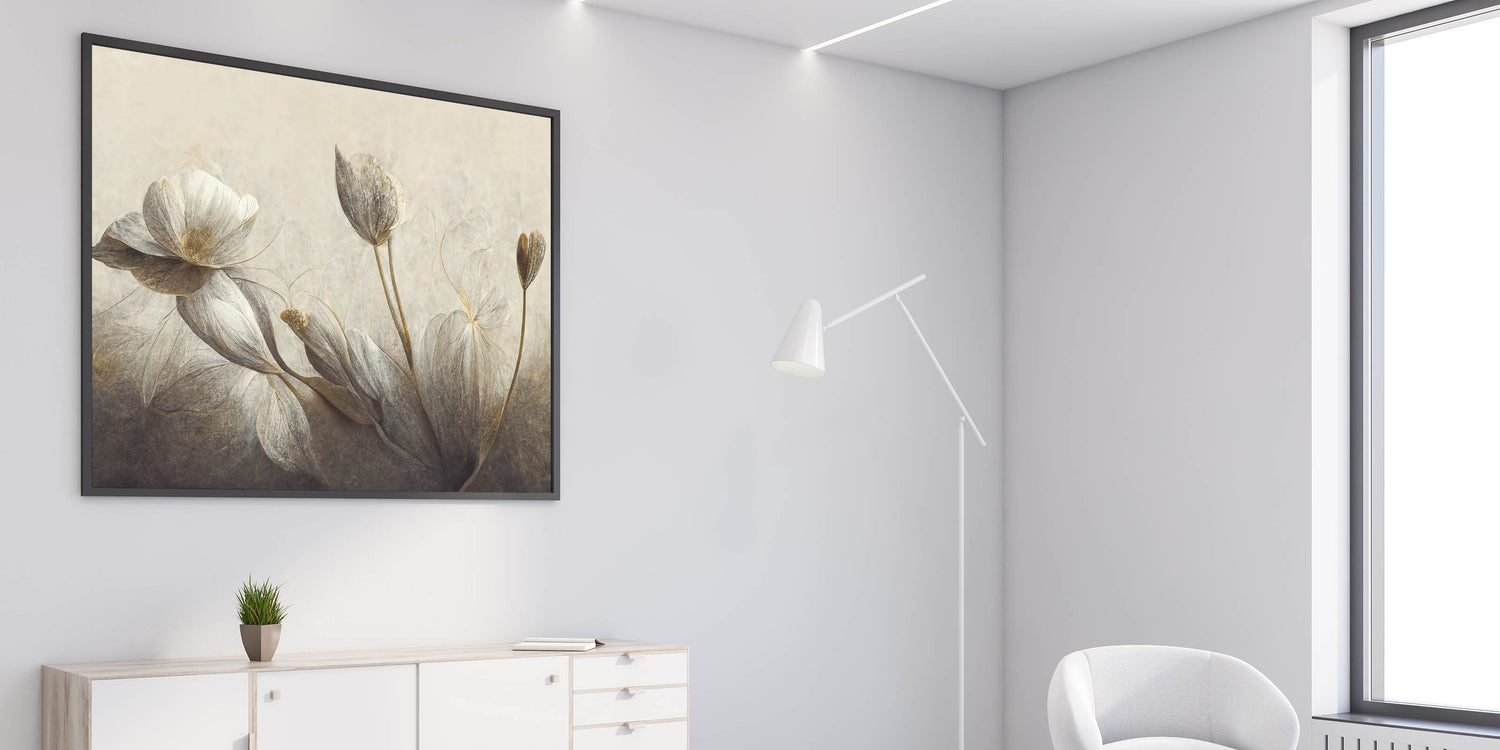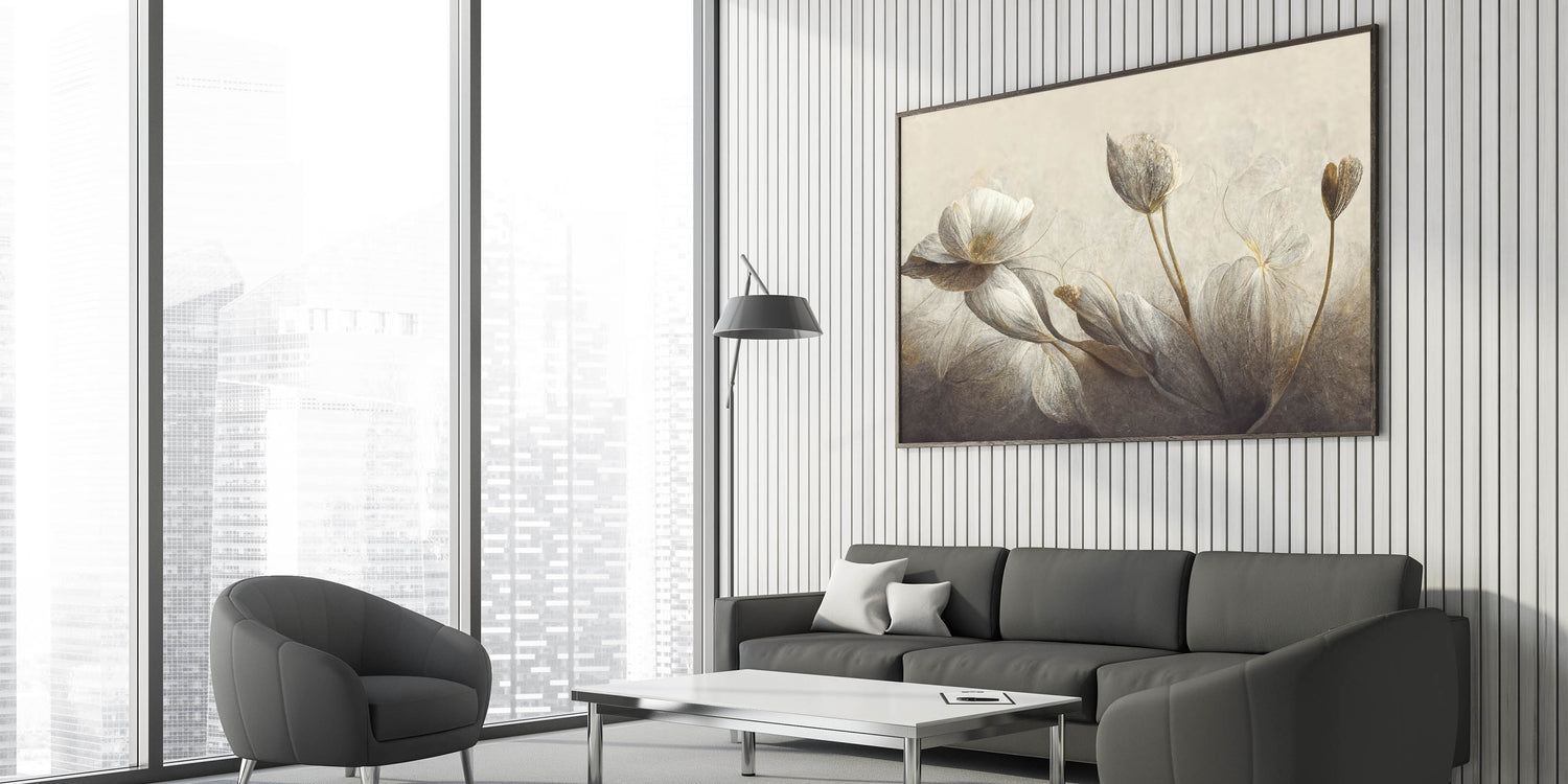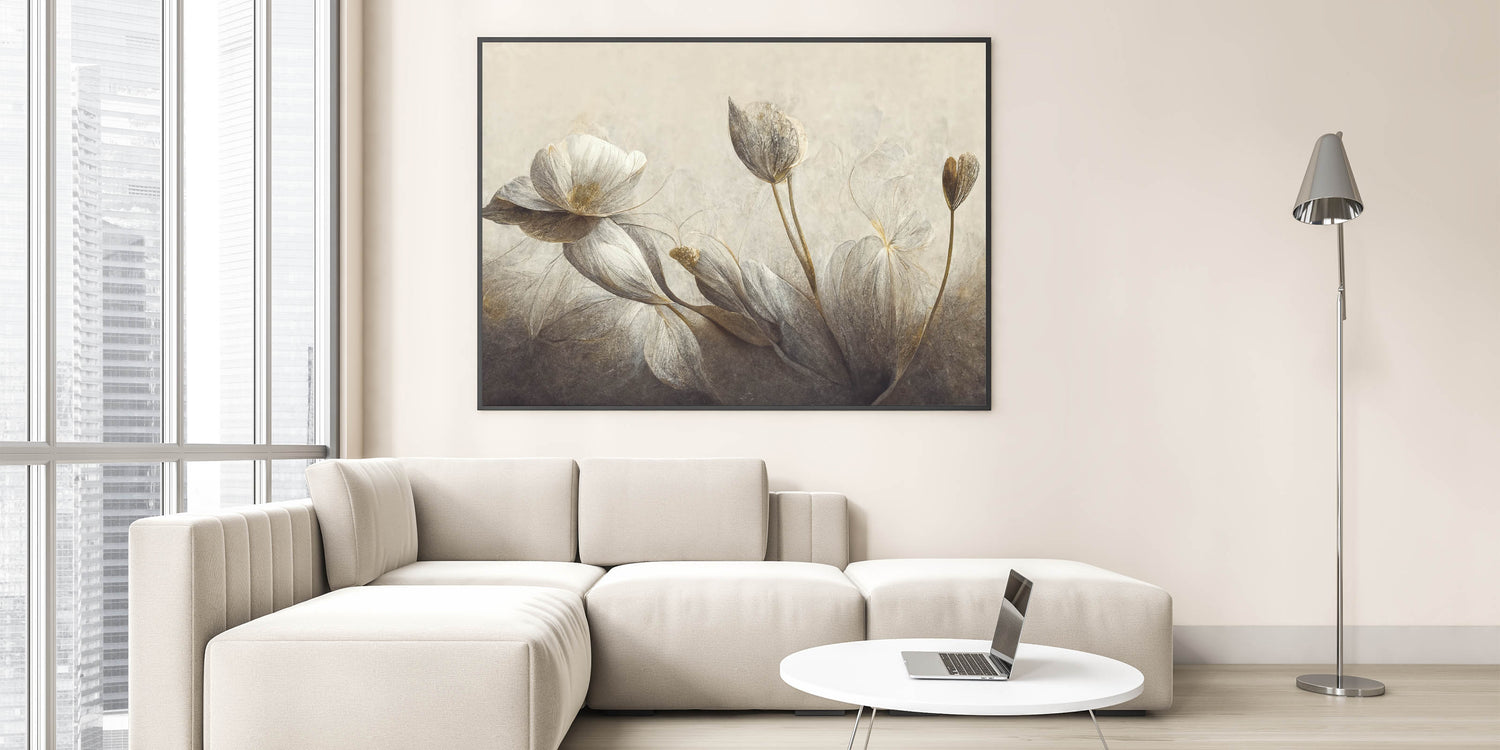 Infuse your space with the understated beauty of this muted elegance abstract floral canvas. The artwork features delicate flowers in a soft, neutral palette of beige, gray, and subtle golds, creating a serene and sophisticated atmosphere. The minimalist design and muted tones make this piece a versatile addition to any contemporary or minimalist interior, offering a touch of natural elegance without overpowering your space.