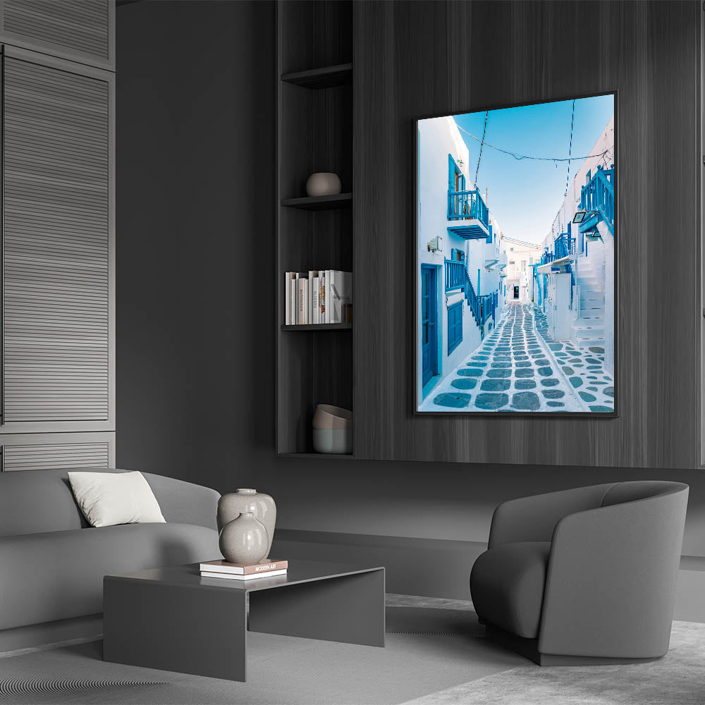 Bring the timeless charm of Greece into your home with this captivating Mykonos wall decor featuring the iconic blue and white streets of the Greek islands. This artwork beautifully captures the simplicity and elegance of Mykonos' famous architecture, where whitewashed walls meet vibrant blue balconies and doors. The winding cobblestone streets evoke a sense of serenity and invite viewers to explore the unique beauty of Greece’s coastal towns.