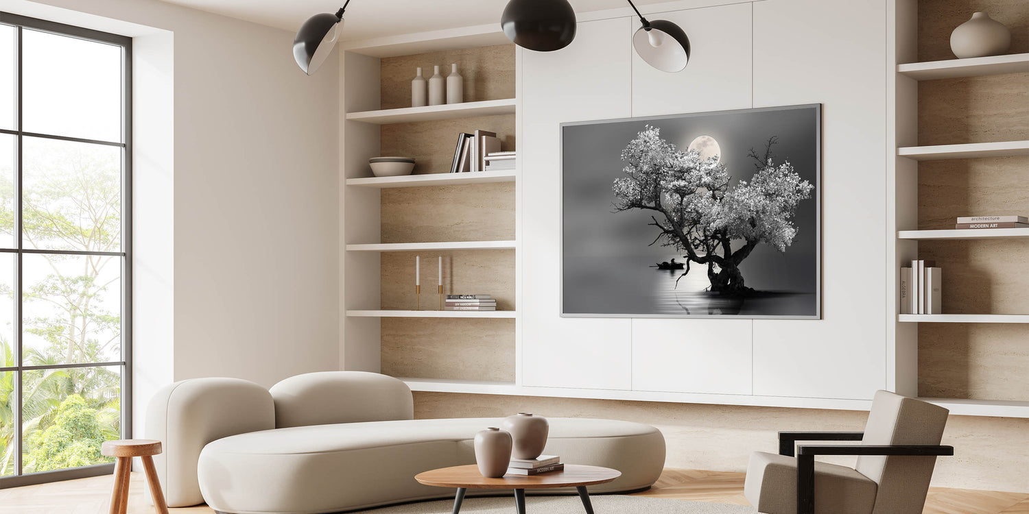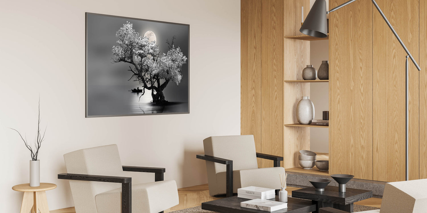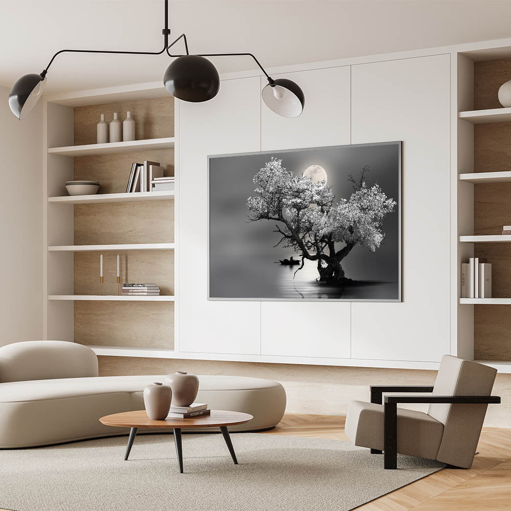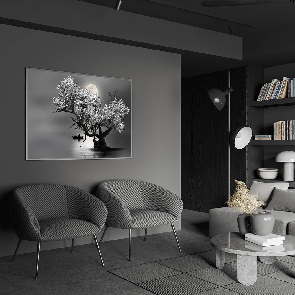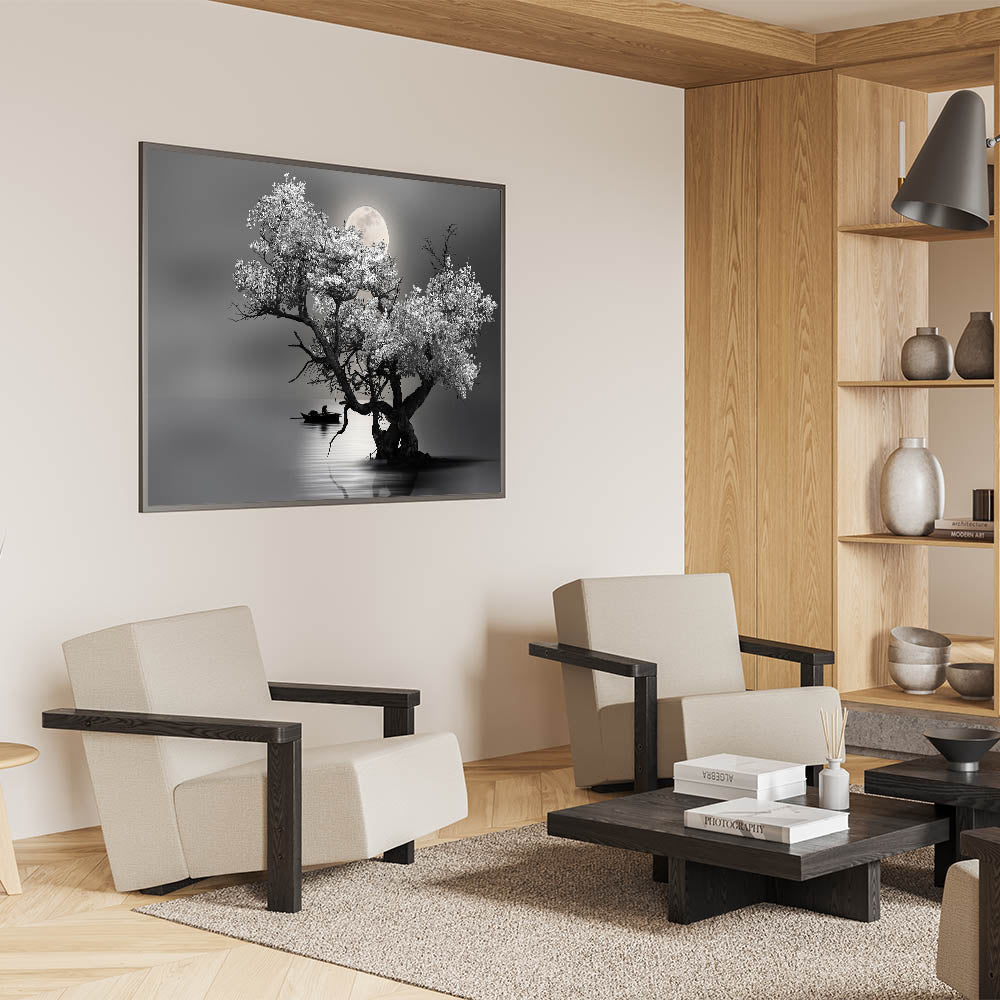 Step into a world of serene mystery with this mystical moonlit tree wall art. This captivating artwork features a lone tree with delicate blossoms, illuminated by a full moon in the background. The grayscale palette adds a layer of elegance and tranquility, while the soft reflection on the water creates a sense of calm and stillness. A solitary boat drifts silently beneath the tree, adding to the overall feeling of solitude and peace. This piece is perfect for those who appreciate the quiet beauty of nature and want to bring a touch of serenity into their space.