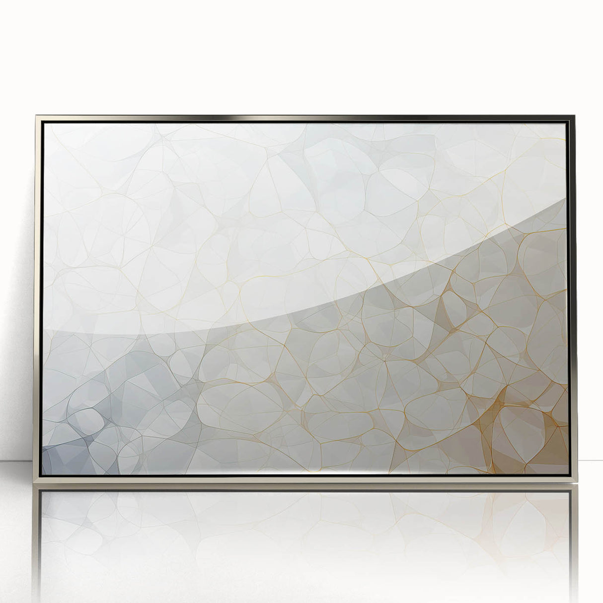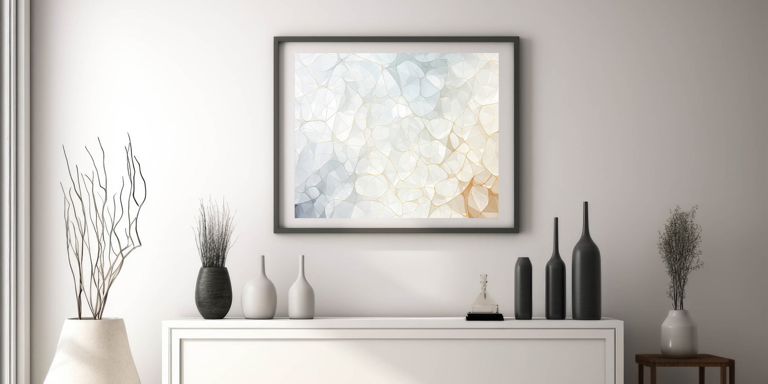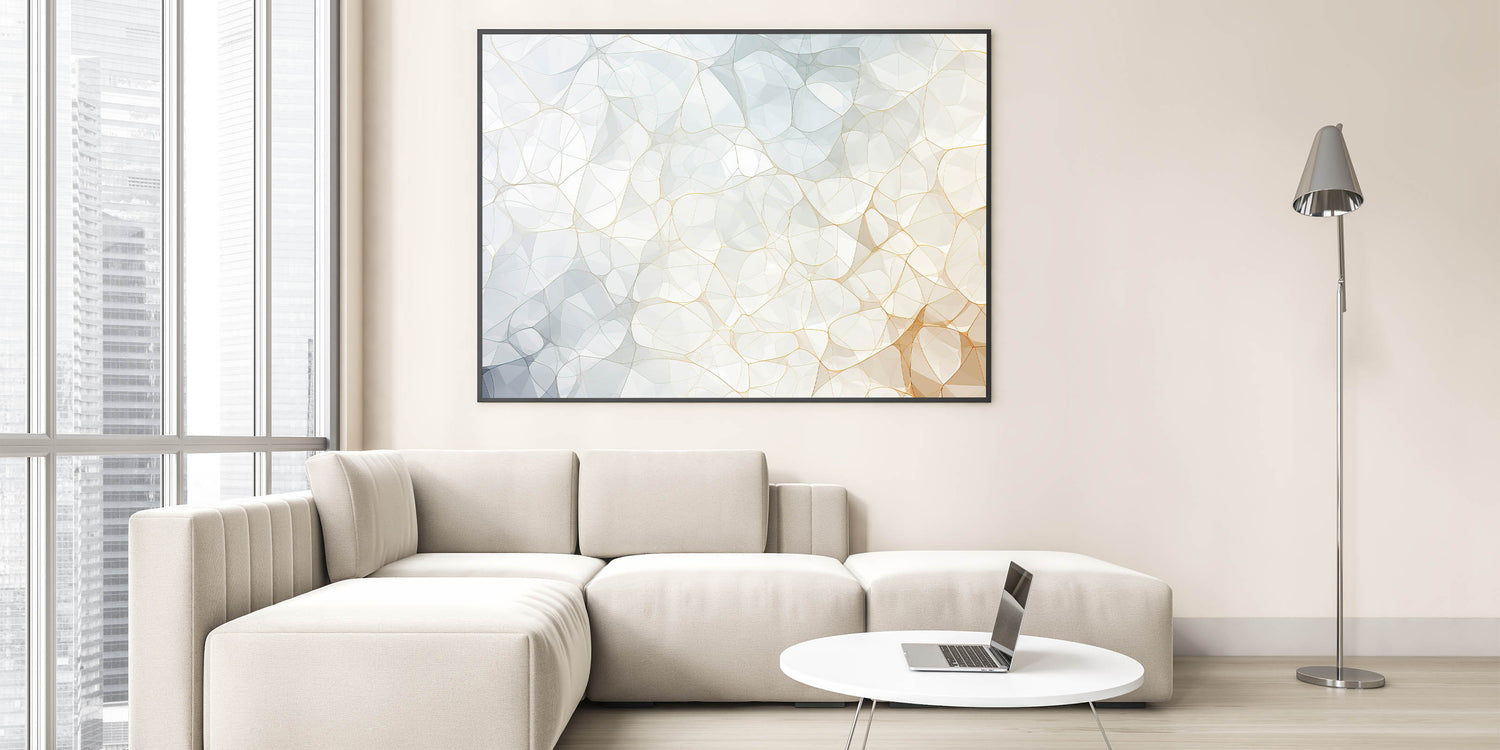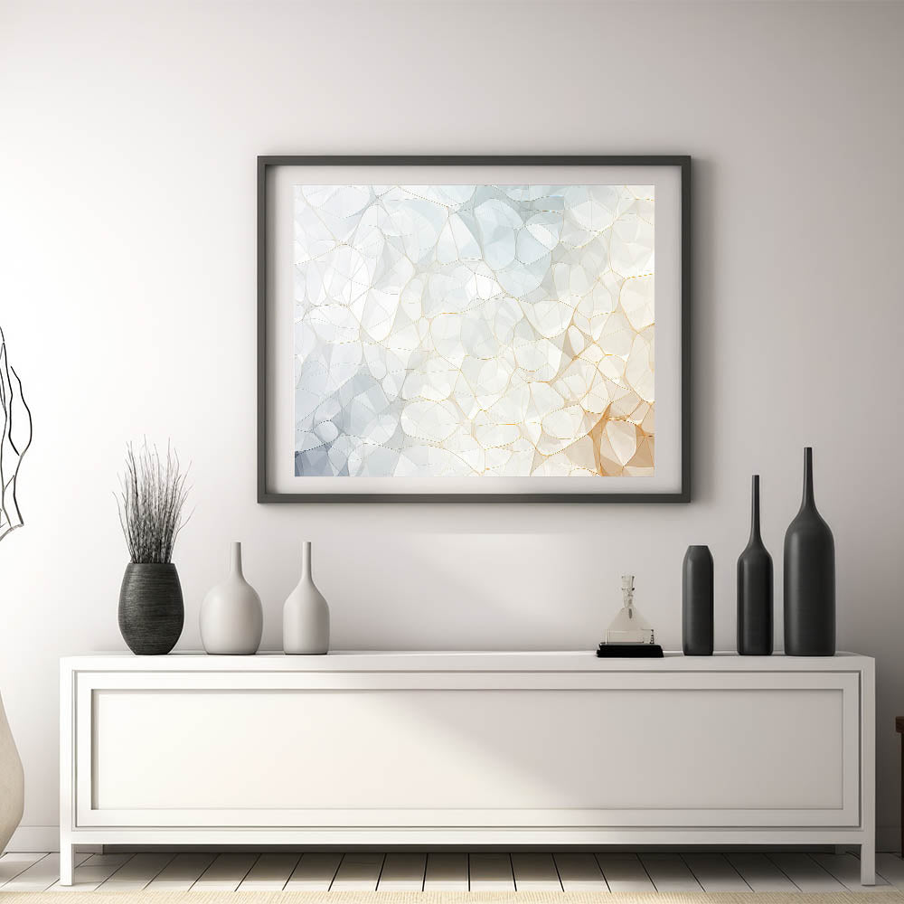 Elevate your interior with this stunning abstract design featuring delicate geometric patterns in soft, translucent tones. The gentle blend of whites, grays, and gold accents create an elegant and calming atmosphere, perfect for minimalist or modern decor styles. The fluid, organic shapes evoke the beauty of natural elements while maintaining a sophisticated, artistic touch. This piece is ideal for adding a subtle yet striking focal point to any room.