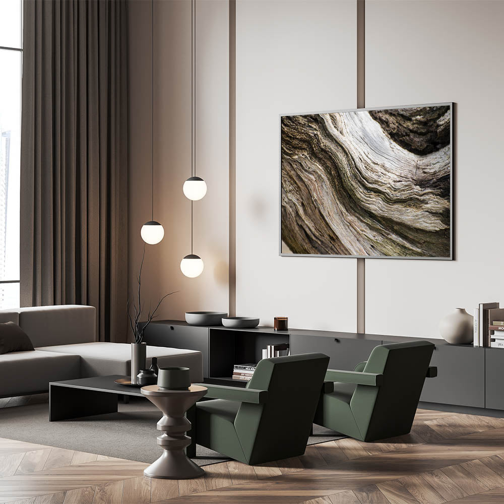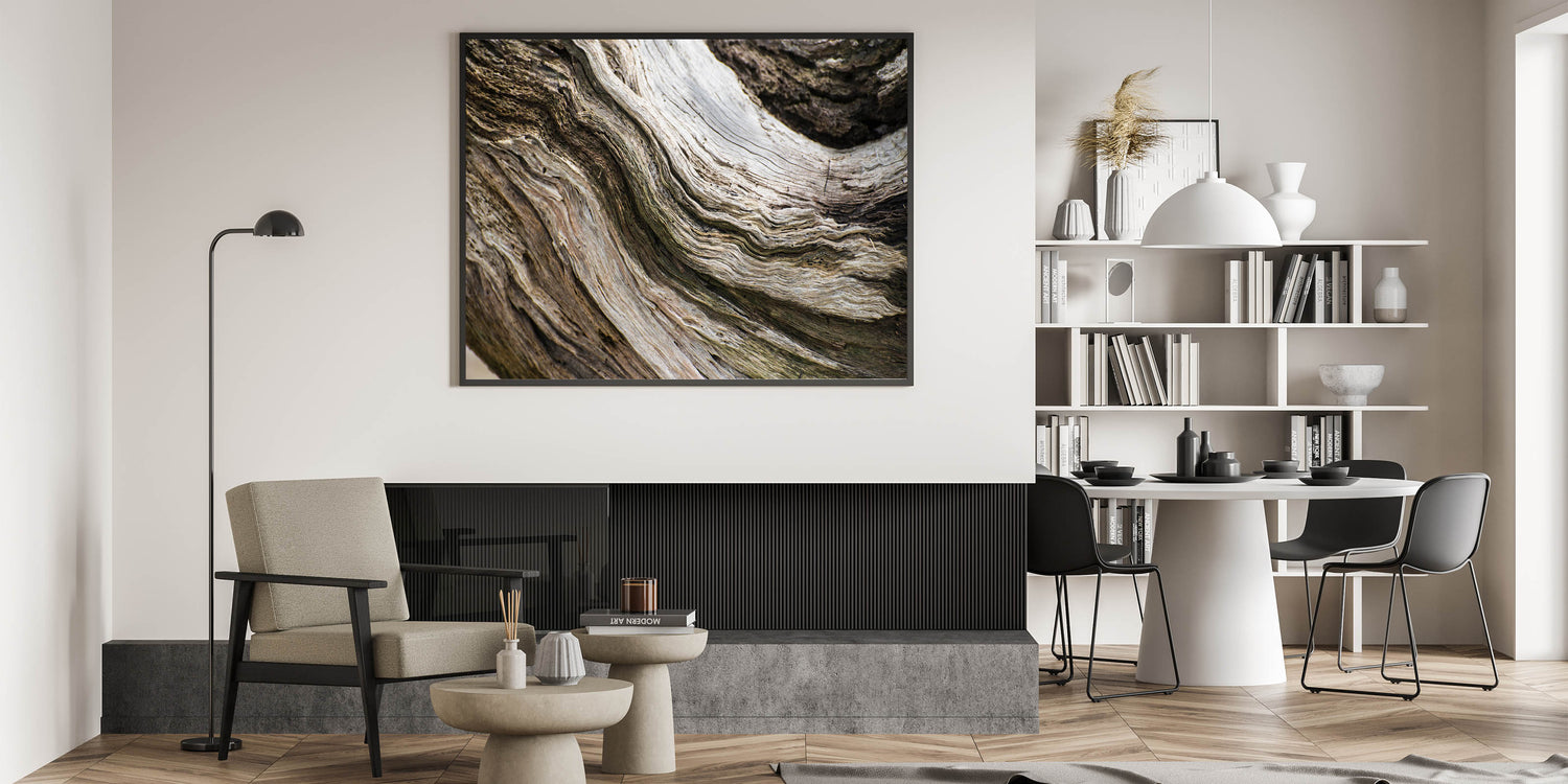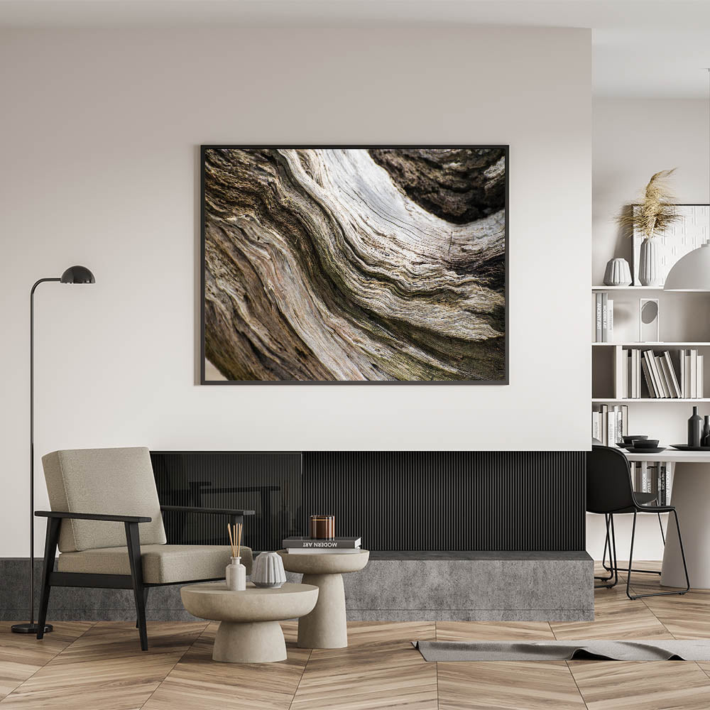 Elevate your interior with this natural wall decor, whether you choose a stretched canvas, framed print, or modern acrylic glass. The organic lines and textures of this wood closeup art provide a calming influence, ideal for enhancing your home’s atmosphere with natural elements.