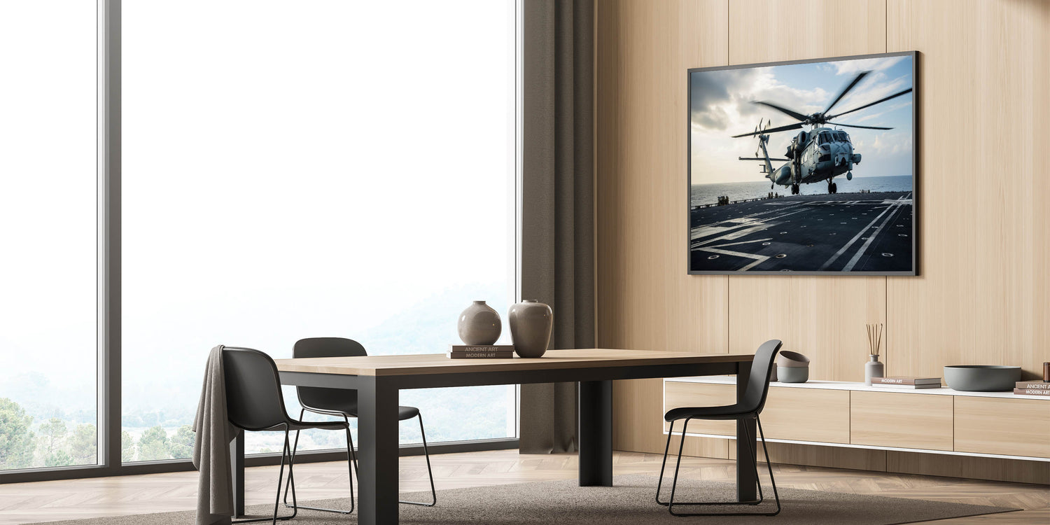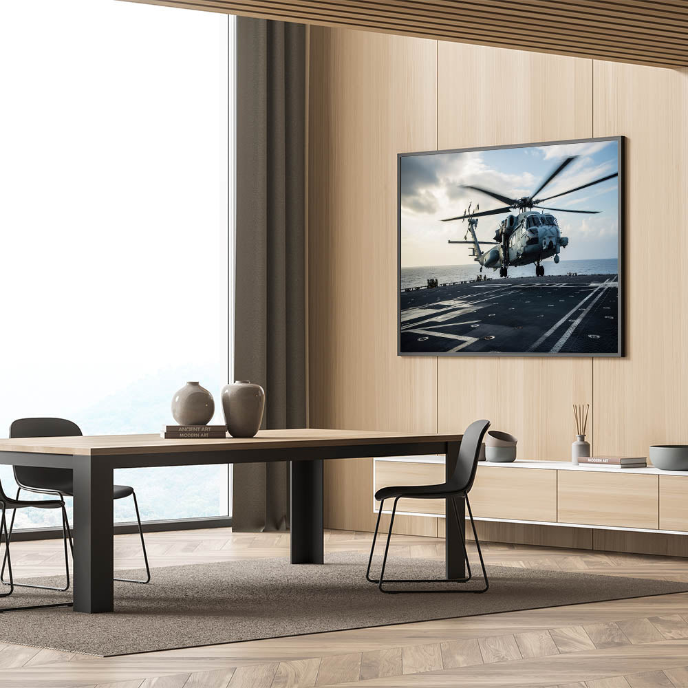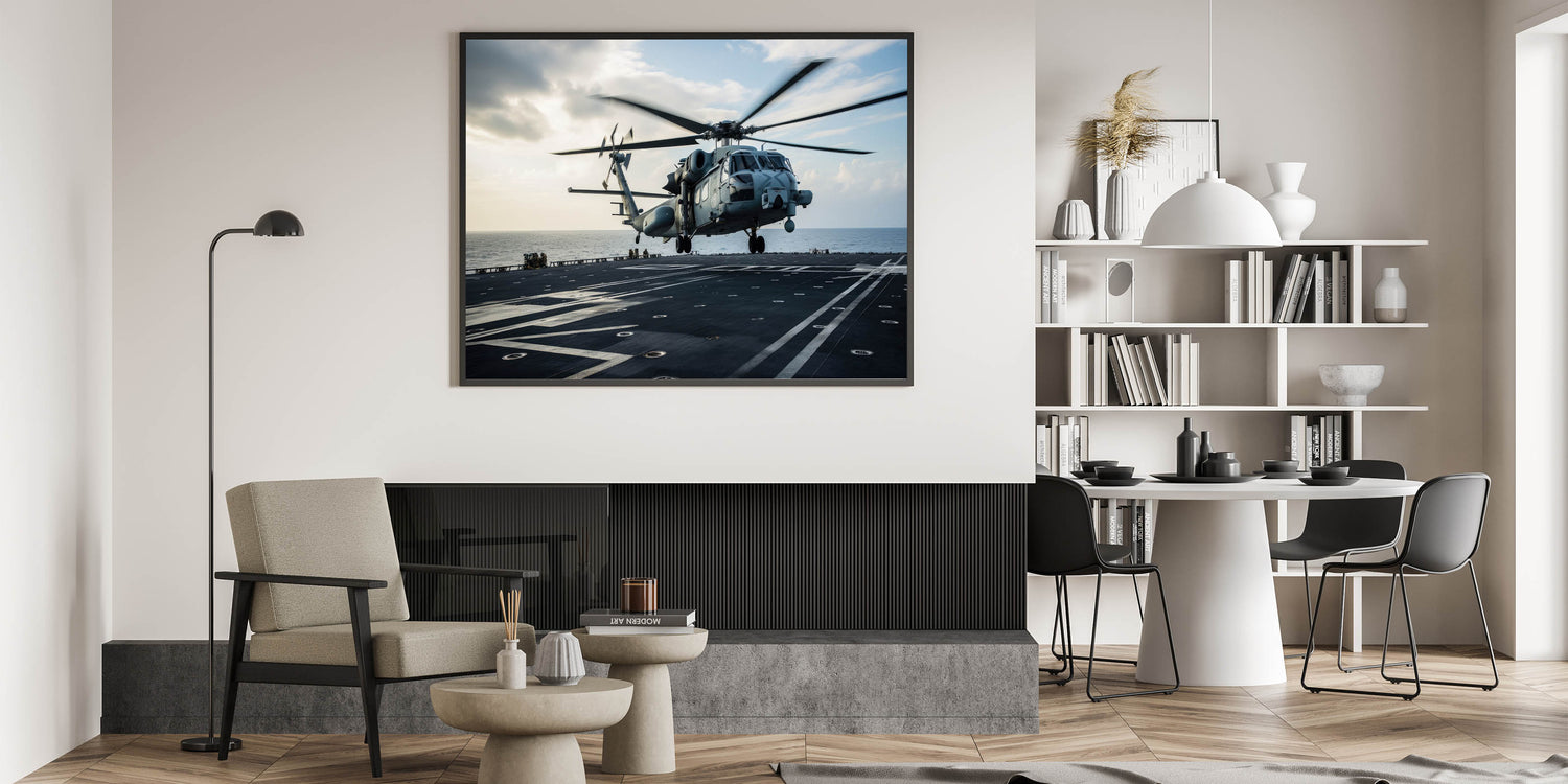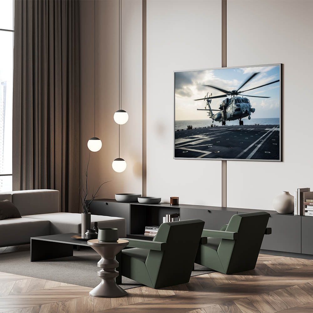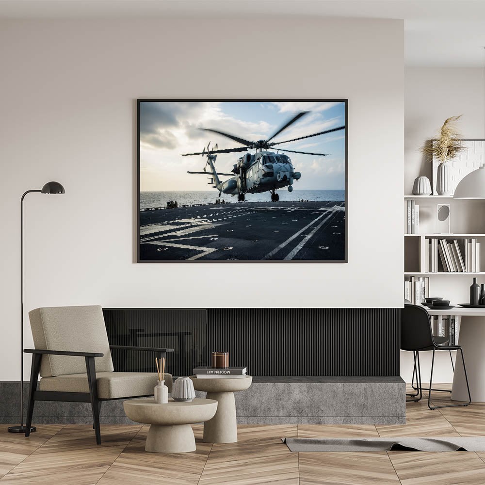 Elevate your home decor with this stunning naval helicopter wall art, capturing the moment of a helicopter gracefully landing on a naval carrier. This artwork is perfect for those who appreciate the precision and power of aviation. The image showcases the helicopter against the backdrop of a serene ocean, blending the intensity of modern technology with the calmness of the sea, making it an ideal piece for any room in your home.