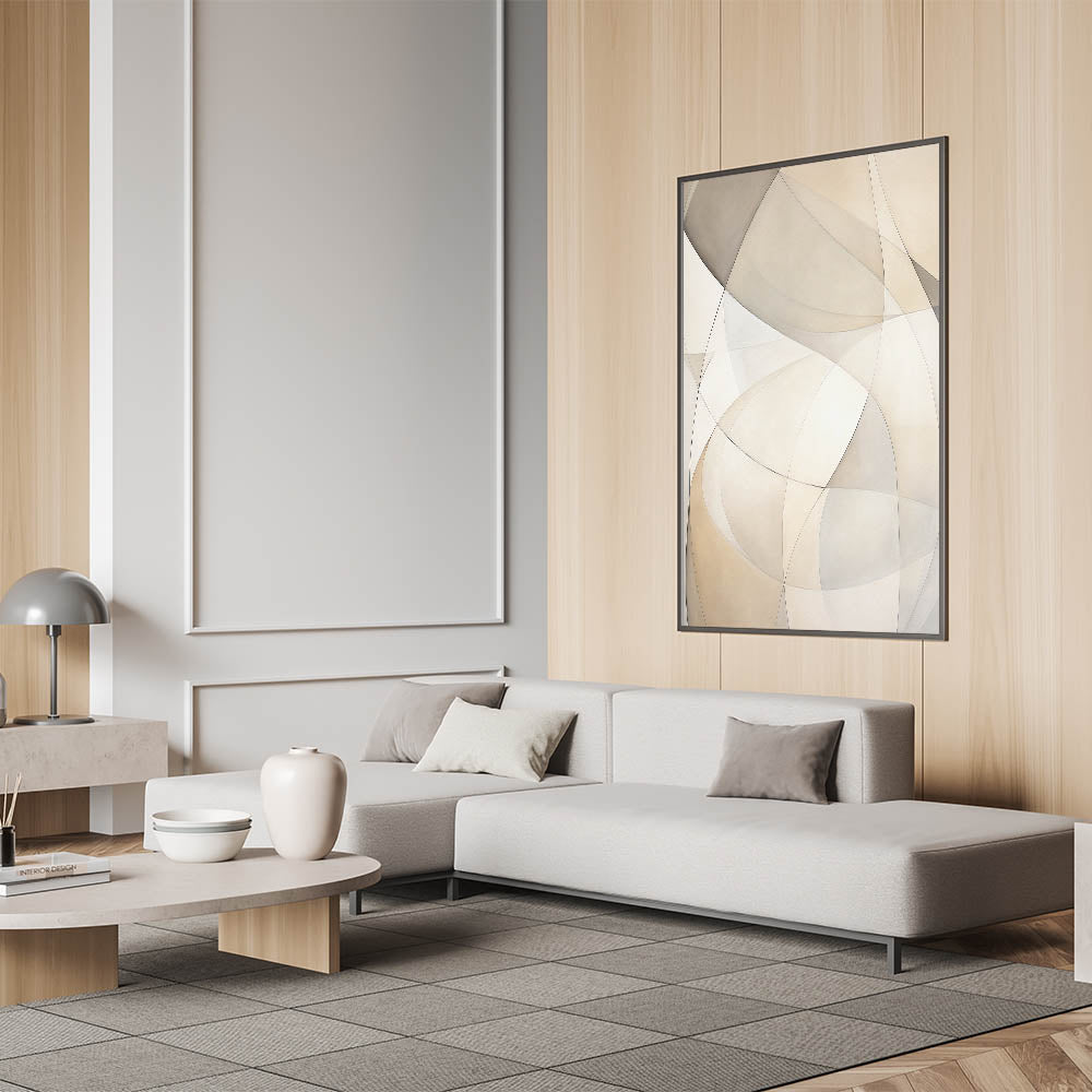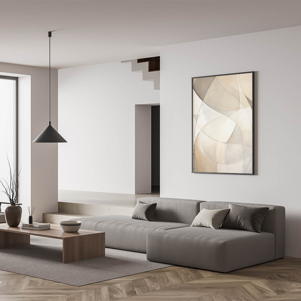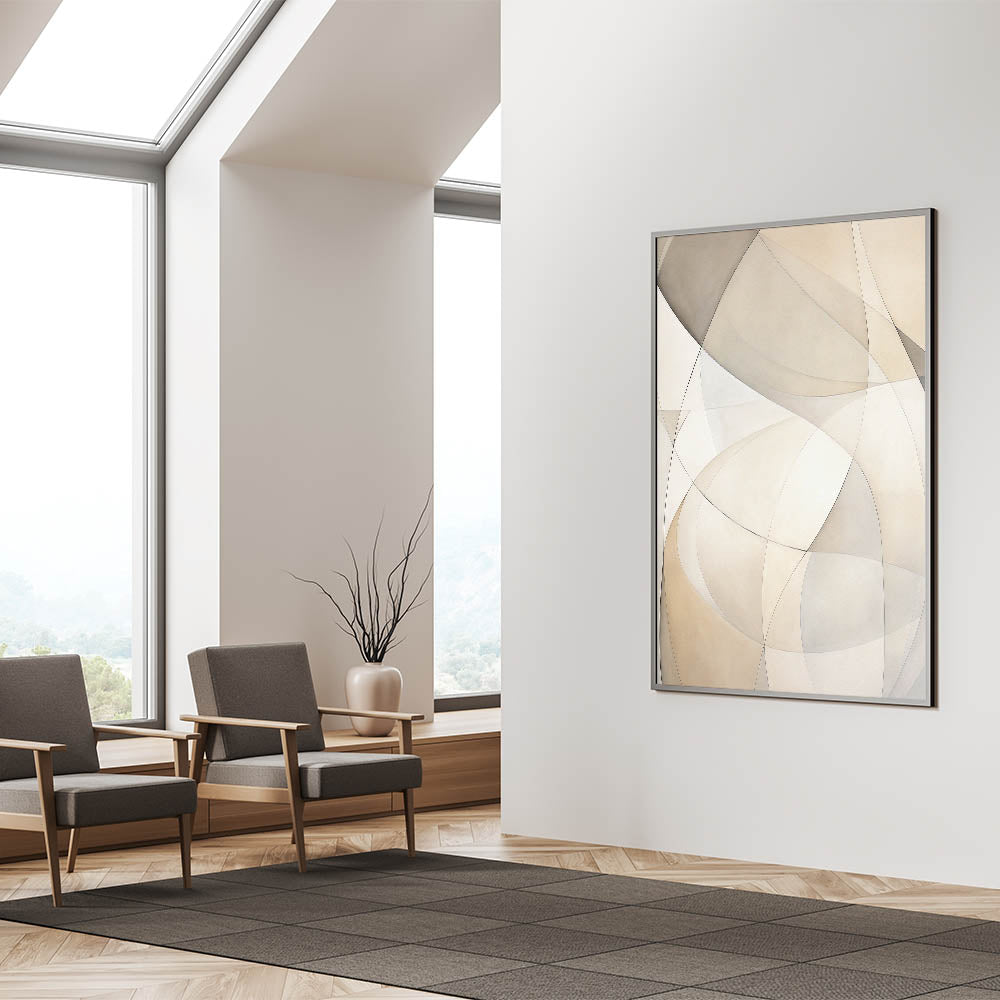 Transform your interior space with this elegant Neutral Minimalist Abstract Art piece. This modern artwork features a sophisticated blend of soft, neutral tones and smooth geometric shapes, creating a balanced and serene composition. The interplay of light beige, grey, and muted brown hues adds depth and warmth, making this piece a perfect addition to any contemporary home or office.
