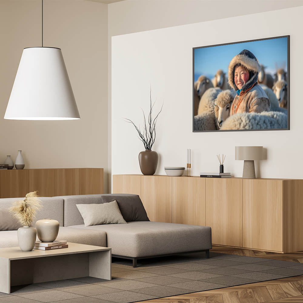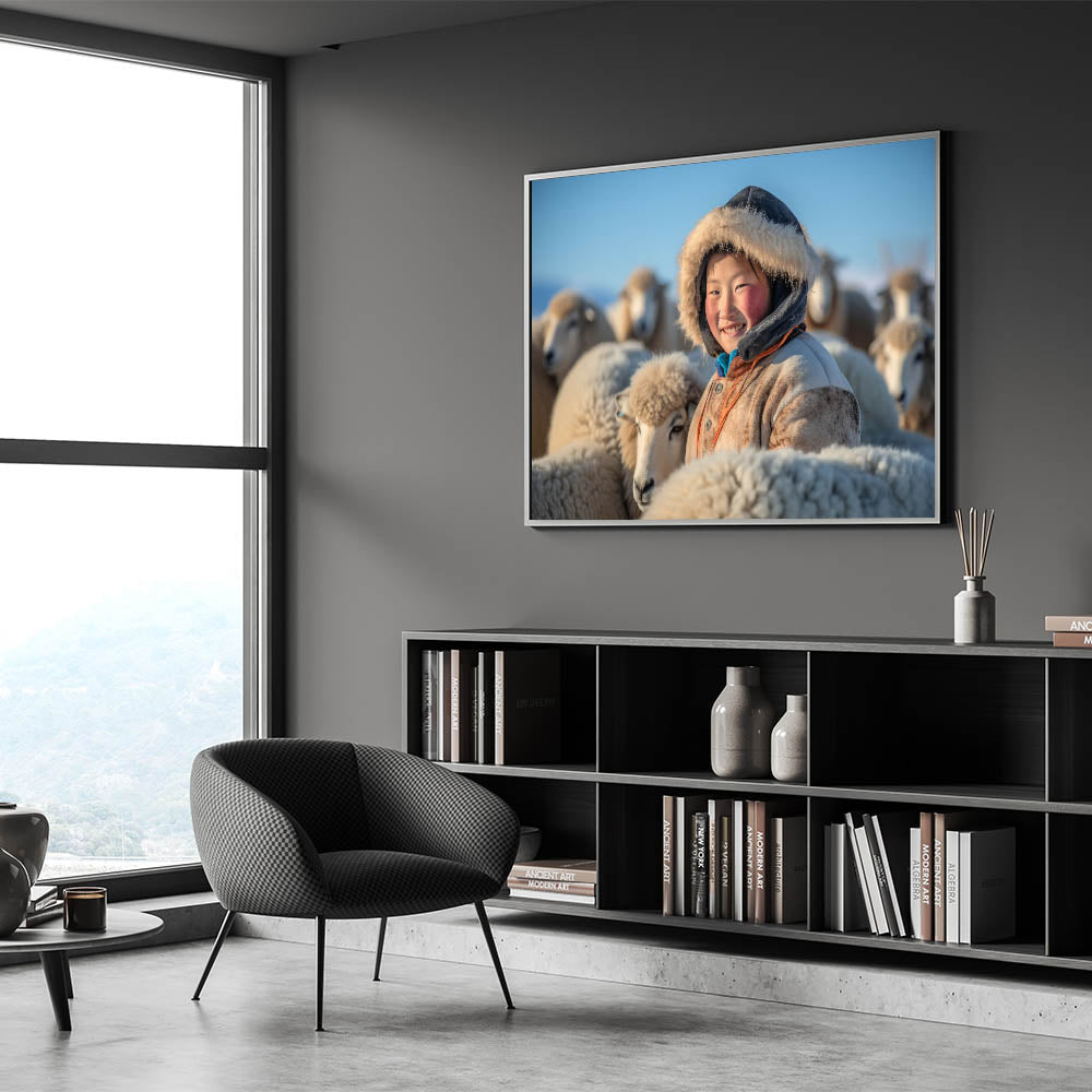 Nomadic Life Art - Smiling Child with Sheep in Mongolian Winter Landscape