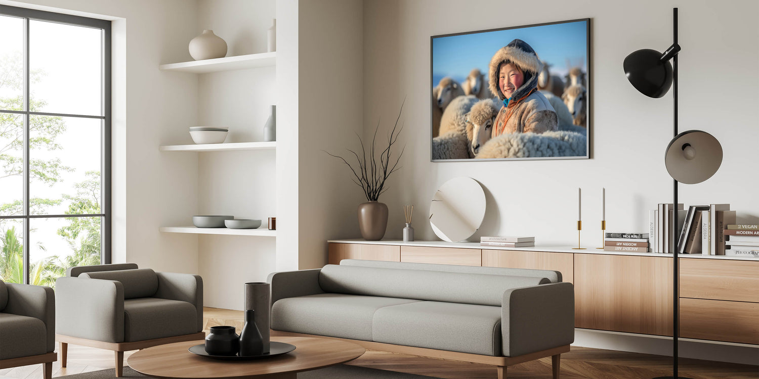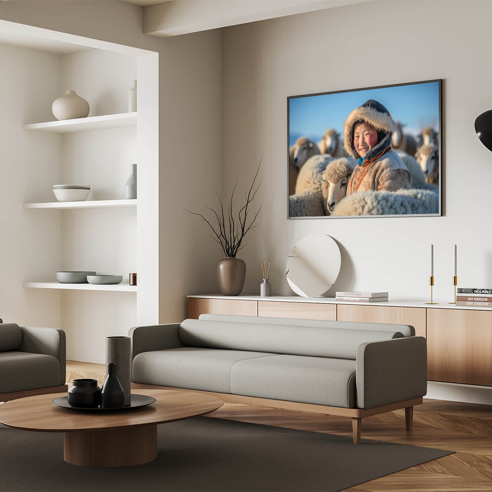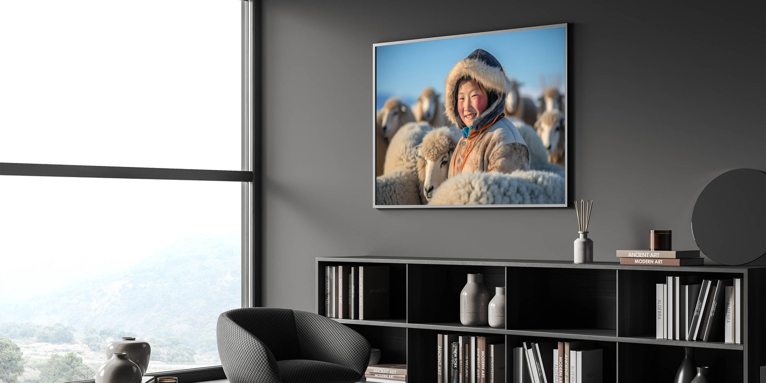 Celebrate the warmth and joy of nomadic life with this beautiful artwork featuring a smiling Mongolian child surrounded by sheep. The soft glow of the winter sun highlights the child’s rosy cheeks, while the fluffy sheep add to the sense of coziness and community. This heartwarming scene captures the essence of Mongolian nomadic culture, where humans and animals coexist in harmony amidst the cold landscapes. It’s a perfect piece for anyone who appreciates the simplicity and beauty of life in rural Mongolia.