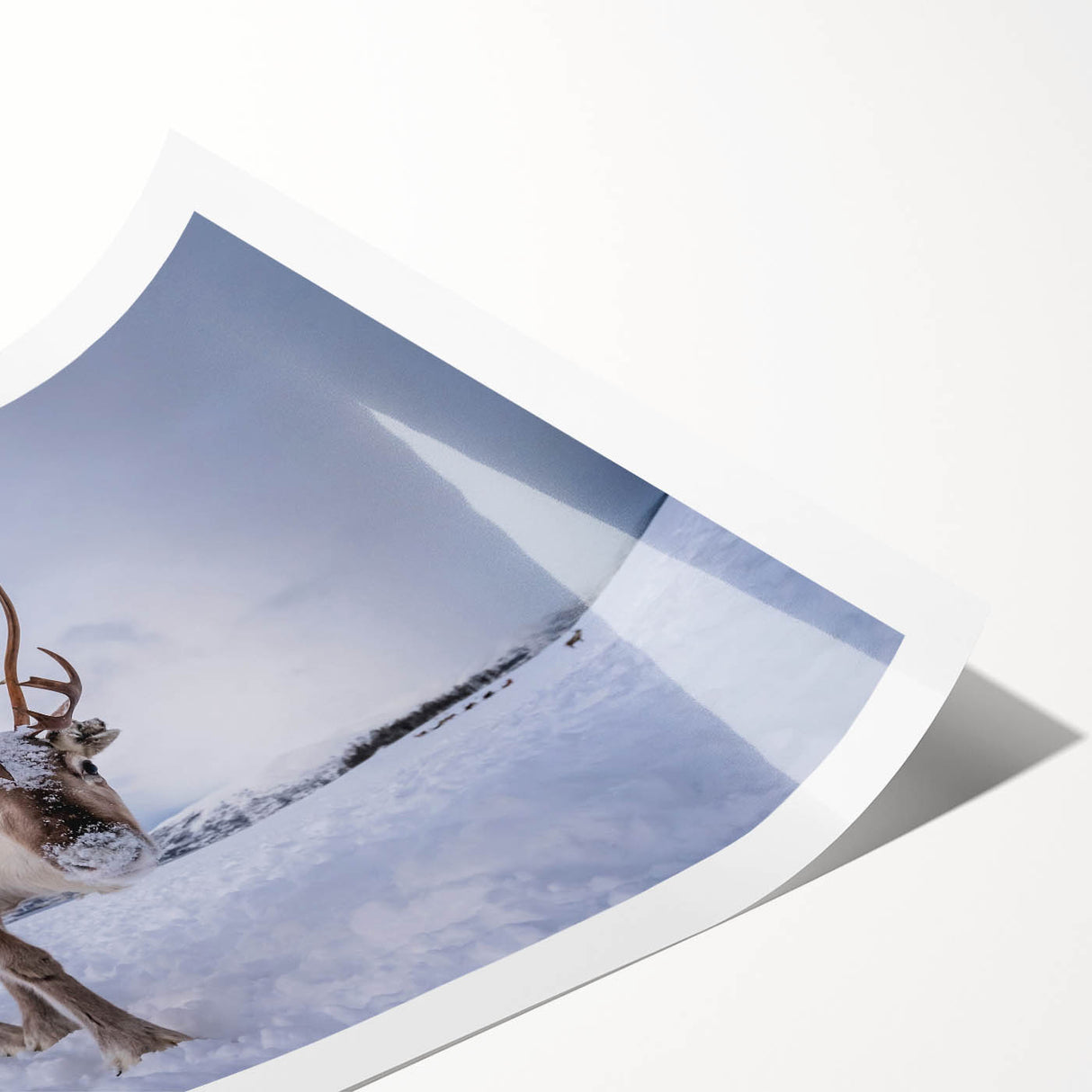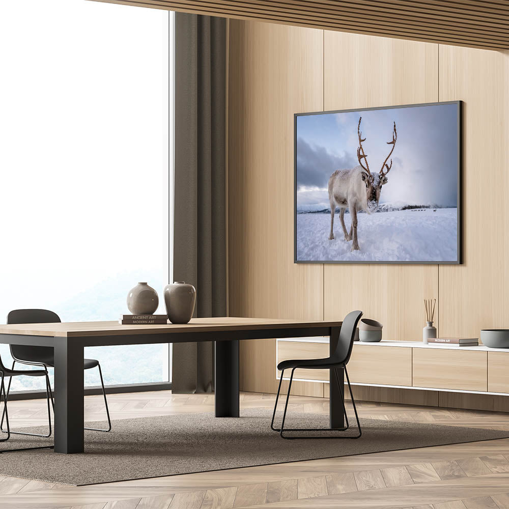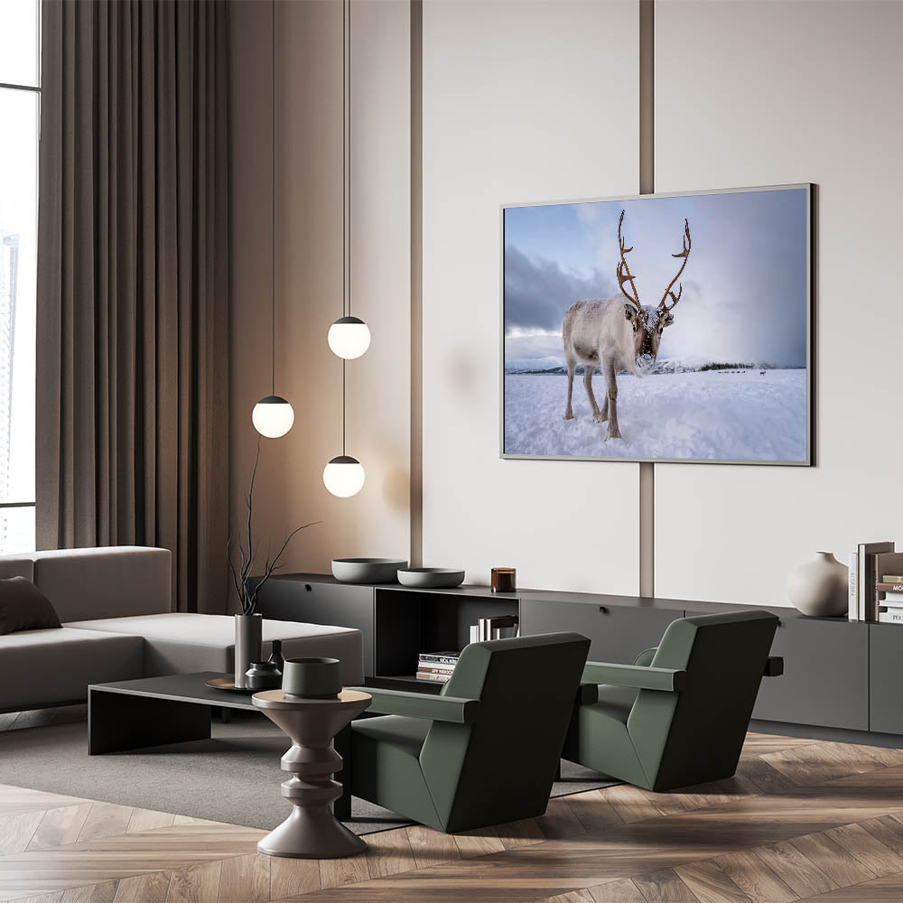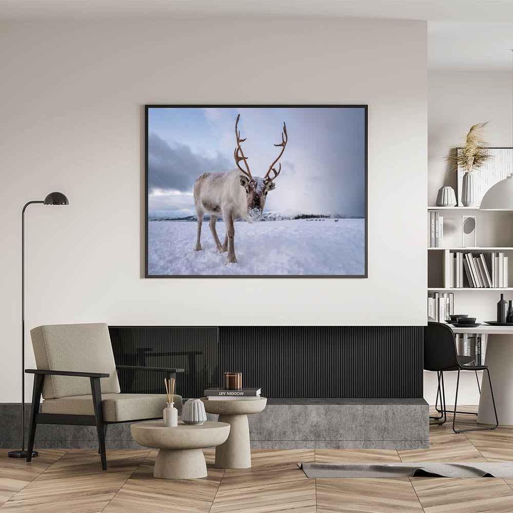 Bring the charm of Finland's winter wilderness into your home with this stunning reindeer wall art. This Finland scenery captures the serene beauty of a snow-covered landscape, highlighted by a majestic reindeer, showcasing the untouched nature of the Nordic region. Ideal for nature lovers, wildlife enthusiasts, and those who appreciate Scandinavian décor.