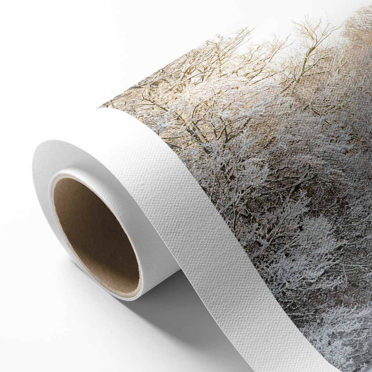 This serene Nordic nature painting captures the peaceful beauty of a winter forest blanketed in snow. The intricate details of the snow-covered trees create a calm and tranquil scene, making this piece a perfect fit for Scandinavian decor. The soft golden light illuminating the snowy landscape brings a warm touch to the cool tones of winter, making it a versatile addition to any space.