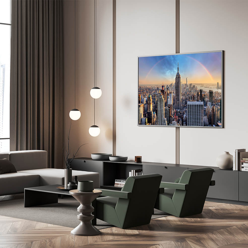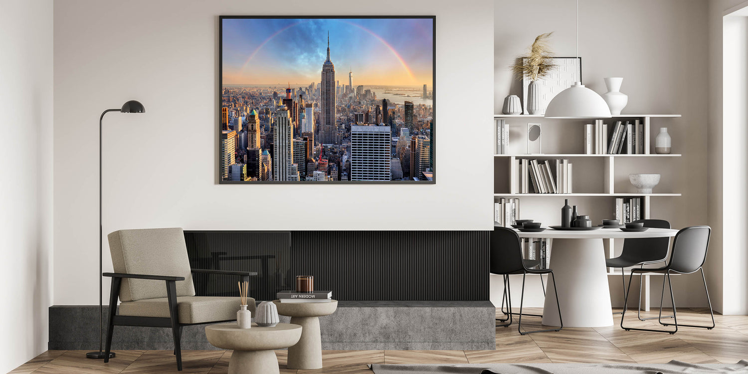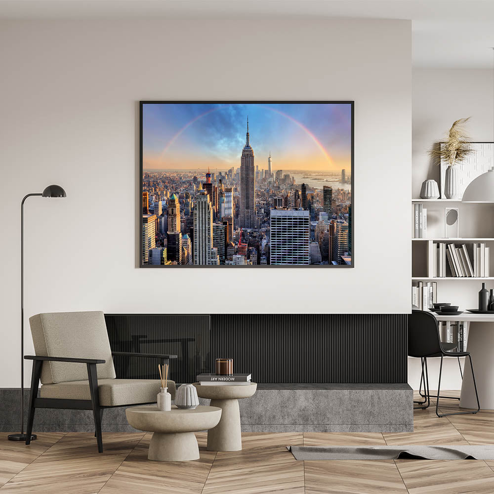 Capture the essence of New York City with this breathtaking skyline wall art, perfect for adding a touch of urban sophistication to your home or office. Featuring the iconic Empire State Building under a stunning rainbow arch, this artwork highlights the vibrant and dynamic beauty of NYC. The intricate details and vibrant colors make this piece a must-have for any modern interior.