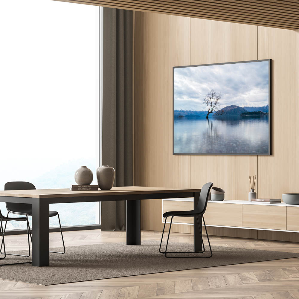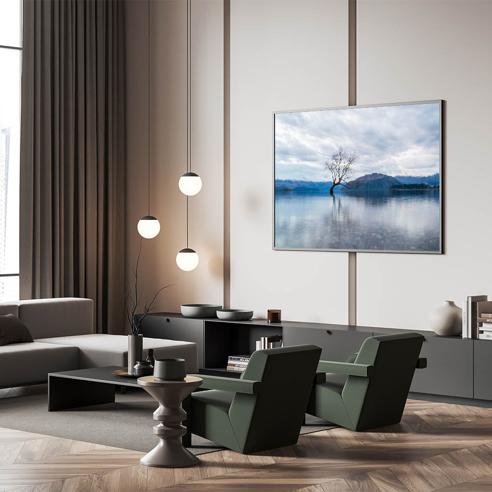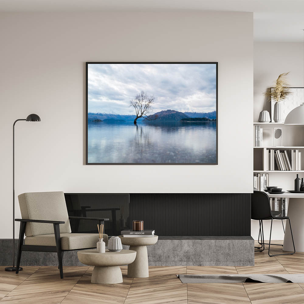 Embrace the quiet beauty of Lake Wanaka with this stunning Otago wall art featuring the iconic Wanaka tree. This peaceful scene showcases the solitary tree standing in the calm waters, backed by the misty mountains and a soft, moody sky. The delicate balance between light and shadow gives this photograph a timeless feel, perfect for those who appreciate subtle yet impactful New Zealand scenery.