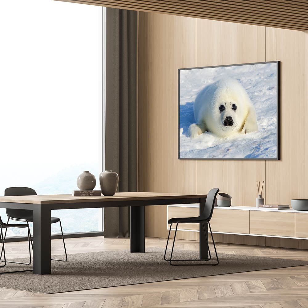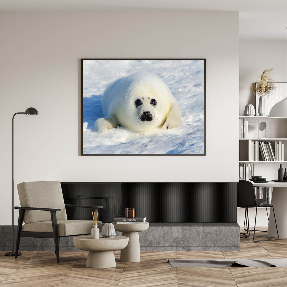 Bring the heartwarming beauty of the Arctic to your space with this captivating wall art featuring an adorable baby seal resting on the snowy ice. The soft, fluffy texture of the seal’s fur and its innocent gaze make this artwork a perfect addition for those who love wildlife and nature’s pure beauty. Set against the pristine white backdrop of the Arctic, this piece captures the essence of the polar region in a delicate and serene manner.