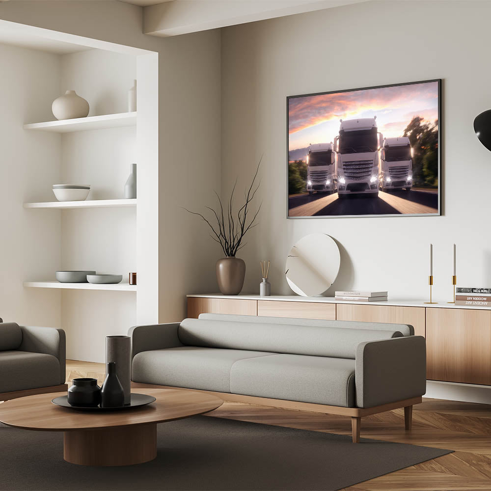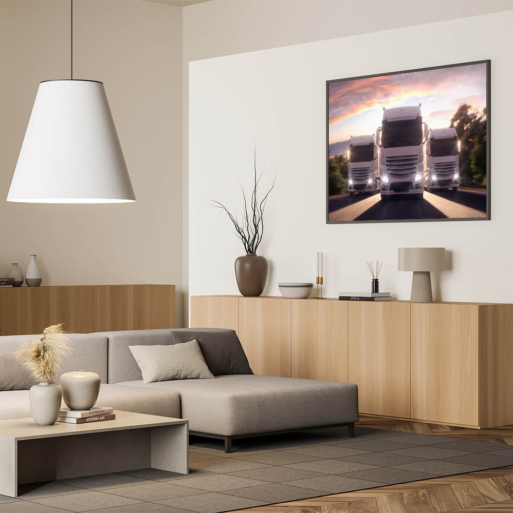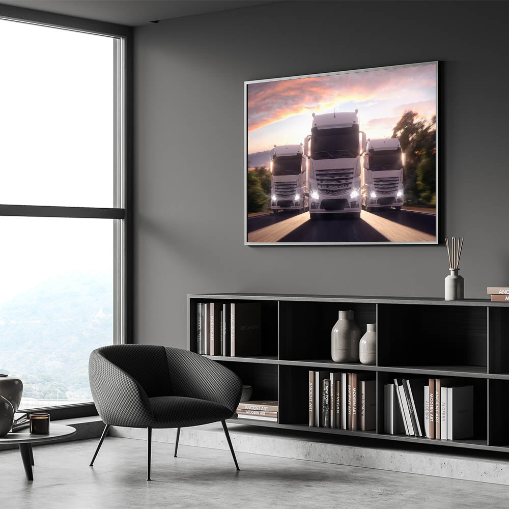 Command attention with this striking wall art featuring a powerful trio of trucks dominating the highway. The dynamic composition of these sleek, modern trucks, captured from a front-facing angle, exudes strength and precision. The soft, warm hues of the sunrise contrast beautifully with the cool, metallic tones of the trucks, creating a balanced and visually captivating piece that’s perfect for any modern space.
