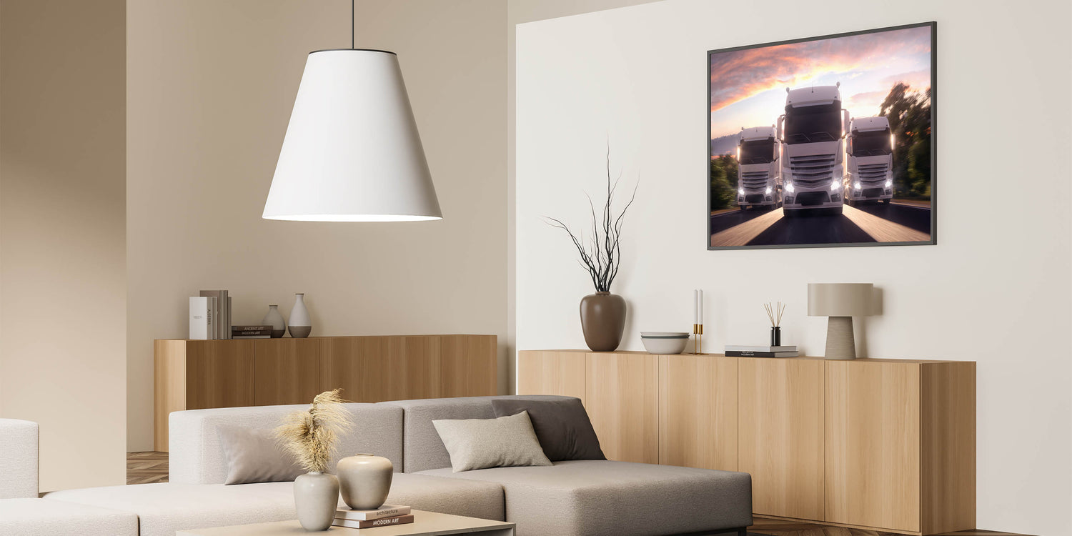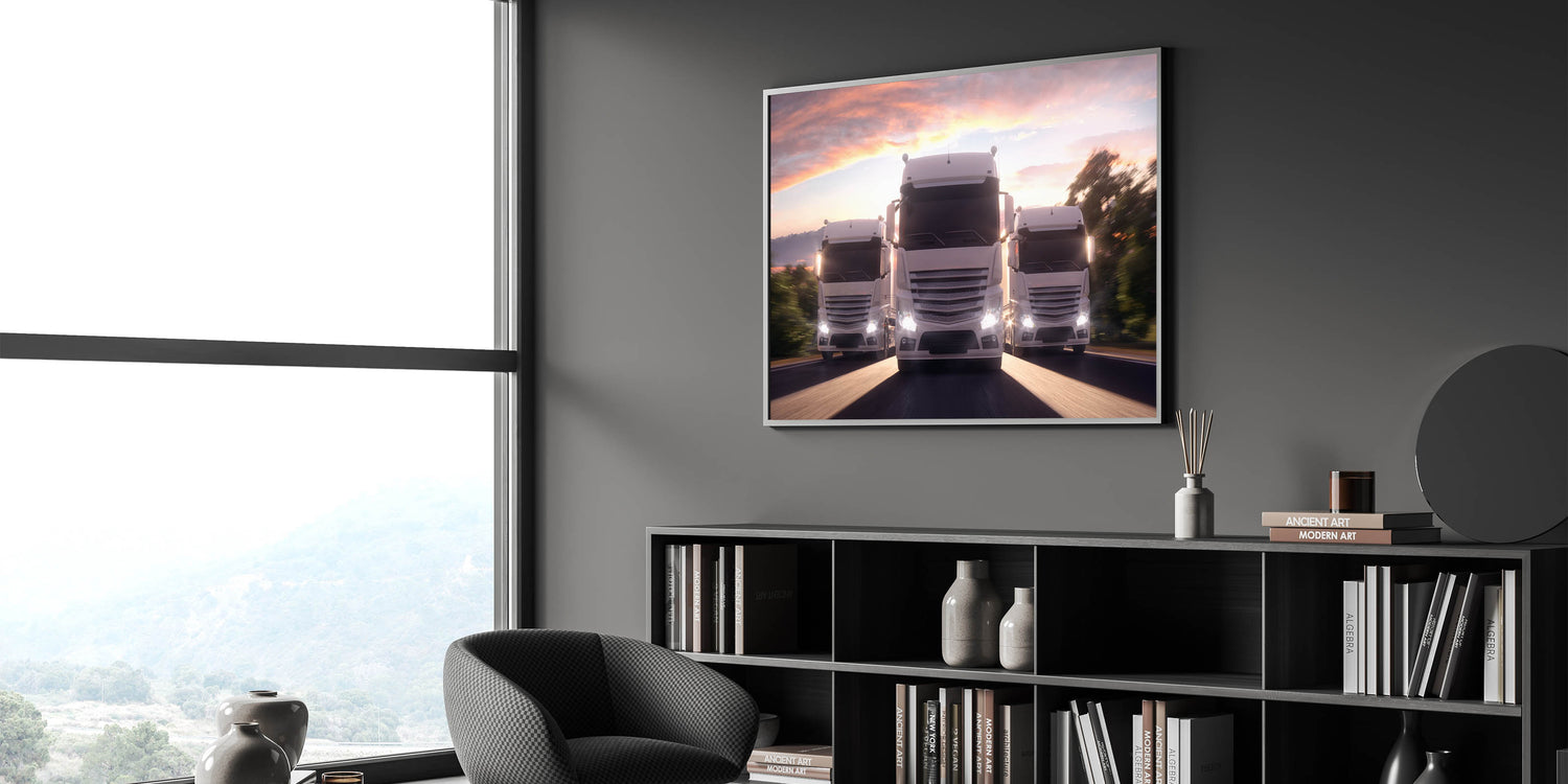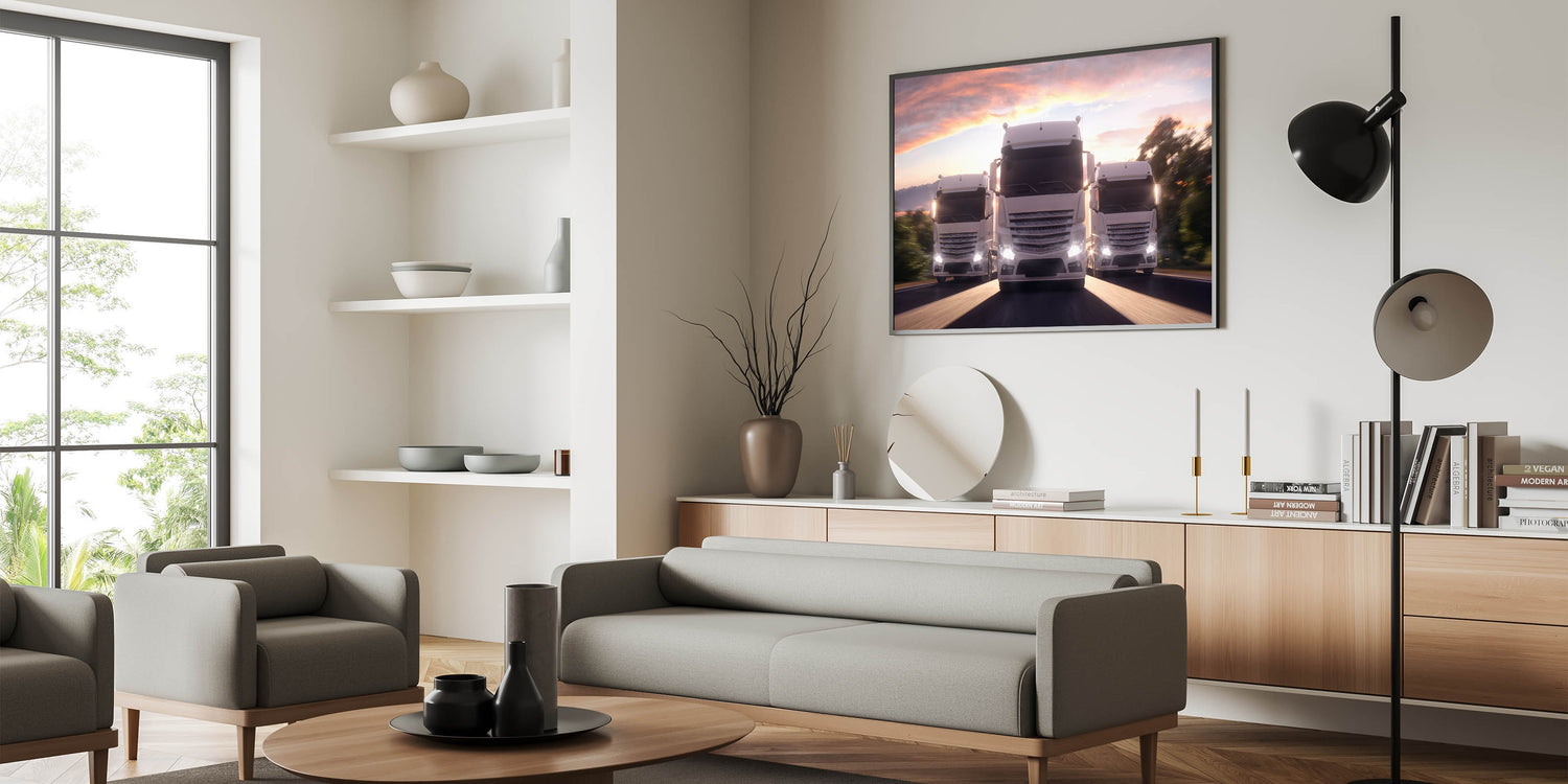 Command attention with this striking wall art featuring a powerful trio of trucks dominating the highway. The dynamic composition of these sleek, modern trucks, captured from a front-facing angle, exudes strength and precision. The soft, warm hues of the sunrise contrast beautifully with the cool, metallic tones of the trucks, creating a balanced and visually captivating piece that’s perfect for any modern space.