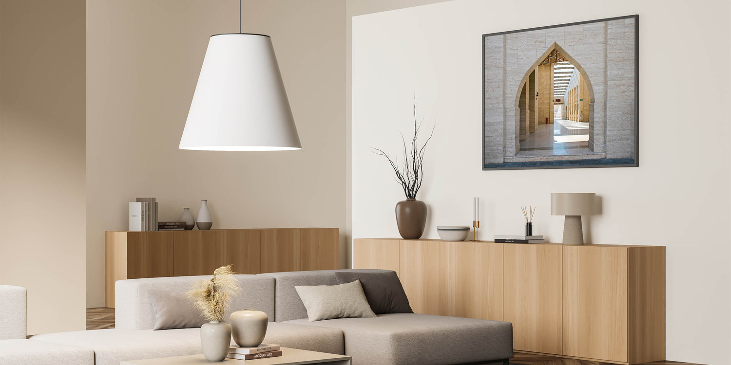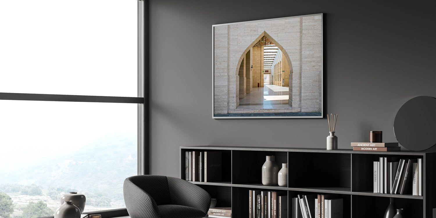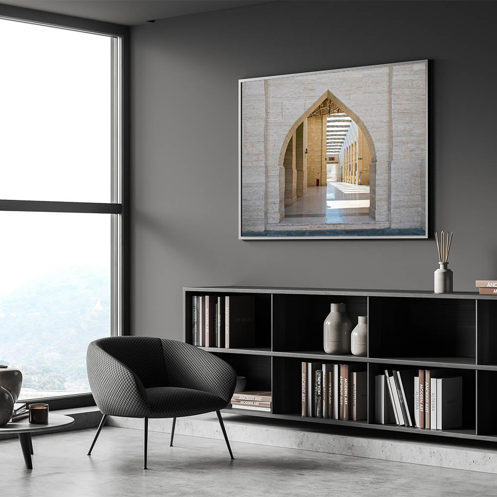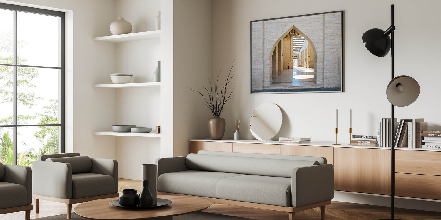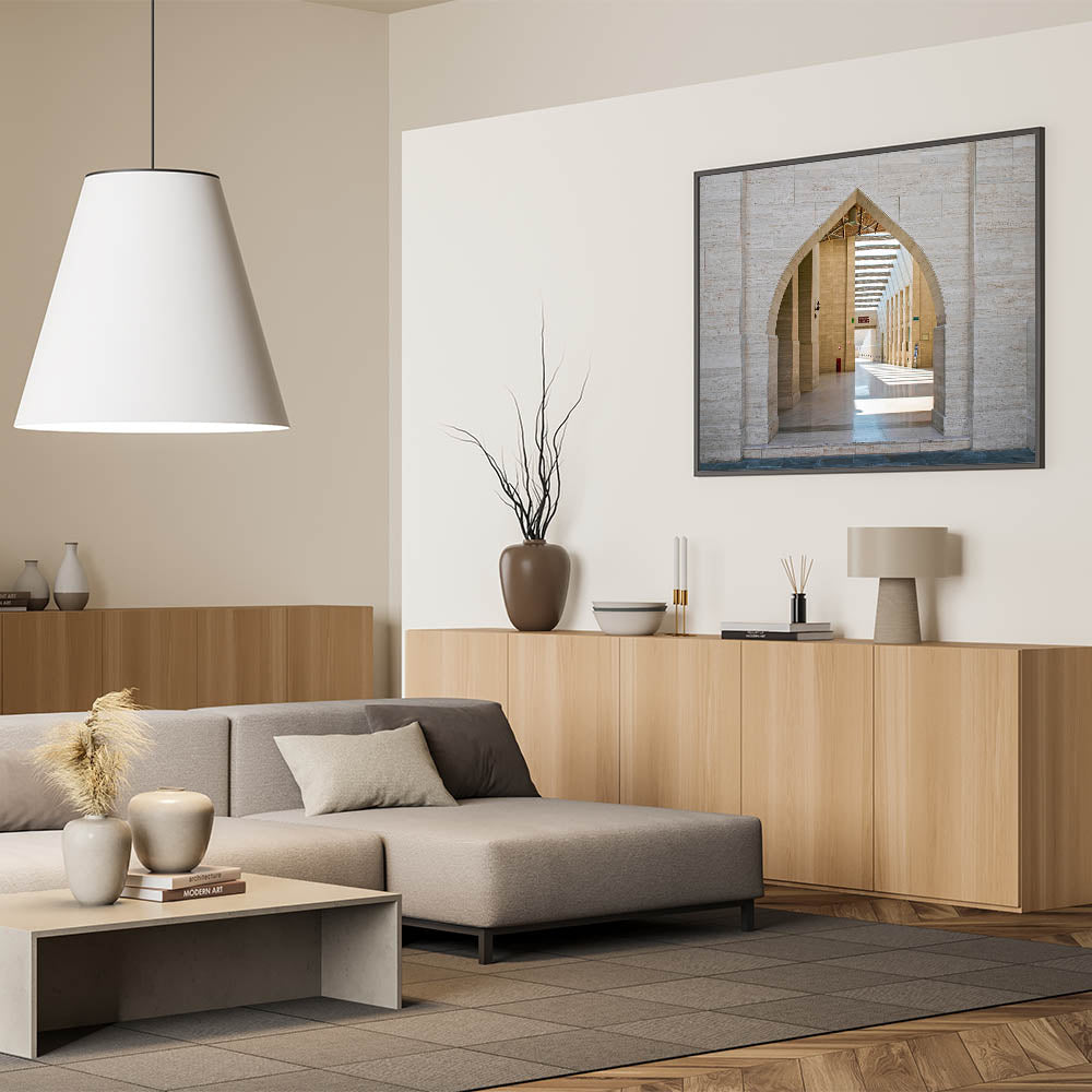 - Elegant Design: The print highlights the juxtaposition of modern design with traditional motifs through its focus on the arches.