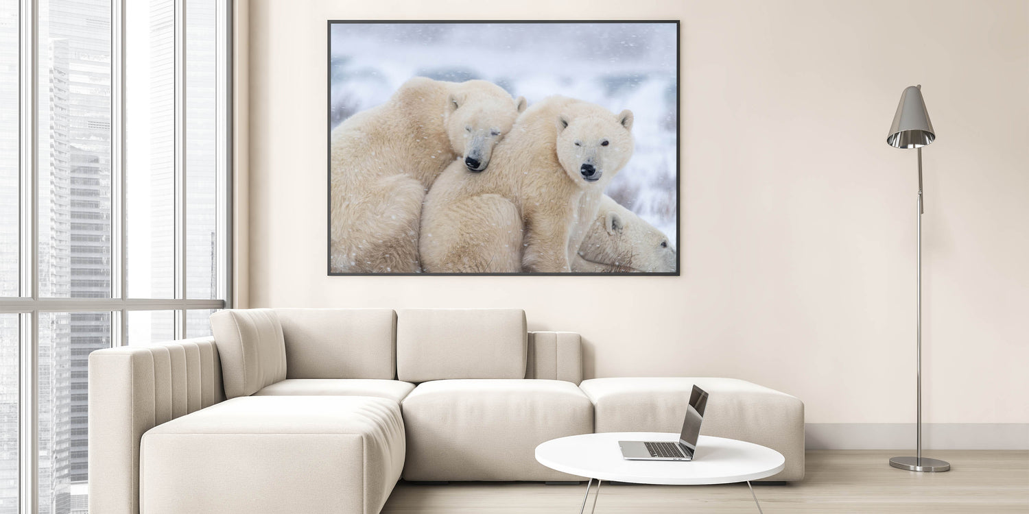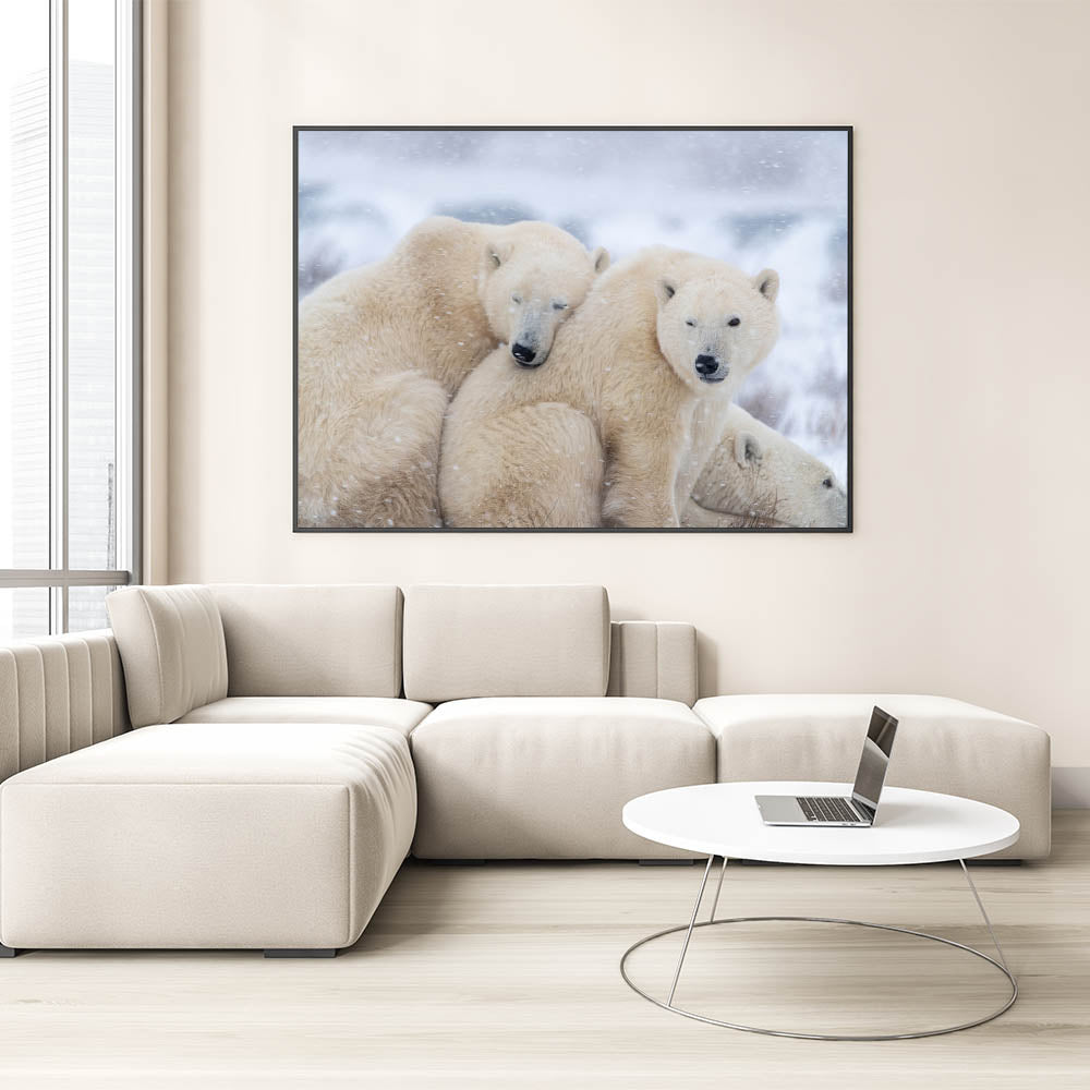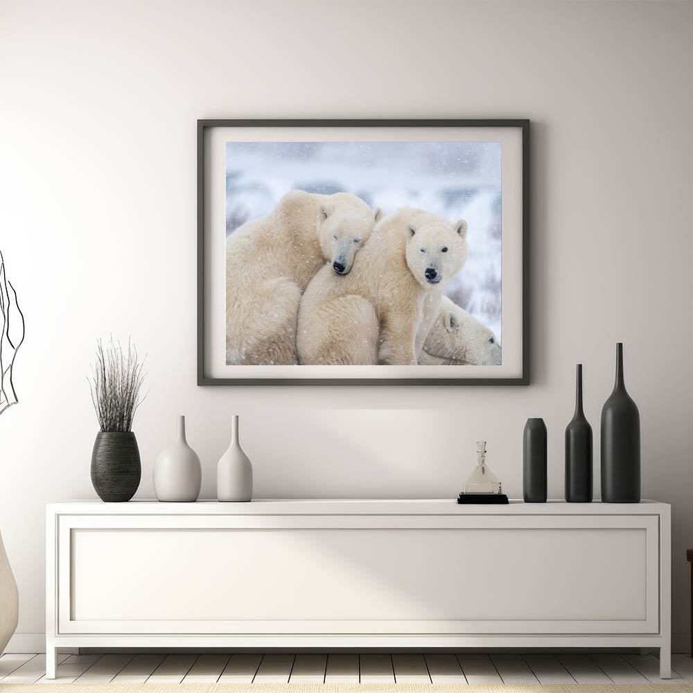 Capture the heartwarming beauty of Manitoba’s wildlife with this stunning wall art featuring a group of resting polar bears amidst a peaceful snowfall. The cozy image of the bears snuggling together brings out the gentle side of these majestic creatures, perfectly showcasing the beauty of Manitoba’s arctic landscapes. The soft snow falling around them adds a serene and peaceful touch, making this artwork ideal for those who love wildlife and winter scenes.