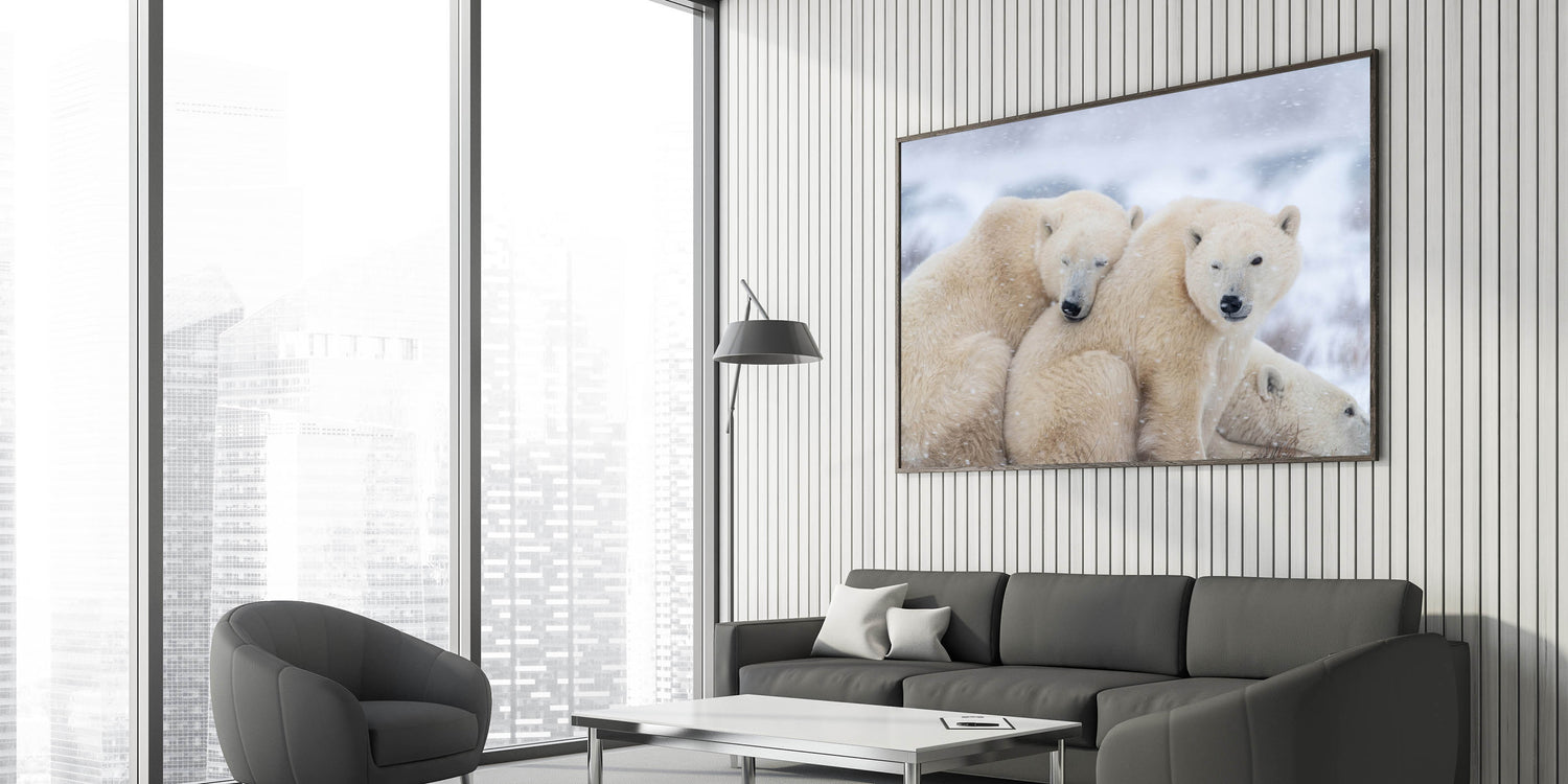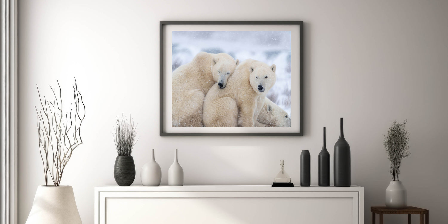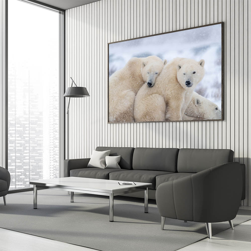 Capture the heartwarming beauty of Manitoba’s wildlife with this stunning wall art featuring a group of resting polar bears amidst a peaceful snowfall. The cozy image of the bears snuggling together brings out the gentle side of these majestic creatures, perfectly showcasing the beauty of Manitoba’s arctic landscapes. The soft snow falling around them adds a serene and peaceful touch, making this artwork ideal for those who love wildlife and winter scenes.