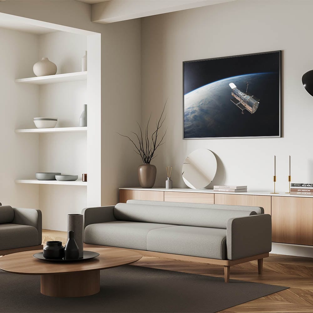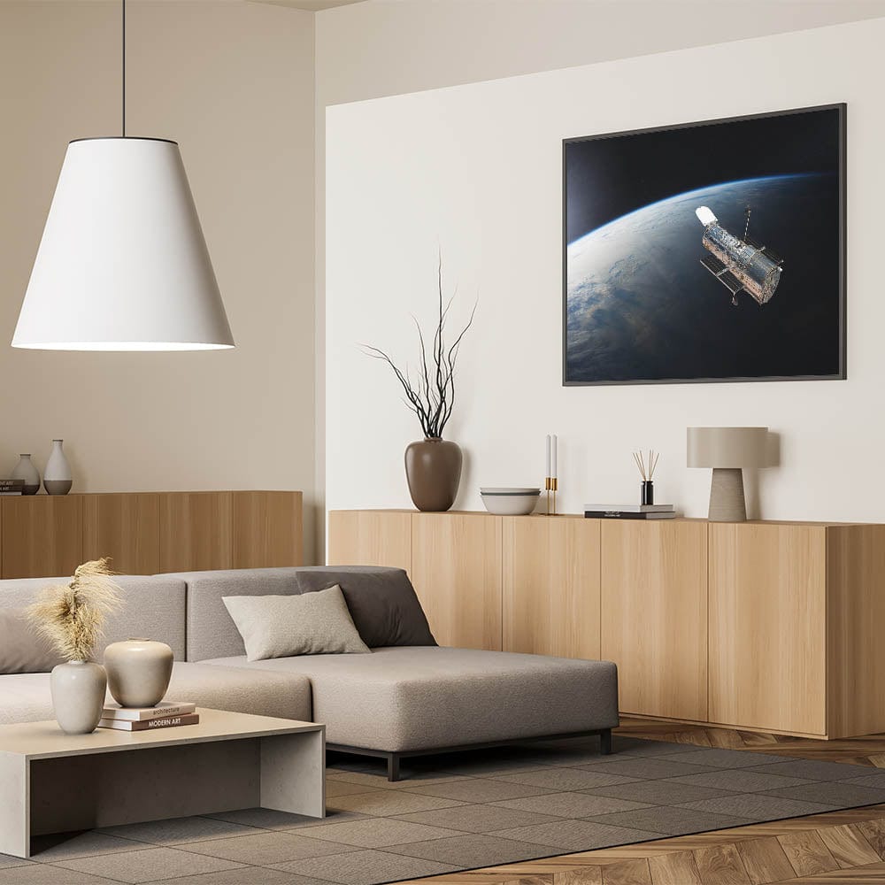 Capture the serenity of space with this stunning planet wall art featuring a satellite orbiting high above the Earth. The sleek satellite floats effortlessly against the vast darkness of space, while the gentle curve of Earth adds a breathtaking contrast. This space-themed home decor piece is perfect for those who appreciate the beauty and mystery of the cosmos, bringing a sense of calm and wonder into your living space.