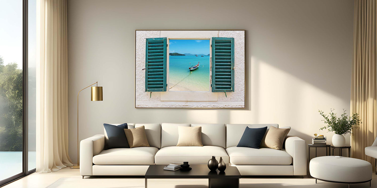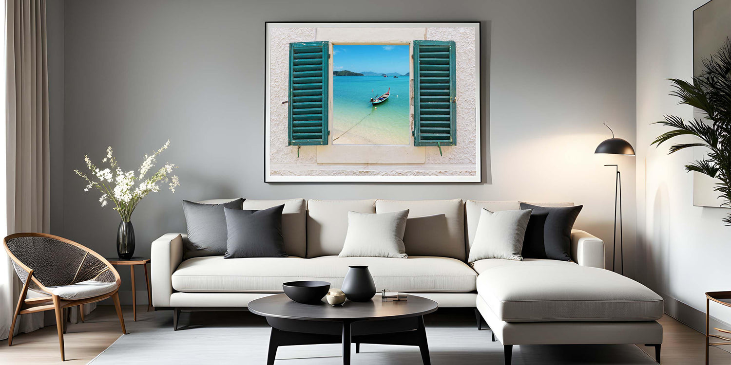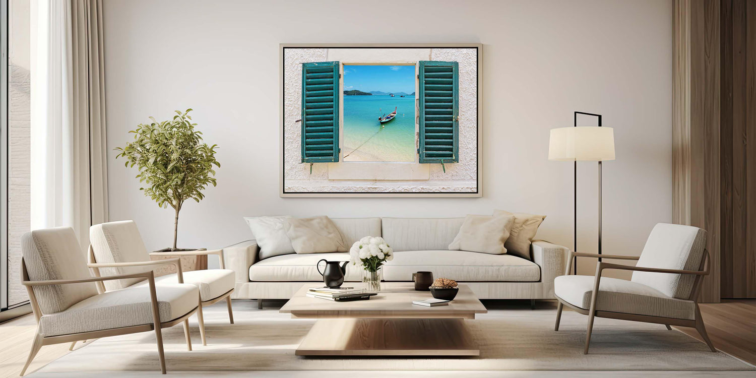 Transform your living space with this captivating Scenic Window Wall Art, showcasing a serene ocean view framed by a charming architectural window. The vibrant blue waters and picturesque boat invite you to escape into a world of tranquility every time you glance at this artwork. This piece is perfect for adding a touch of coastal elegance to any room, whether in your home or office.