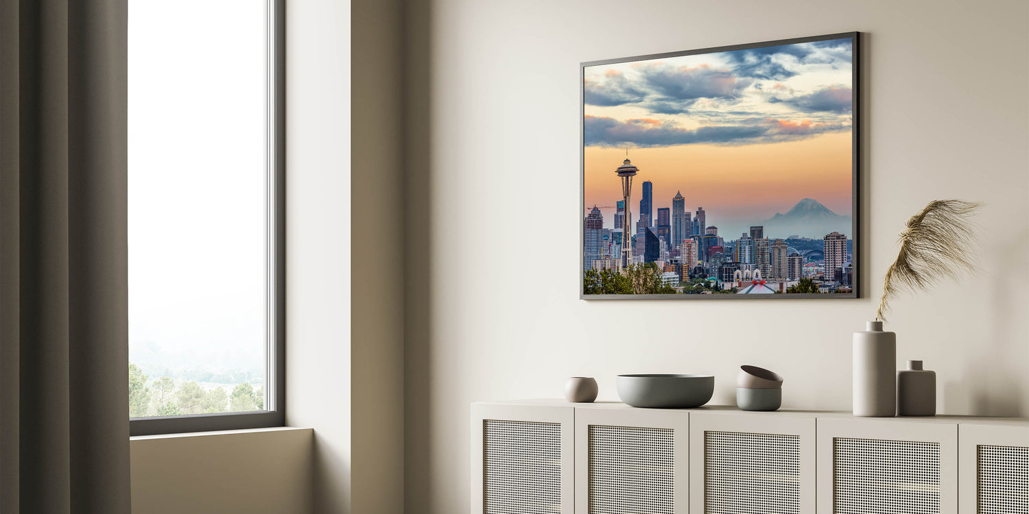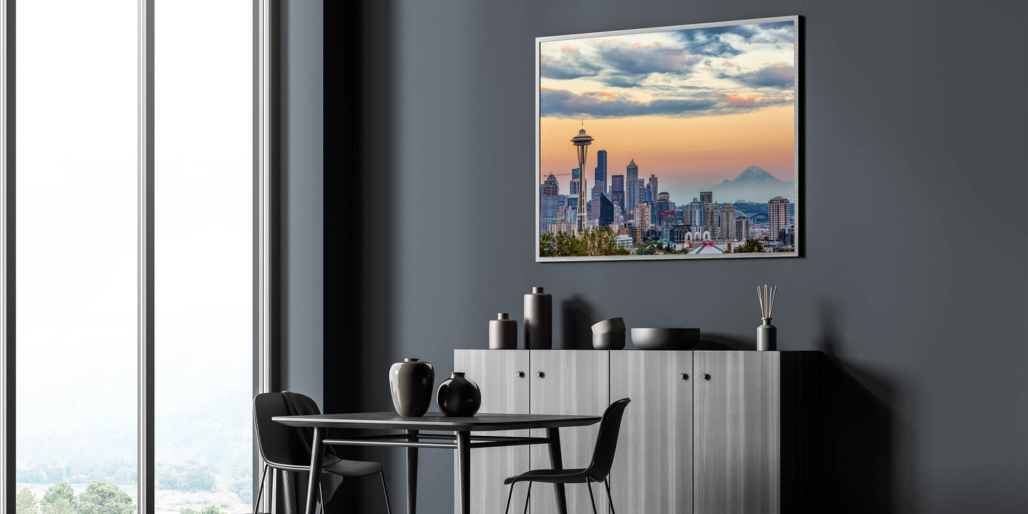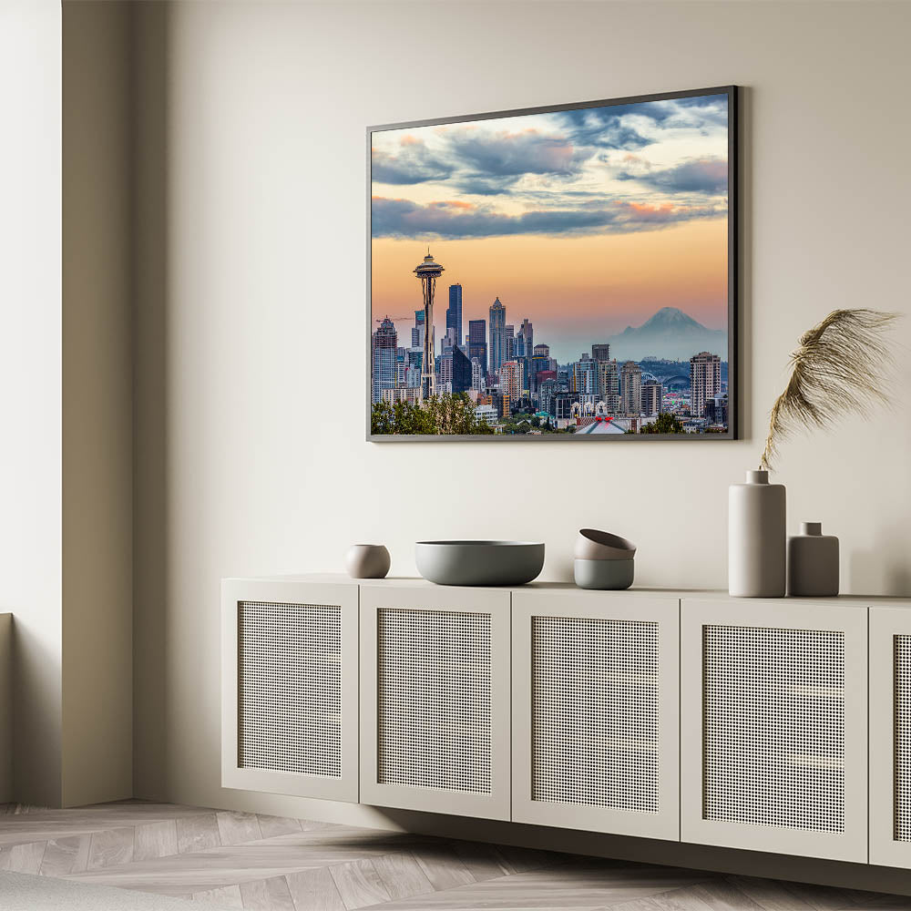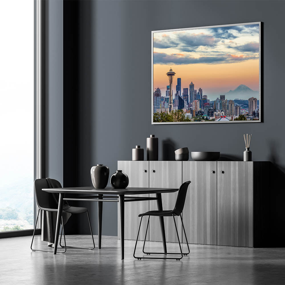 - High-quality Seattle cityscape art prints available in multiple sizes